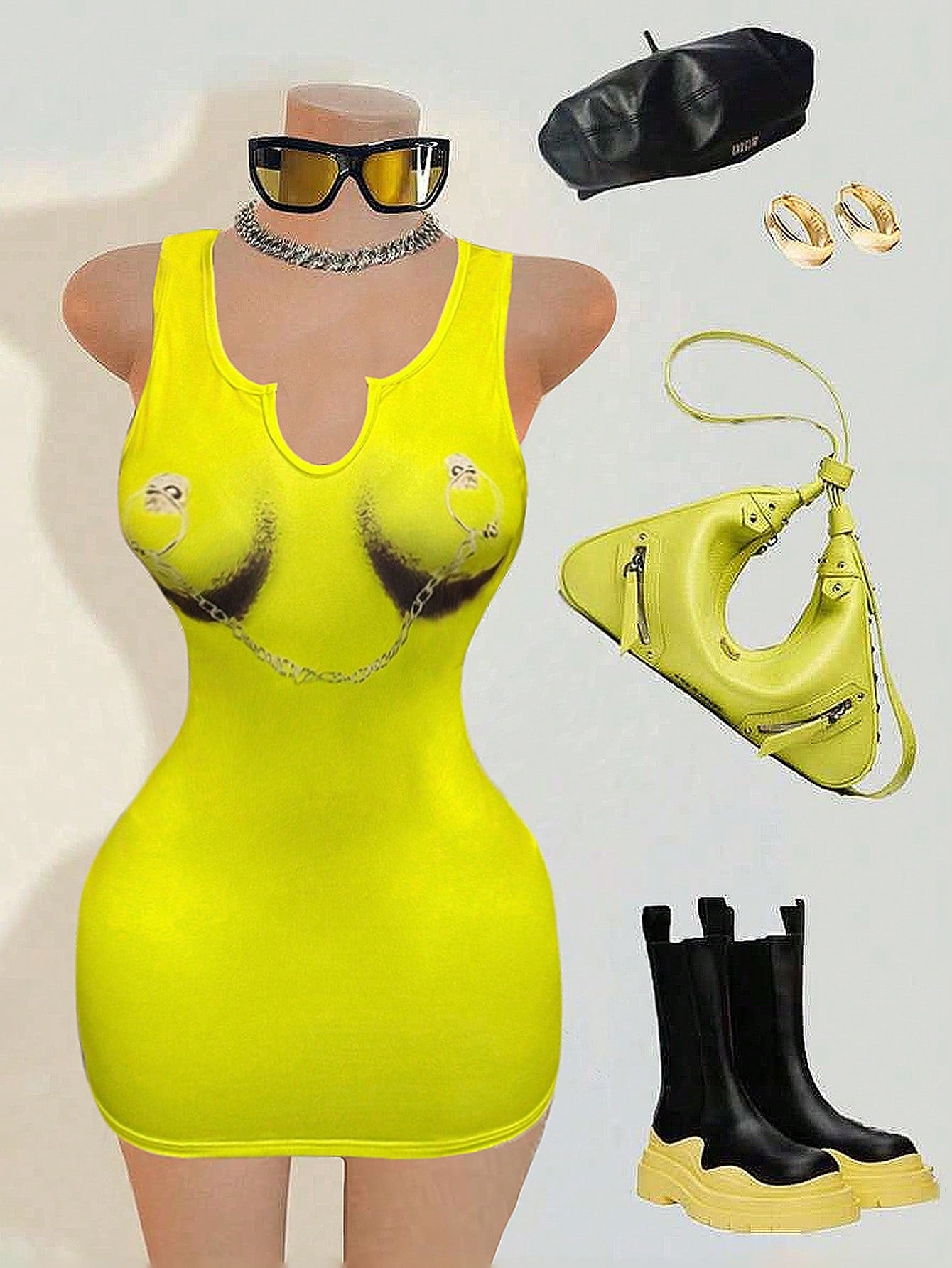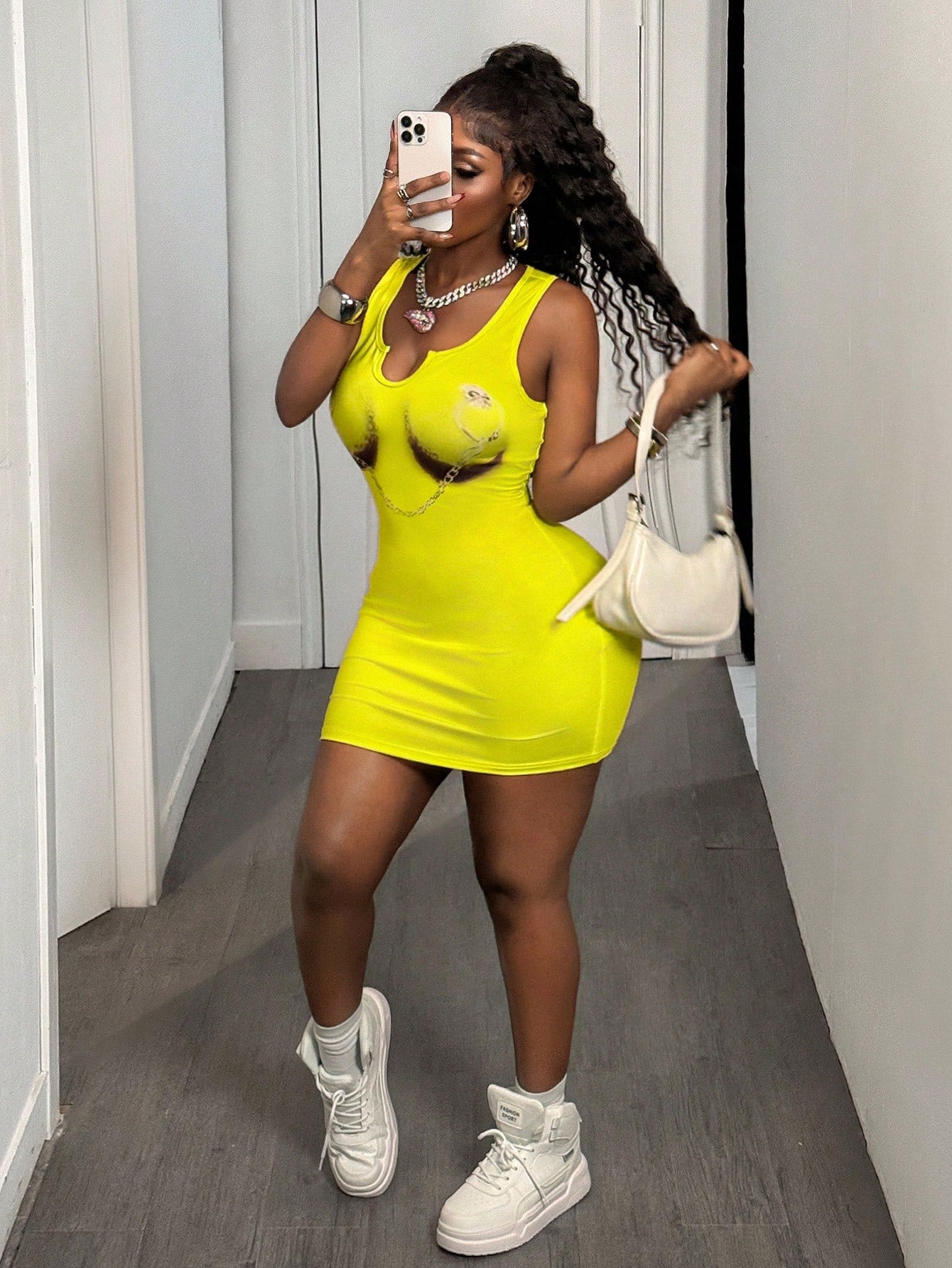 BamGleam BamGleamellow Sexy V-Neck Sleeveless Tank Top Fashion Casual Print Split Dress