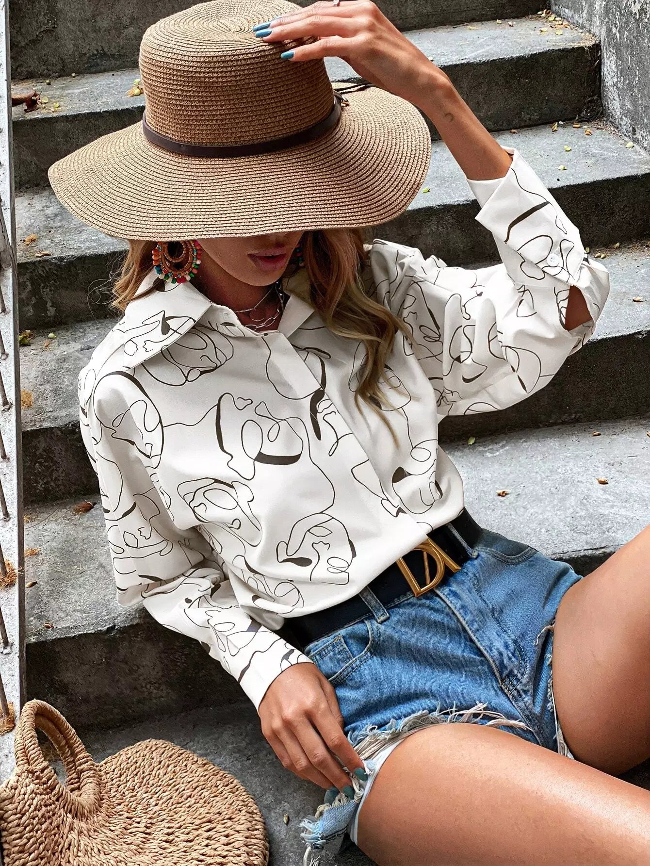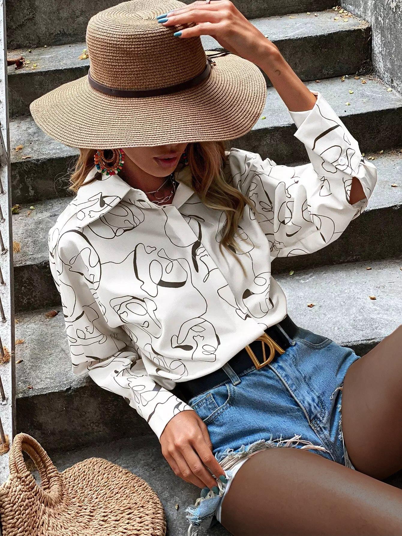 بلوزة بأكمام بطبعة على شكل باتوينغ بالكامل