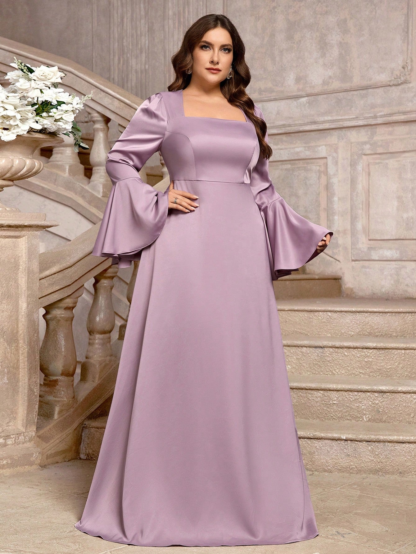 Belle Plus Size Taro Purple Elegant Square Neck Flared Sleeve Court Style Simple Bridesmaid Dresses