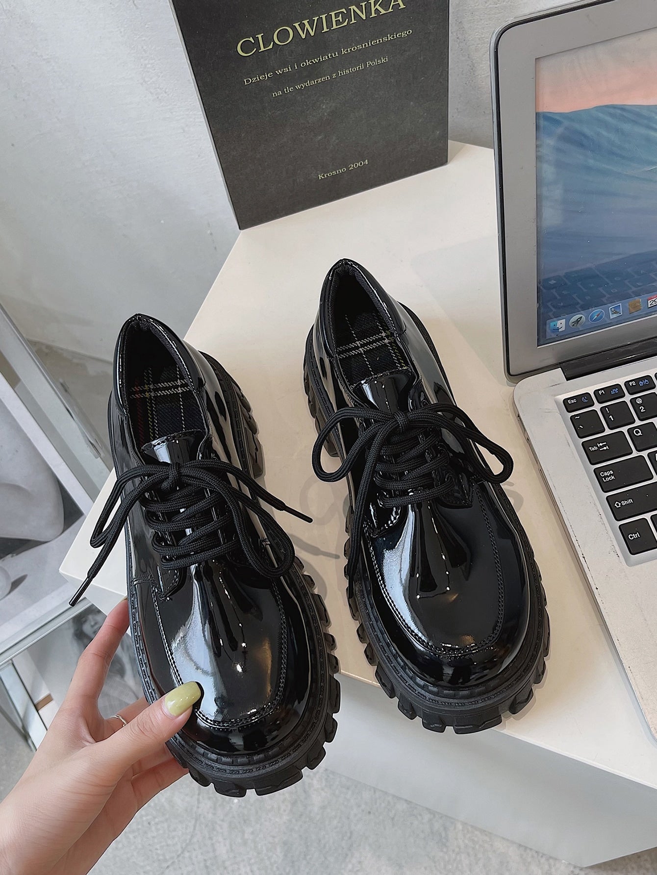 حذاء أوكسفورد أسود برباط وكعب سميك للنساء