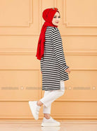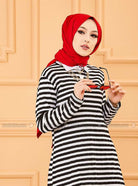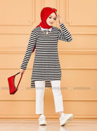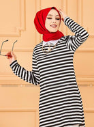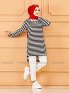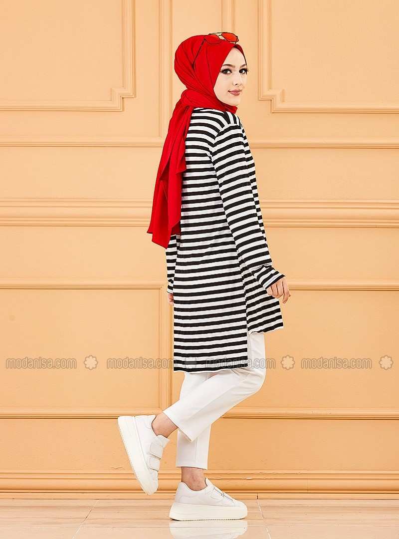 سترة سوداء مخططة برقبة دائرية