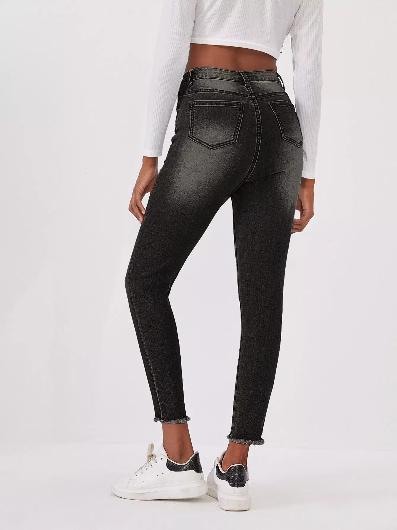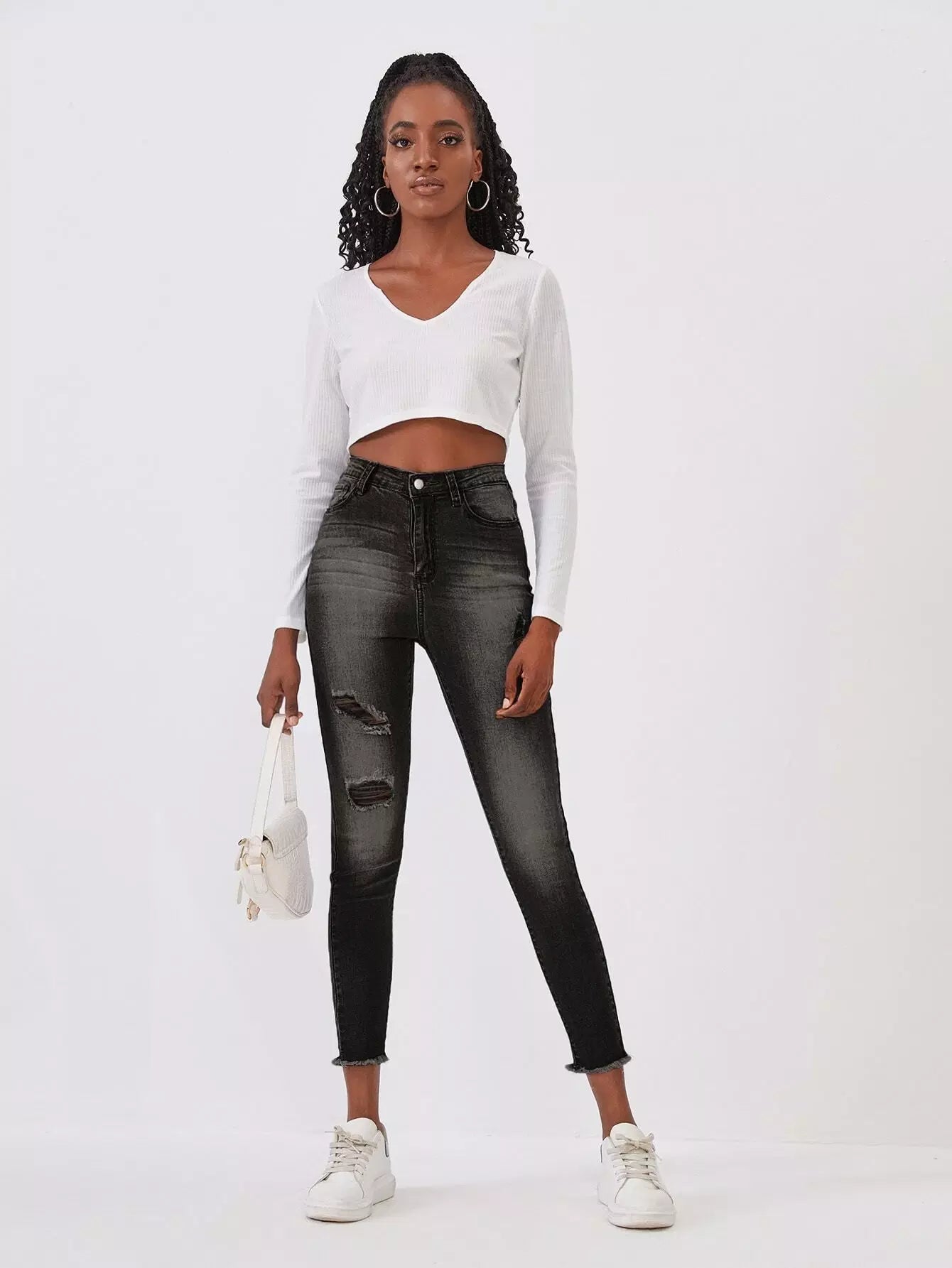 بنطلون جينز ممزق عالي التمدد بغسول مبيض