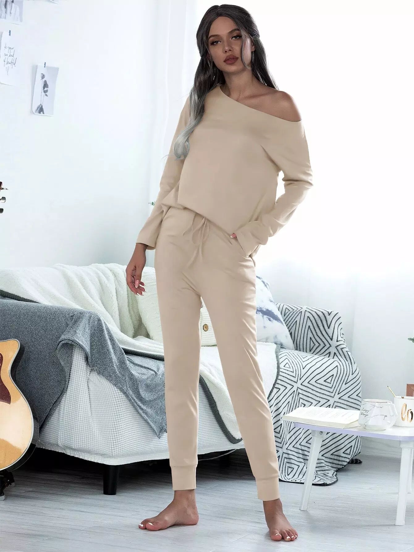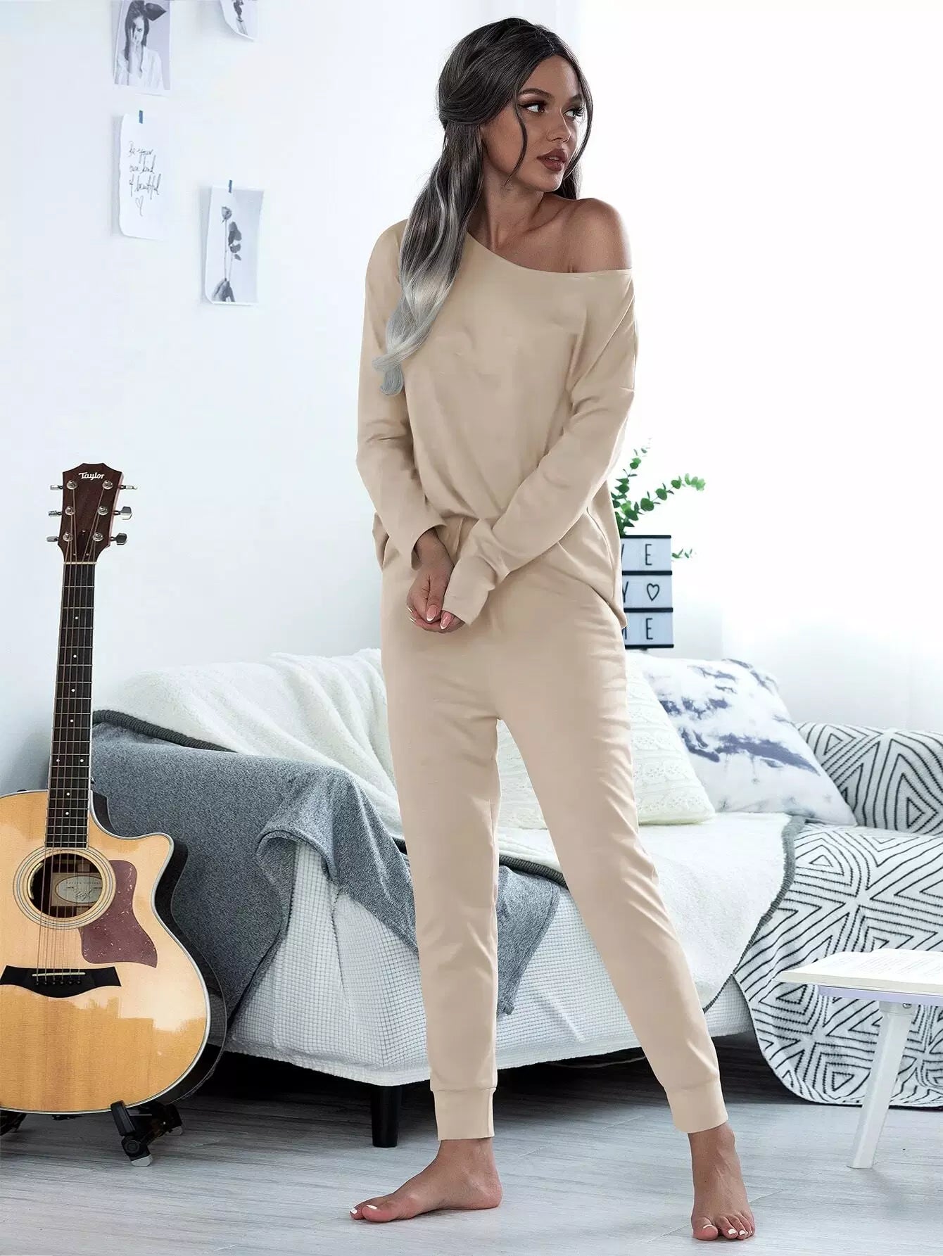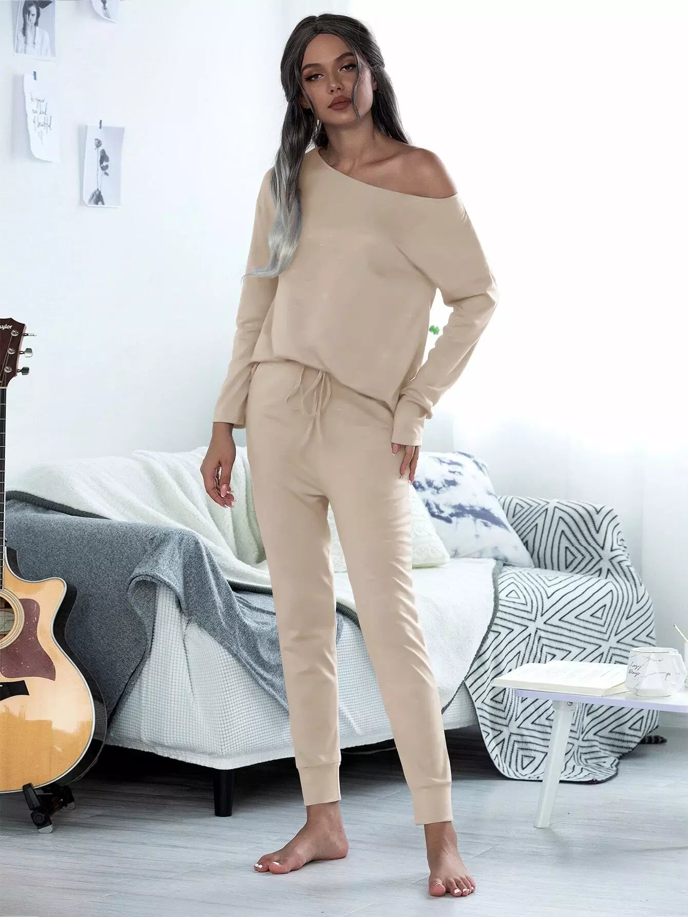 تي شيرت برقبة قارب برقبة قارب سادة منسدلة الكتفين وبنطال رياضي