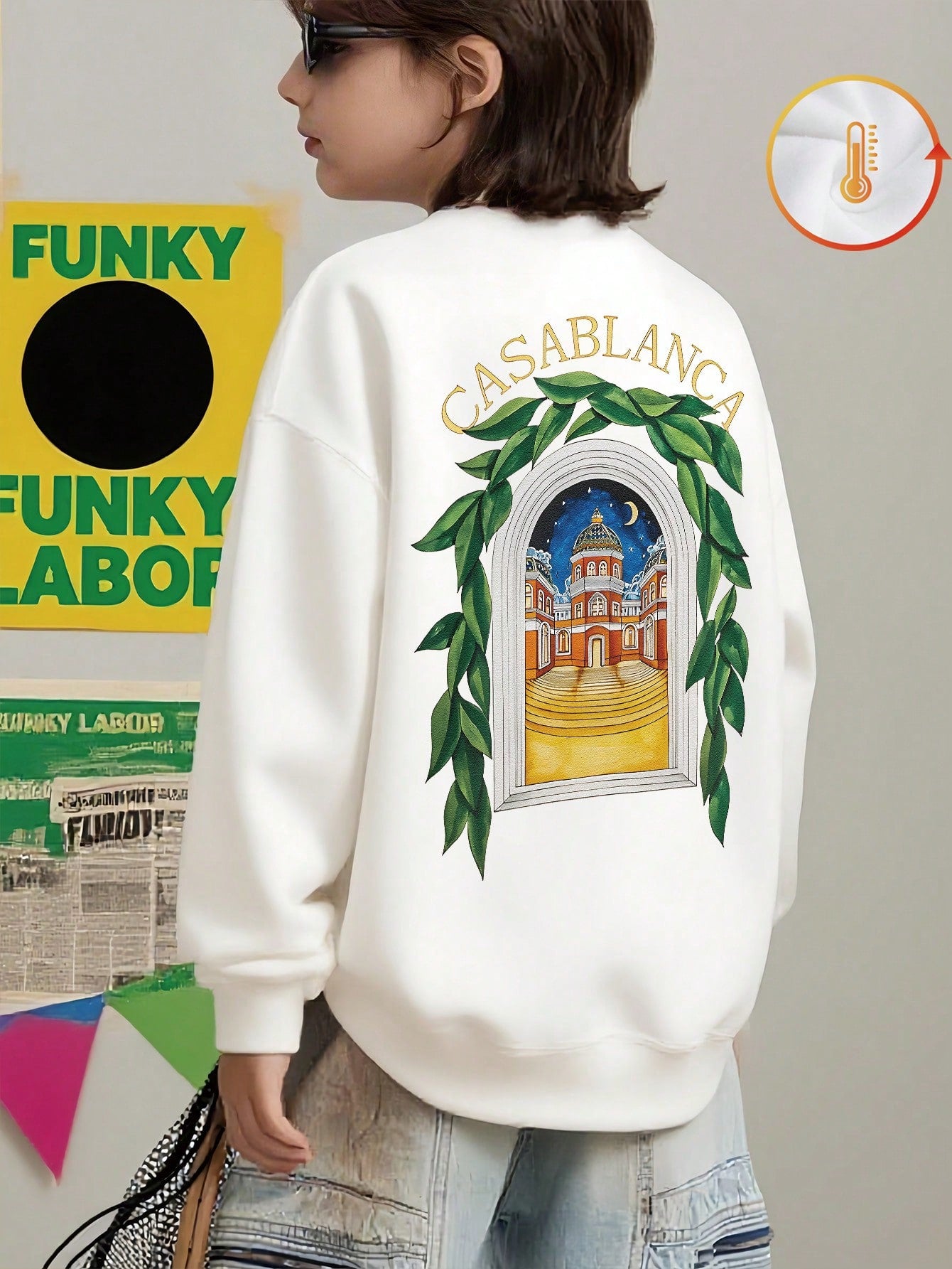 سويت شيرت قطني أبيض للأولاد بكتفين منسدلين - سويت شيرت بنقشة قلعة مضاءة بضوء القمر
