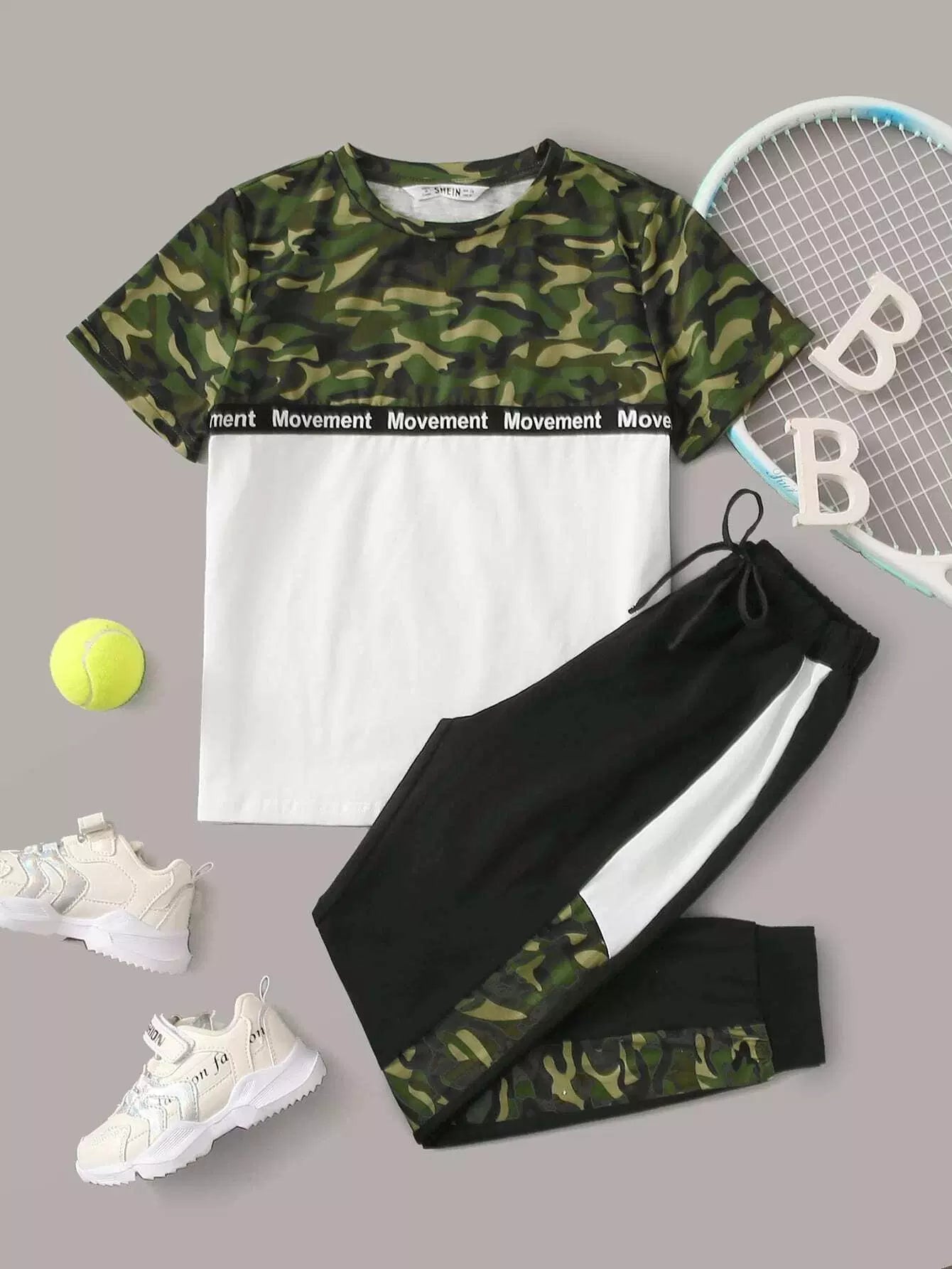 طقم تي شيرت وبنطلون رياضي بألوان مموهة وشريط حروف للأولاد