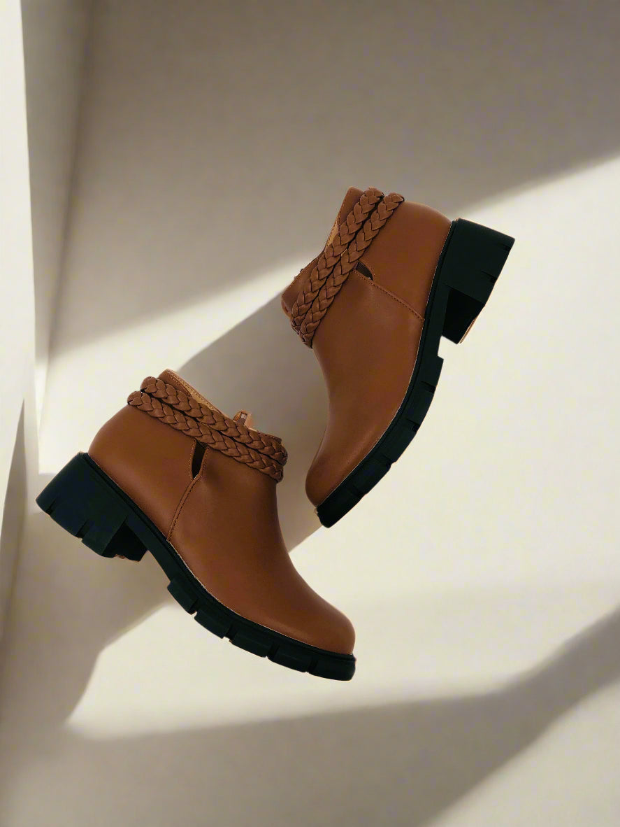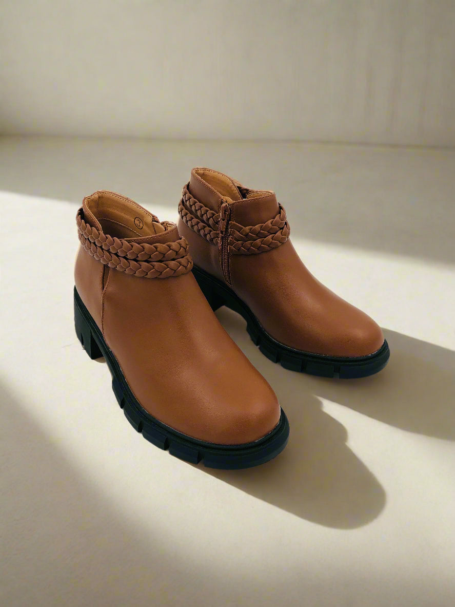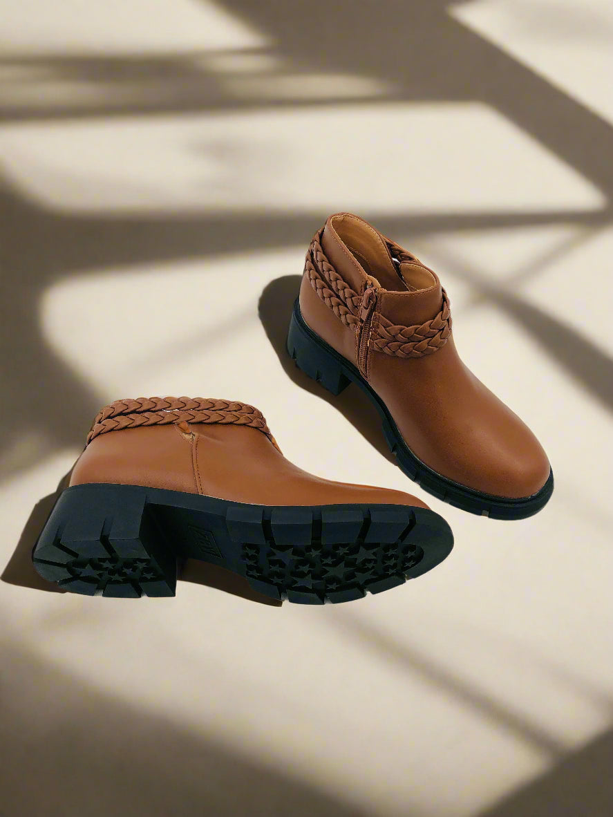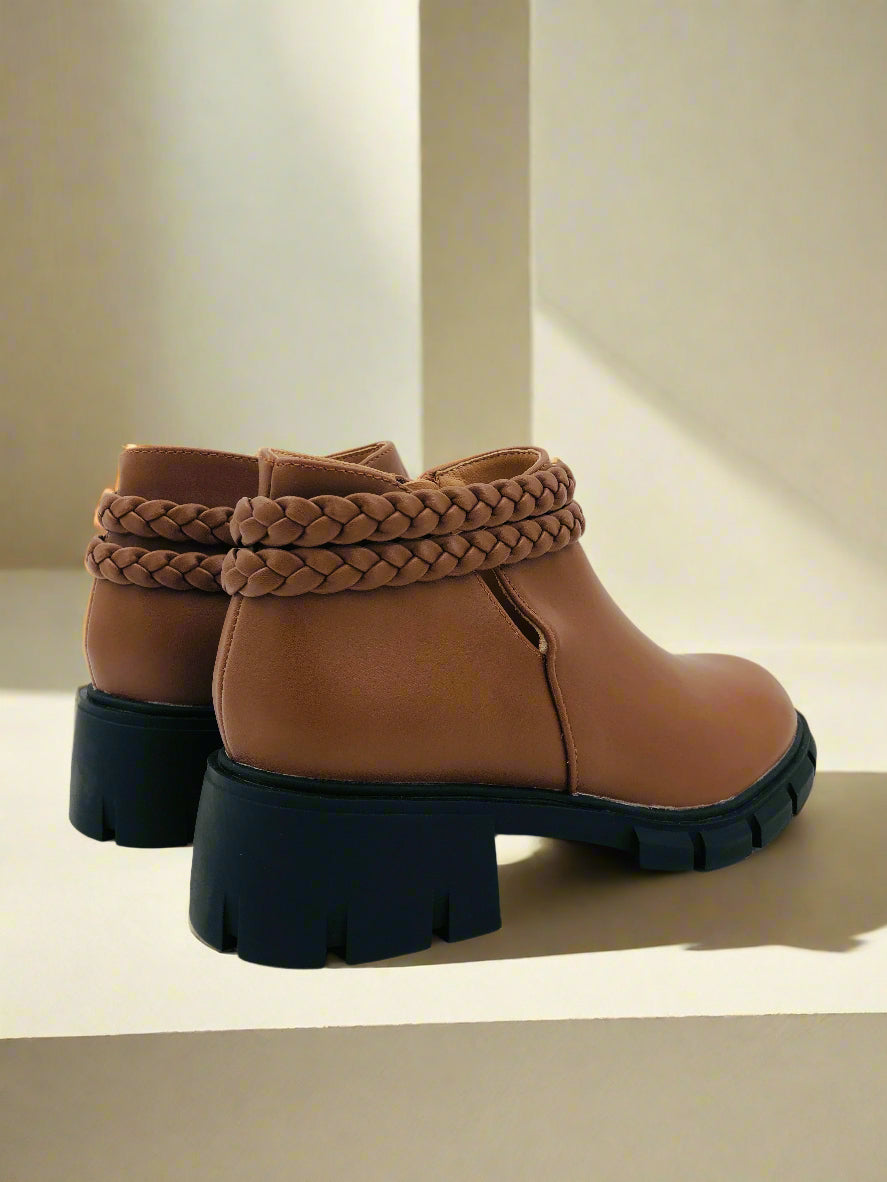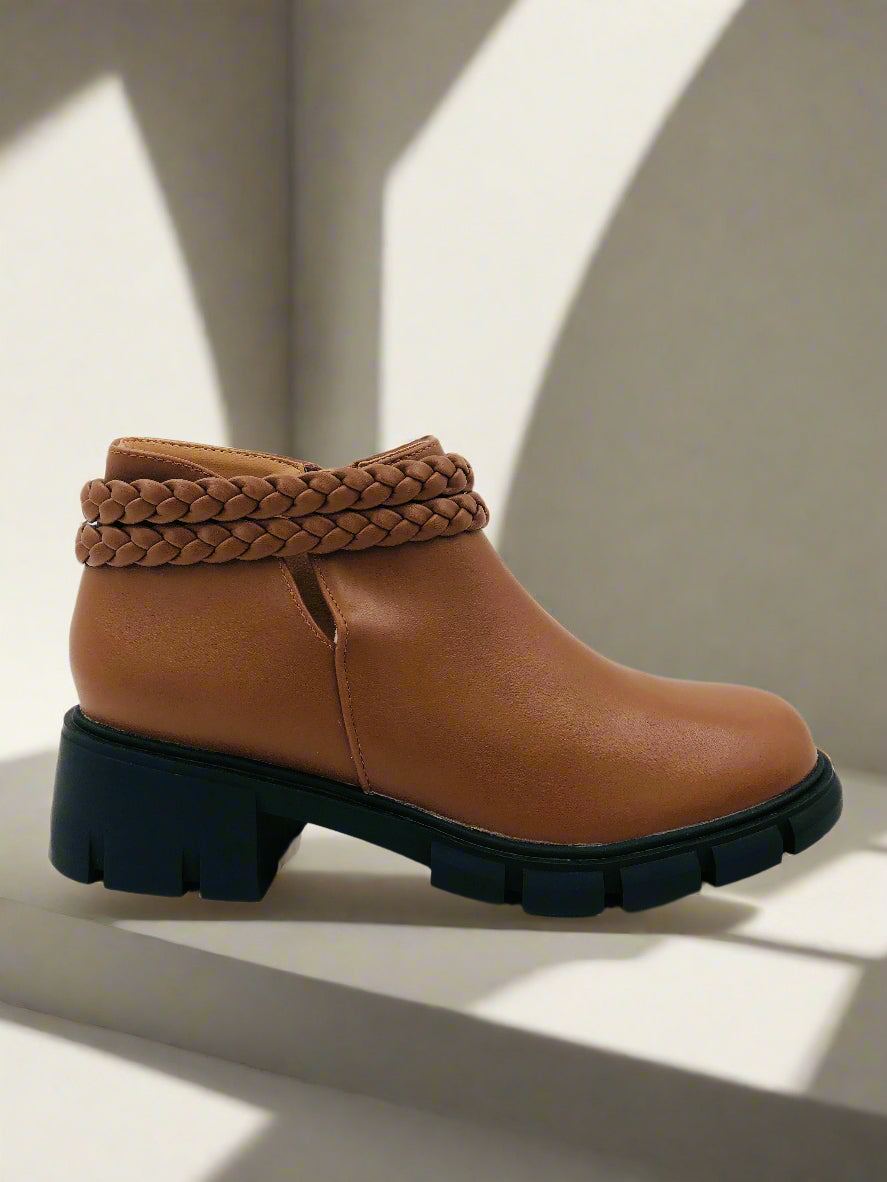 جزمة كاحل شتوية قصيرة بنية للبنات، مزودة بكعب منخفض ومقدمة مستديرة، سحاب جانبي، وتفاصيل ضفيرة.