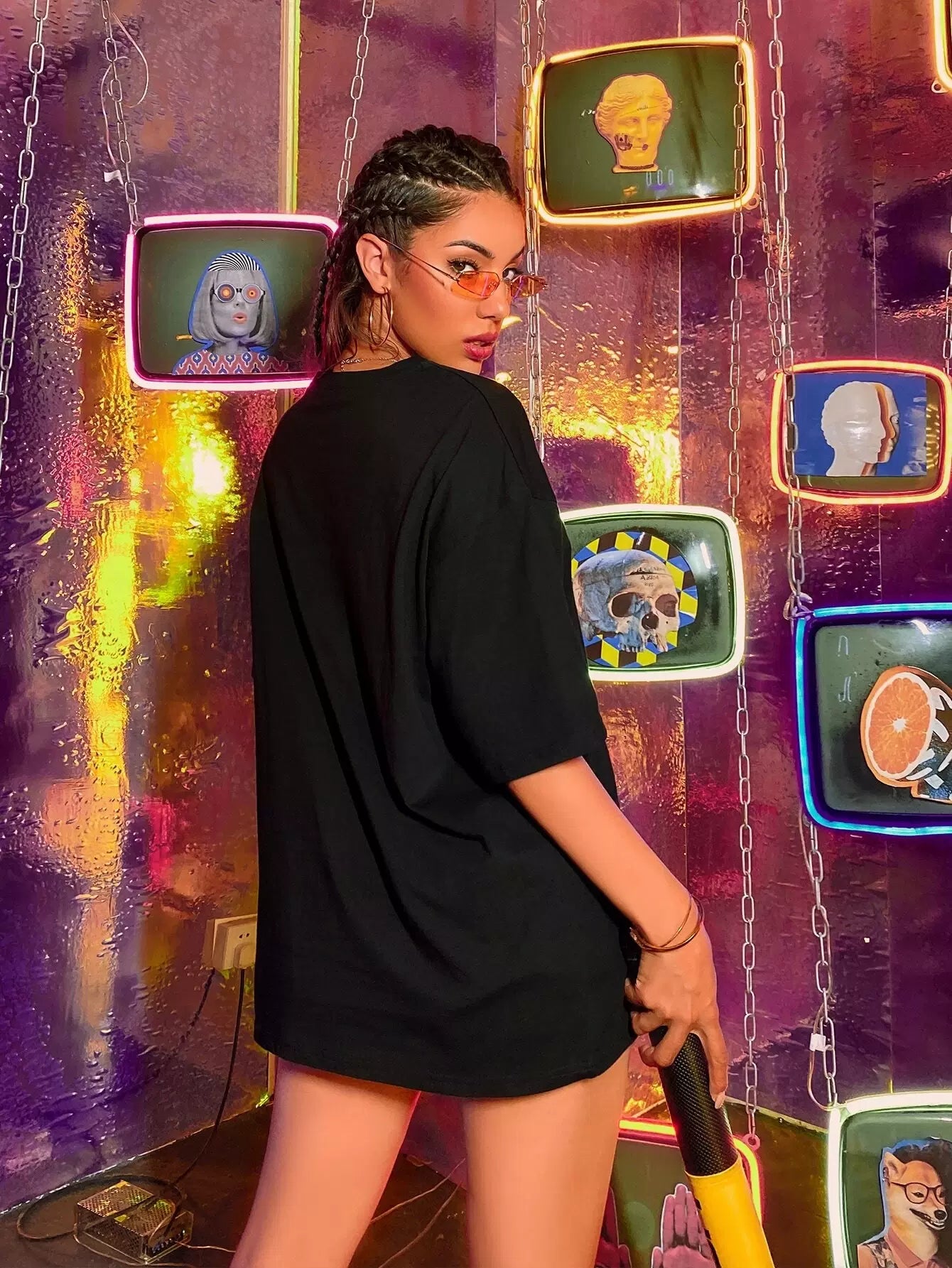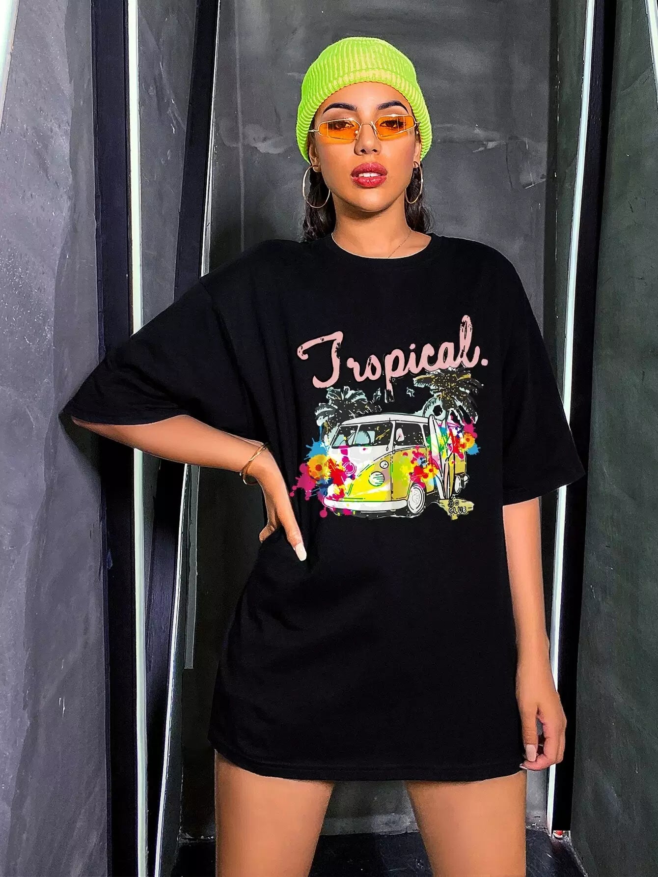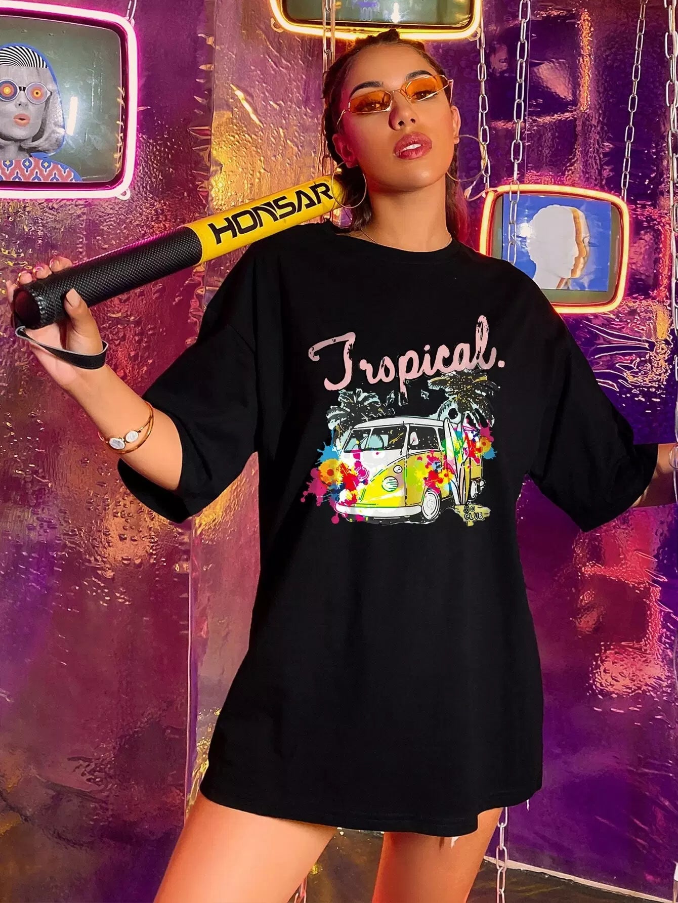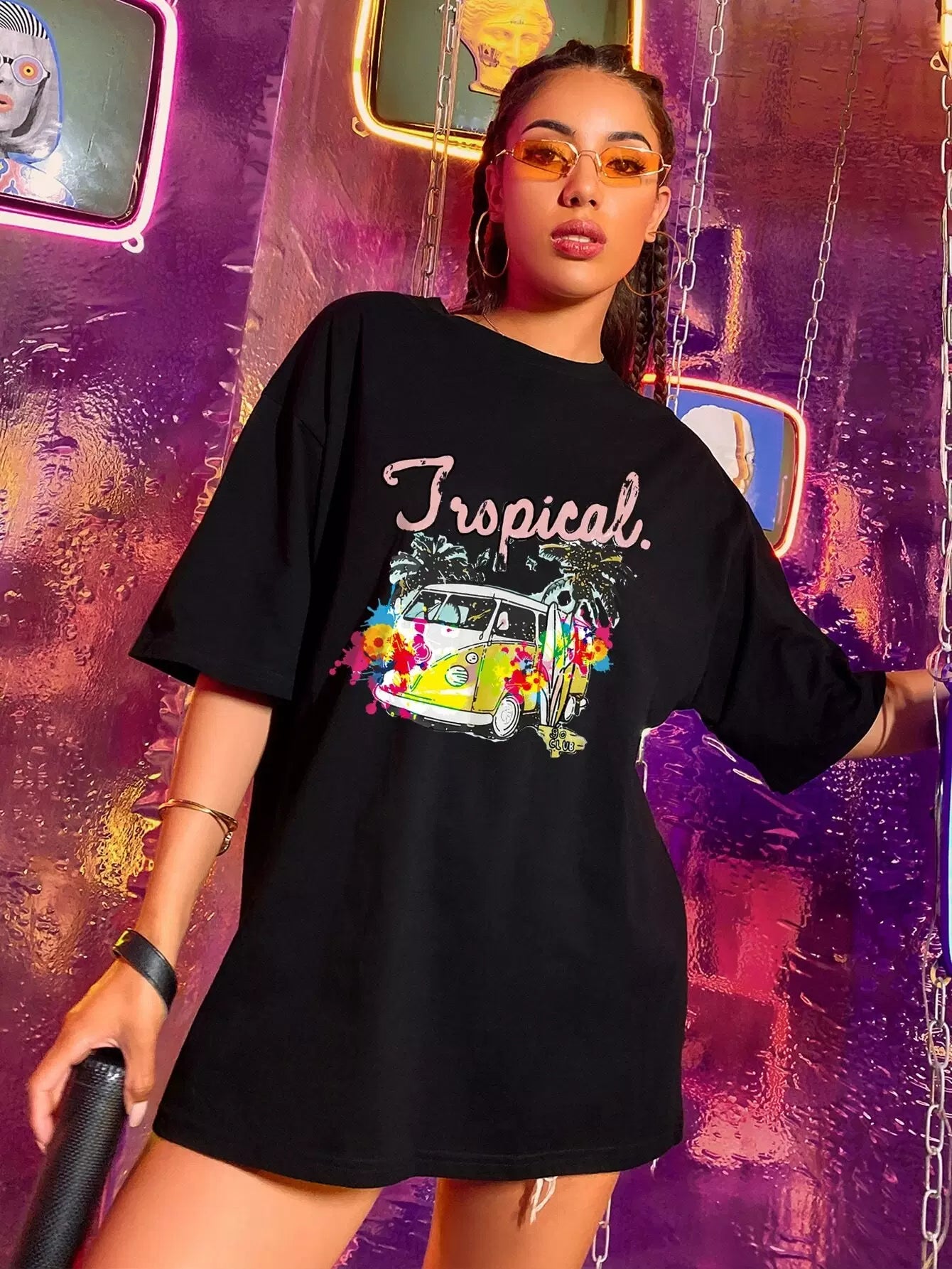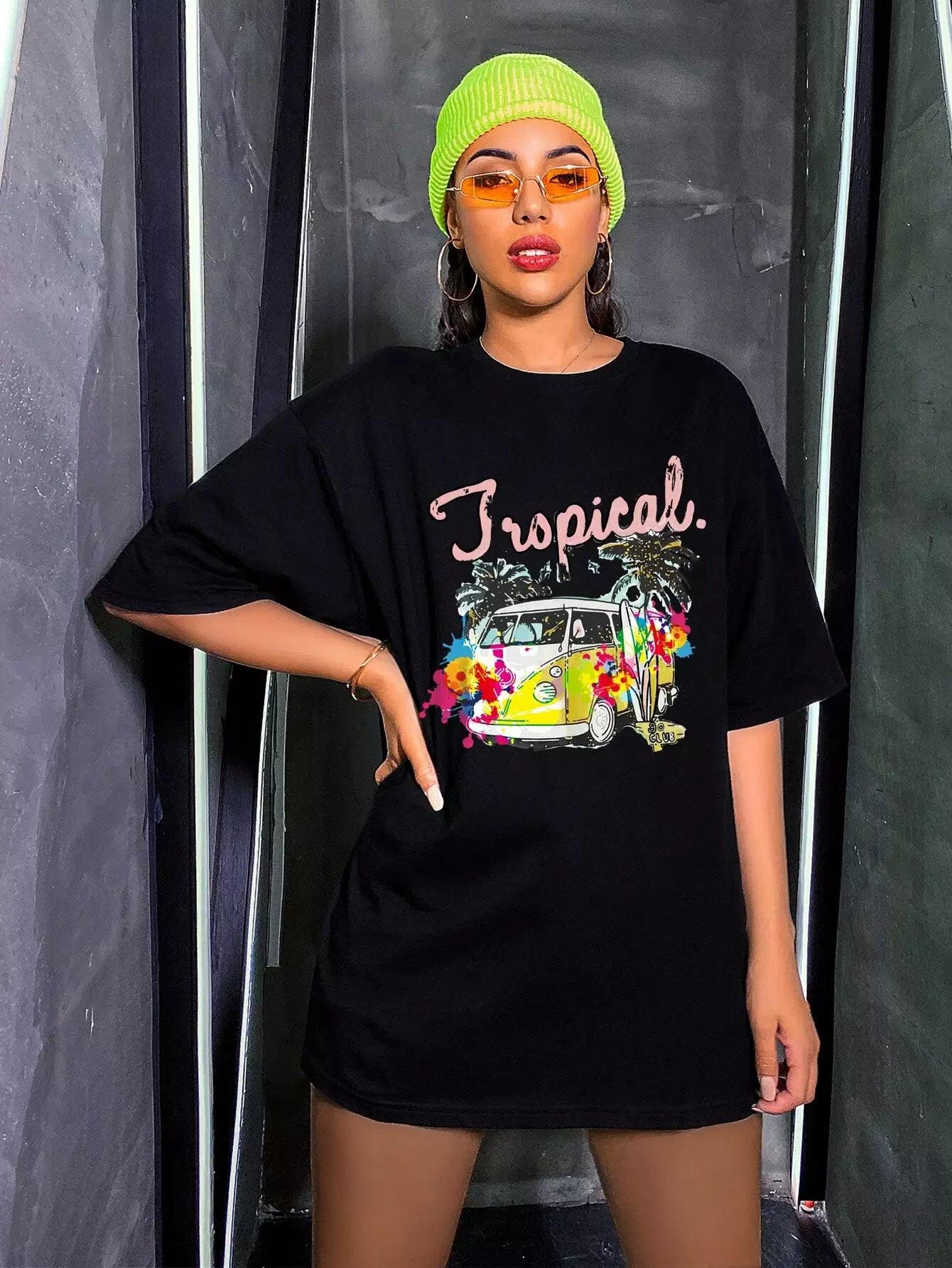 تي شيرت بطبعة حافلة وطبعة استوائية كبير الحجم