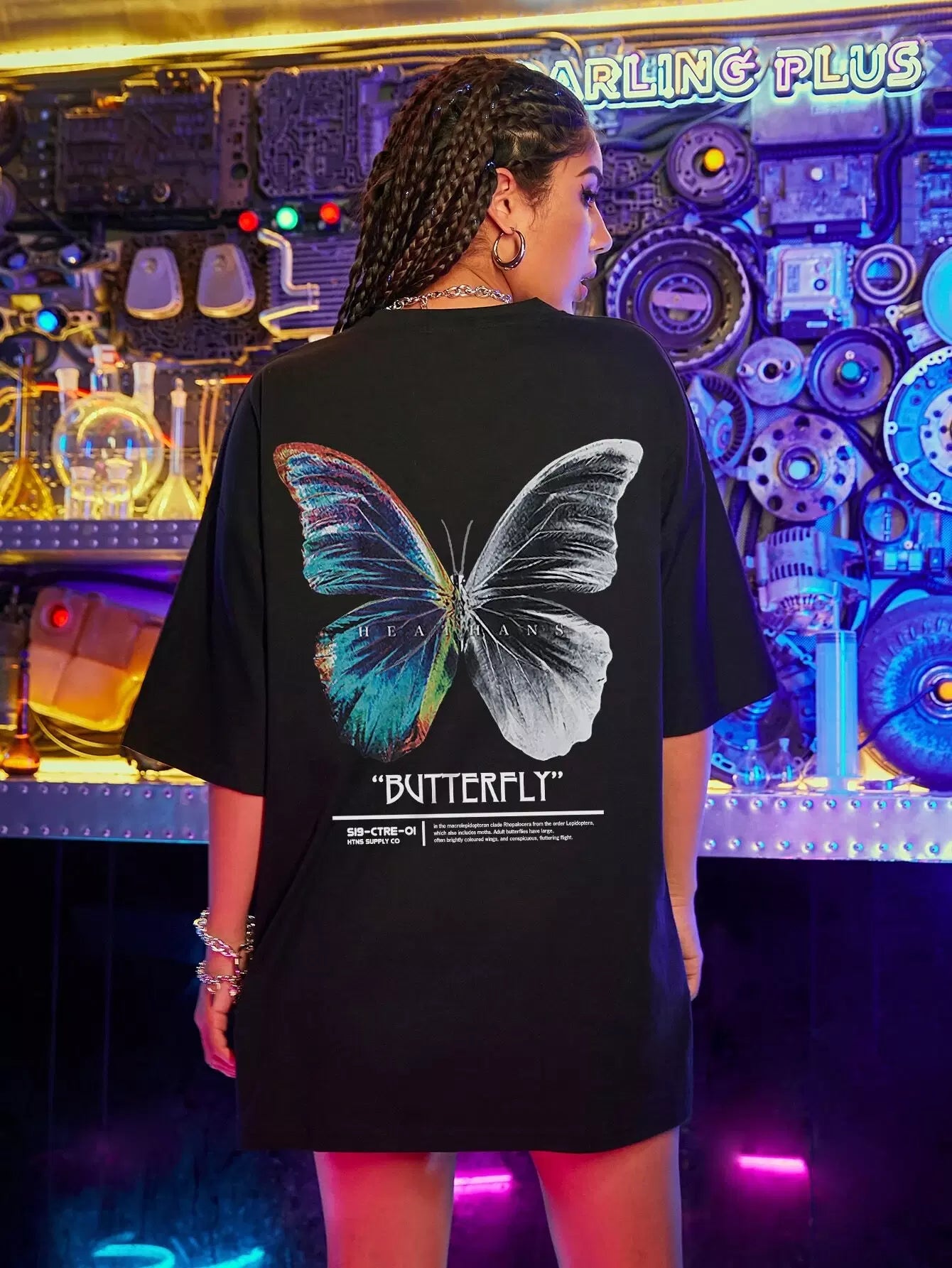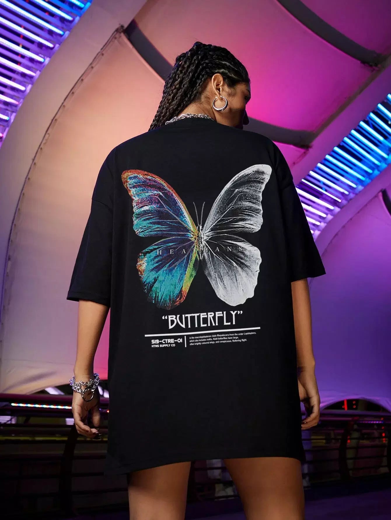 للنساء - تي شيرت كبير الحجم برسومات الفراشة والشعار