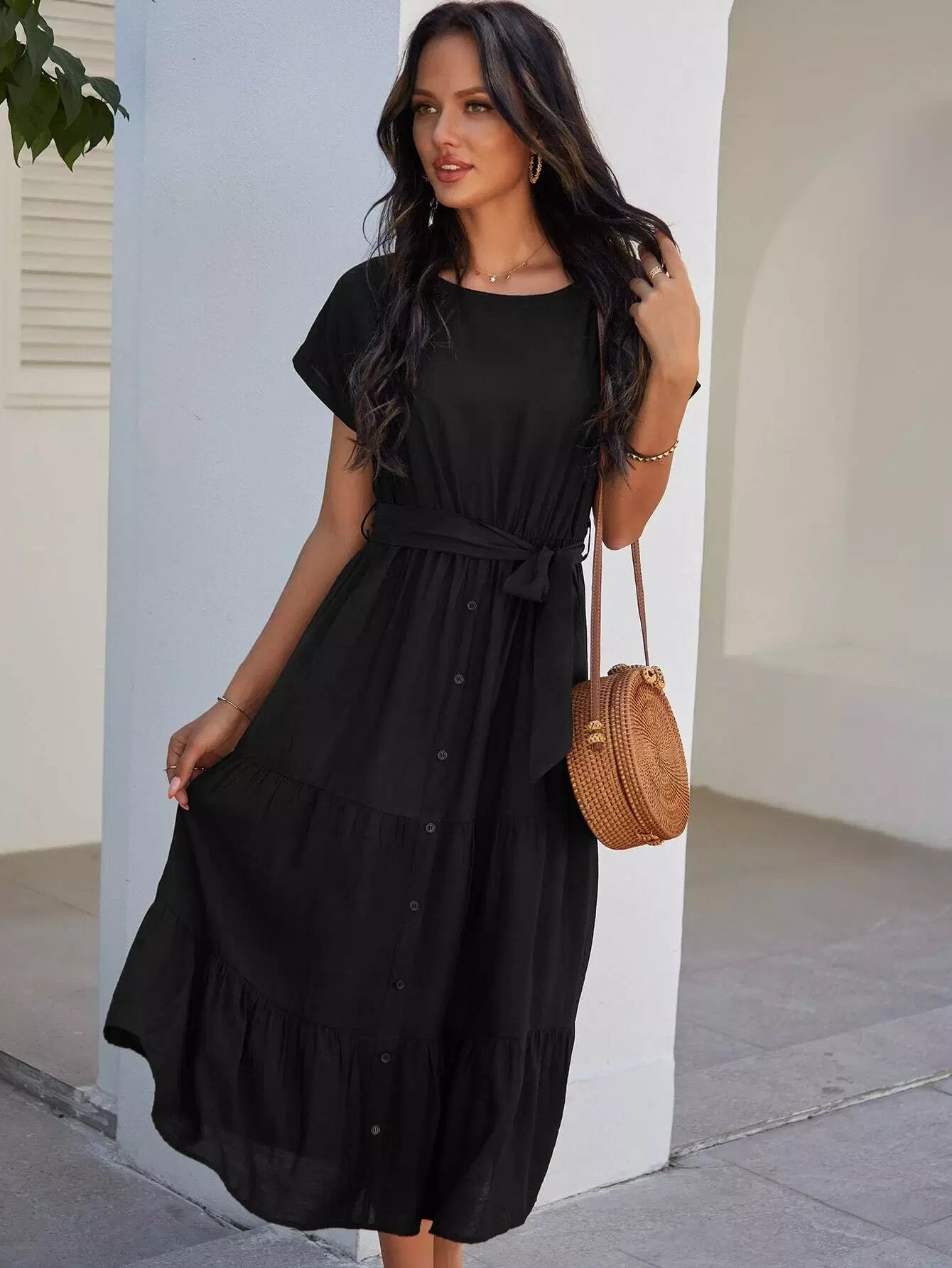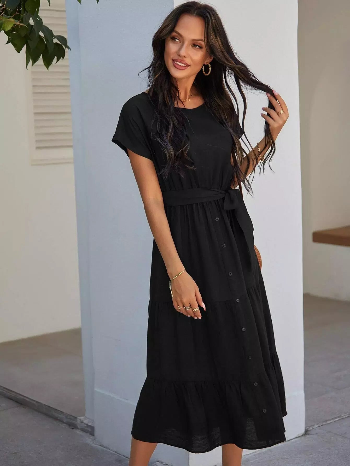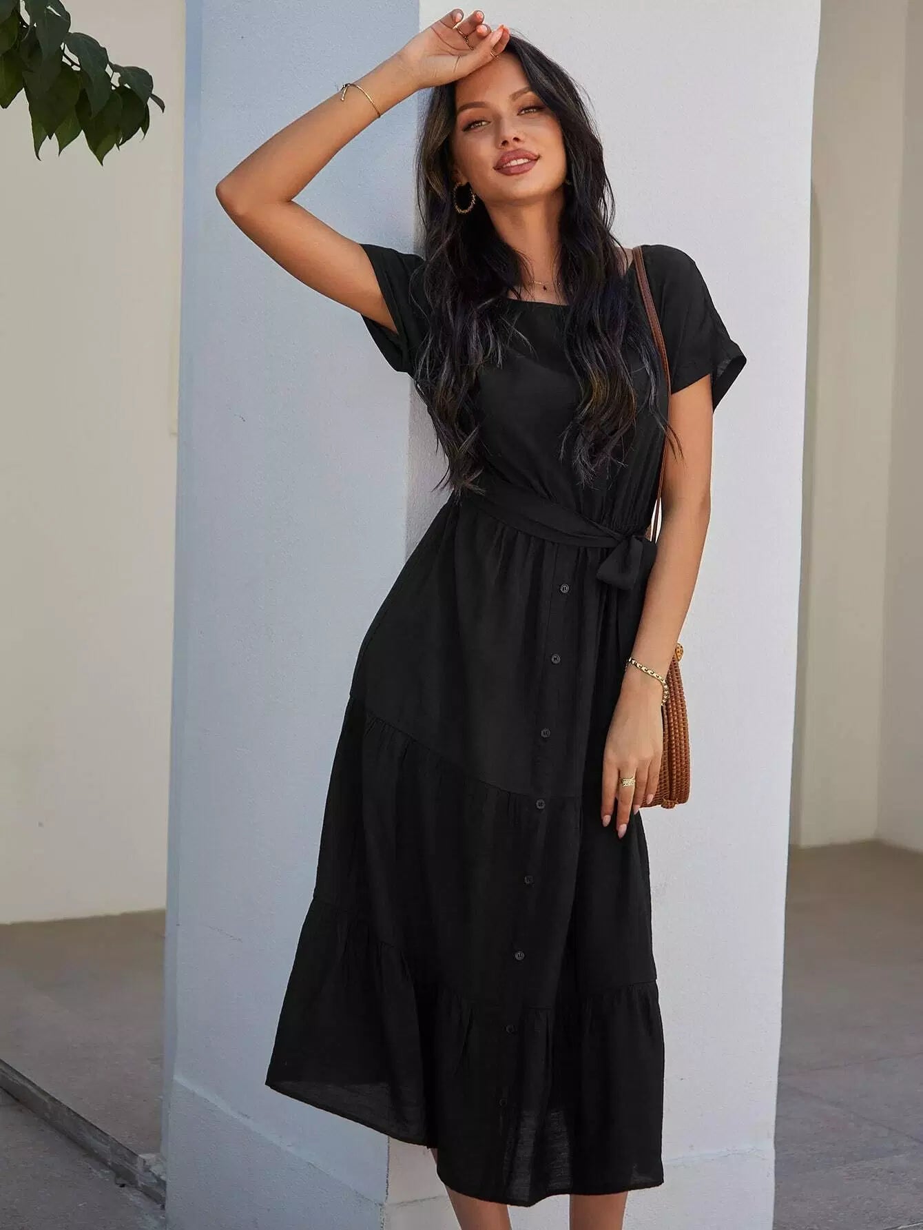 فستان بأزرار أمامية على شكل حرف A بدون حزام