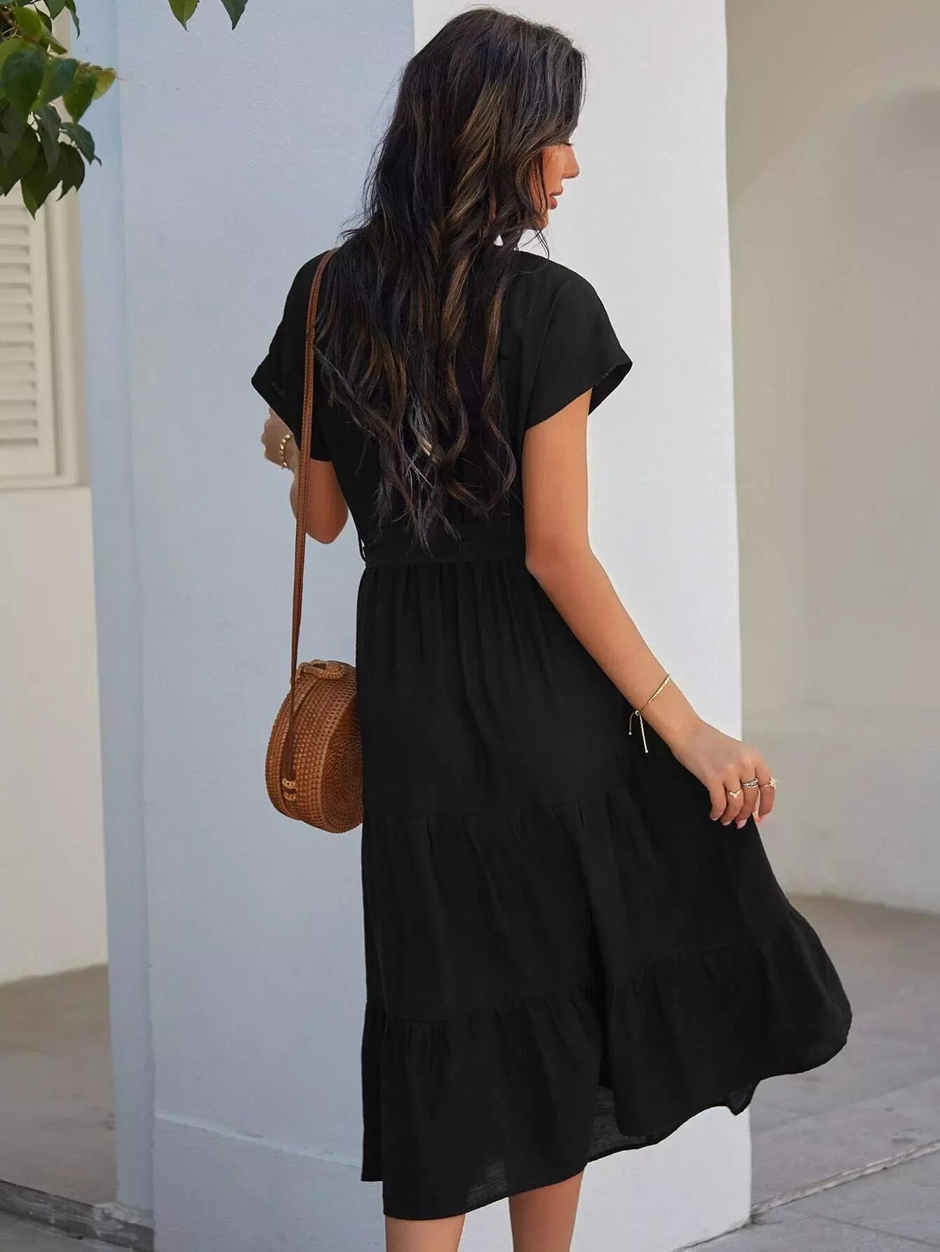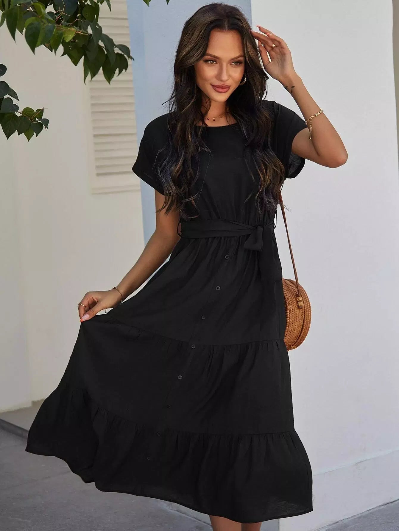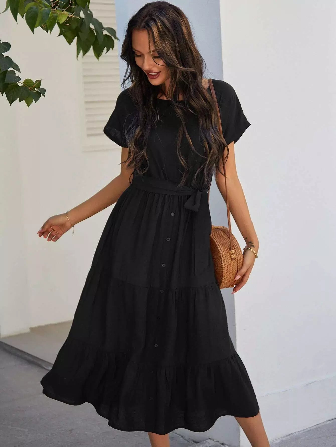 فستان بأزرار أمامية على شكل حرف A بدون حزام