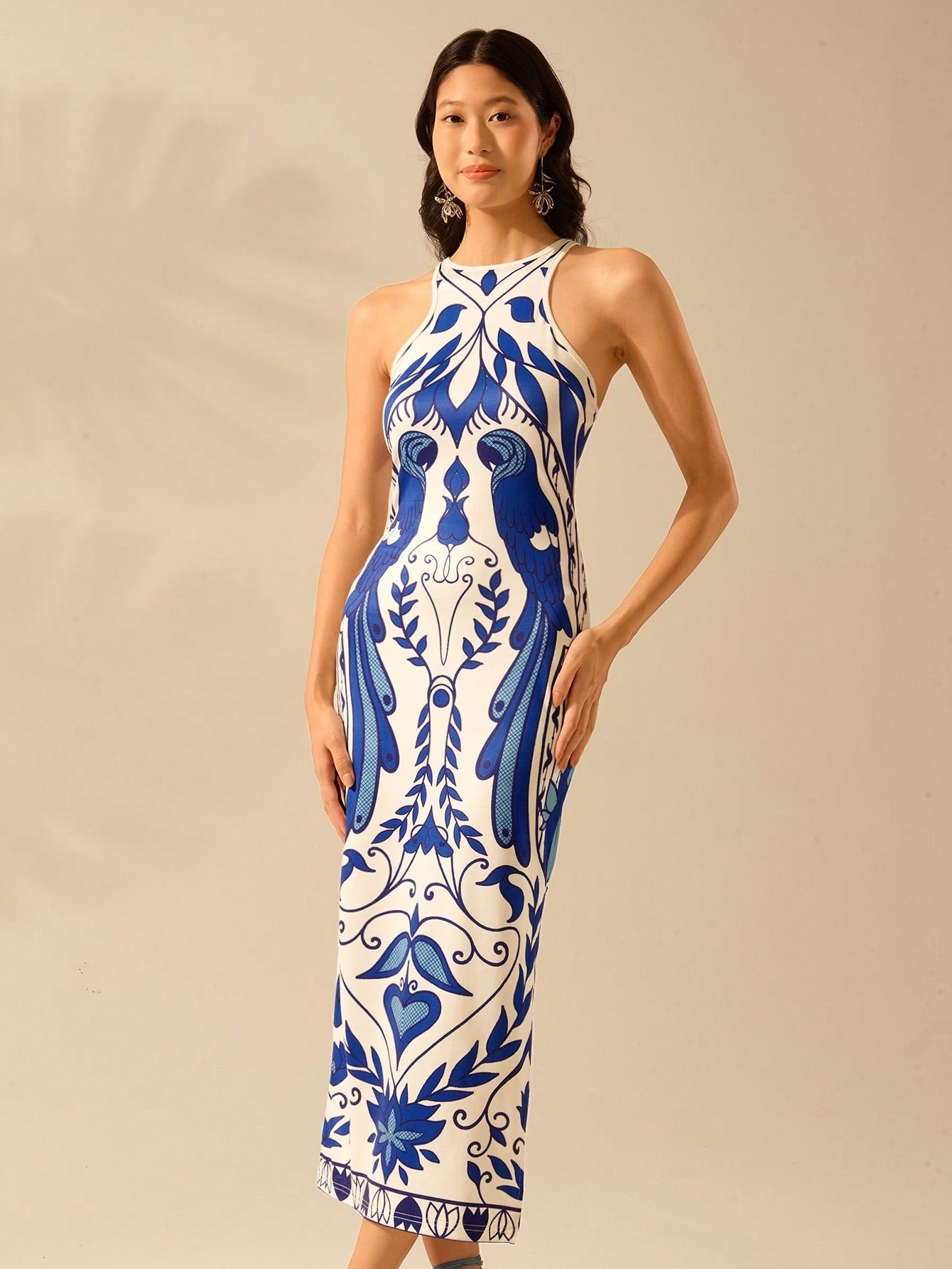 women CAJUNI Women's Boho Tropical Blue Floral & Bird Print Sleeveless Racerback Fitted Dress