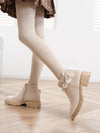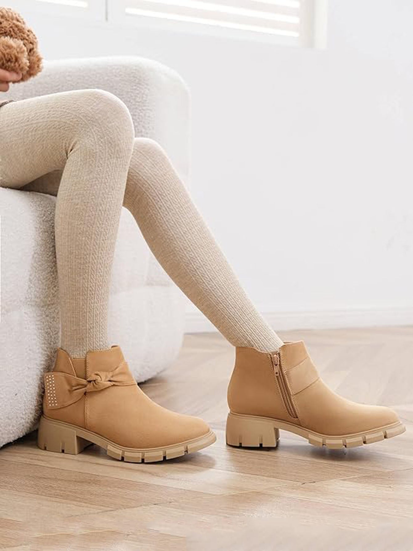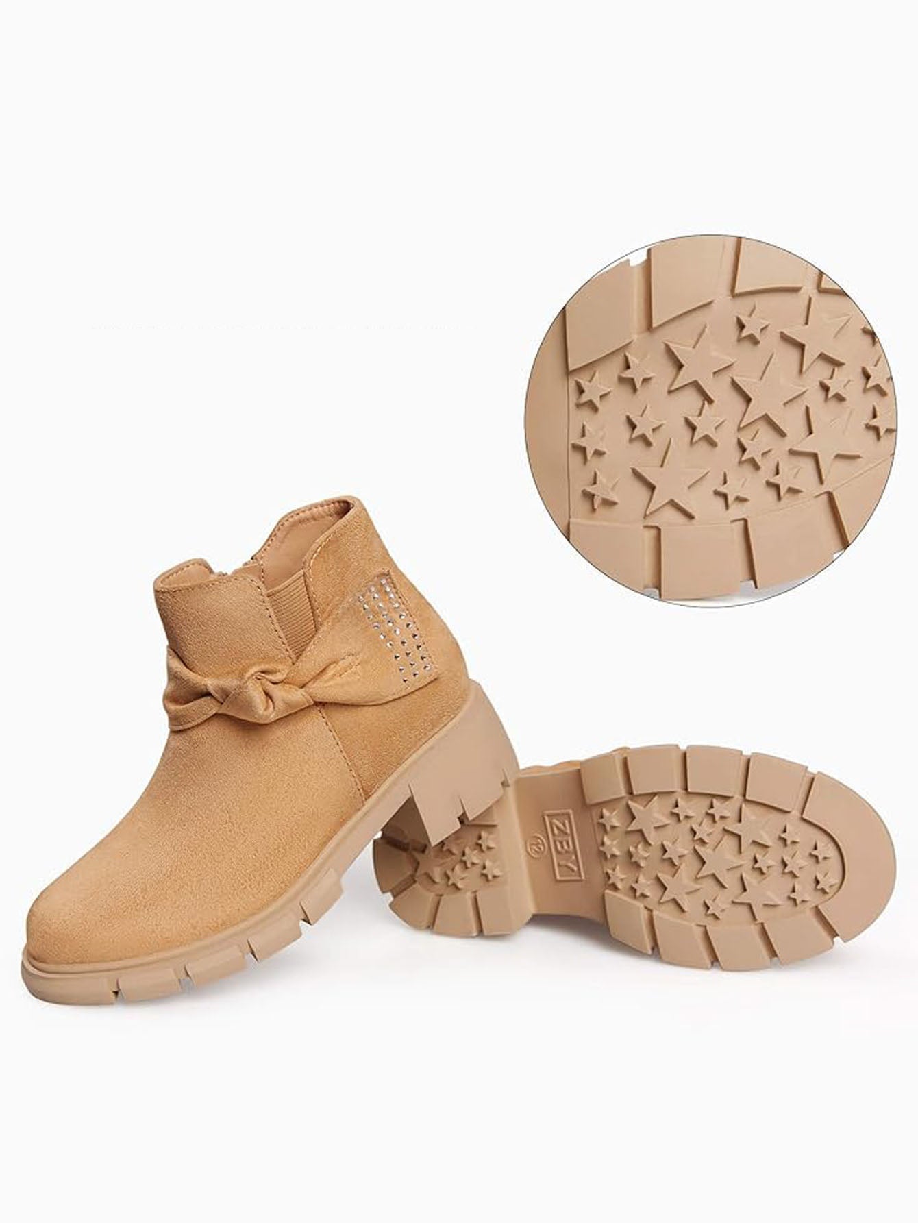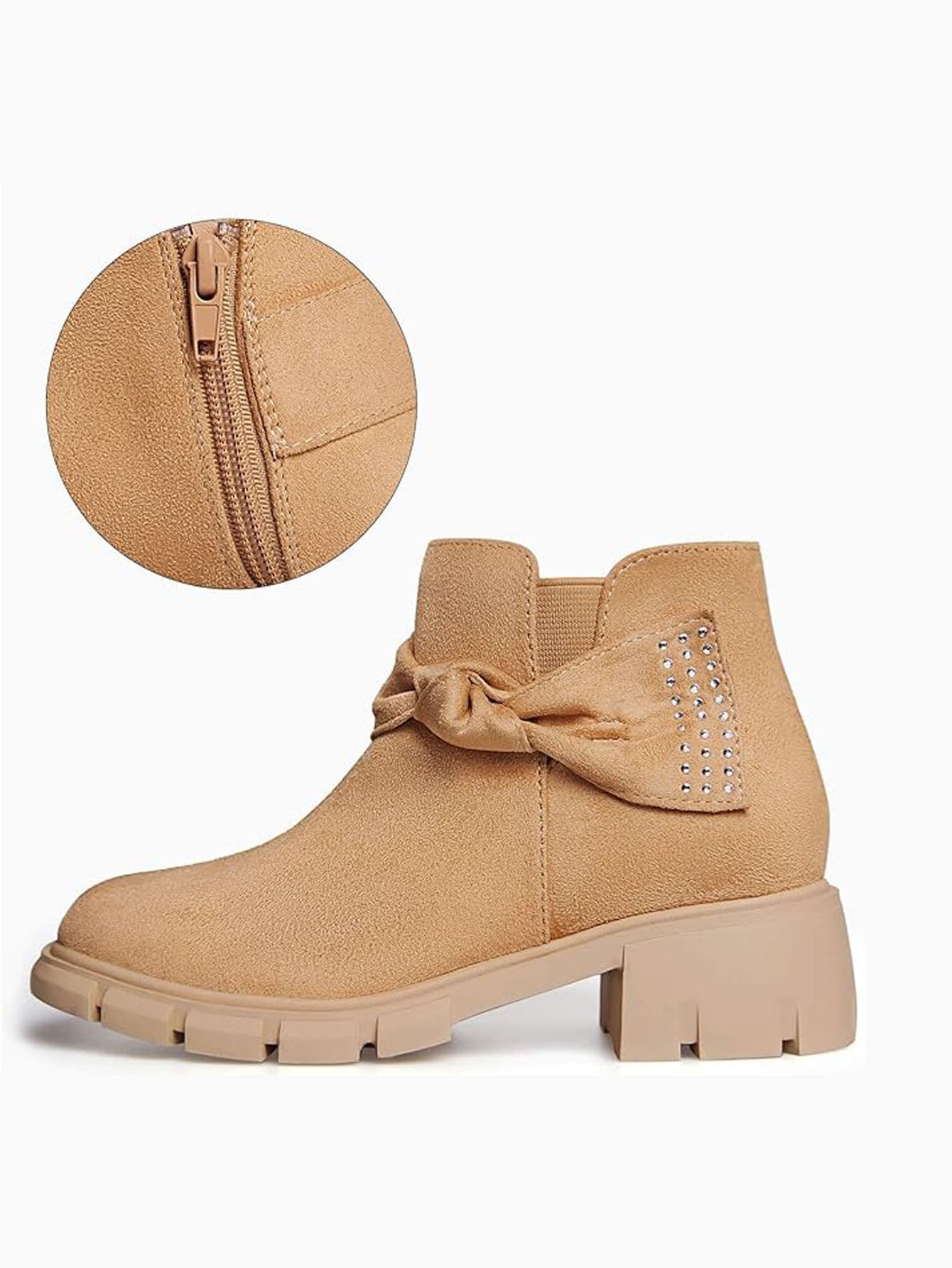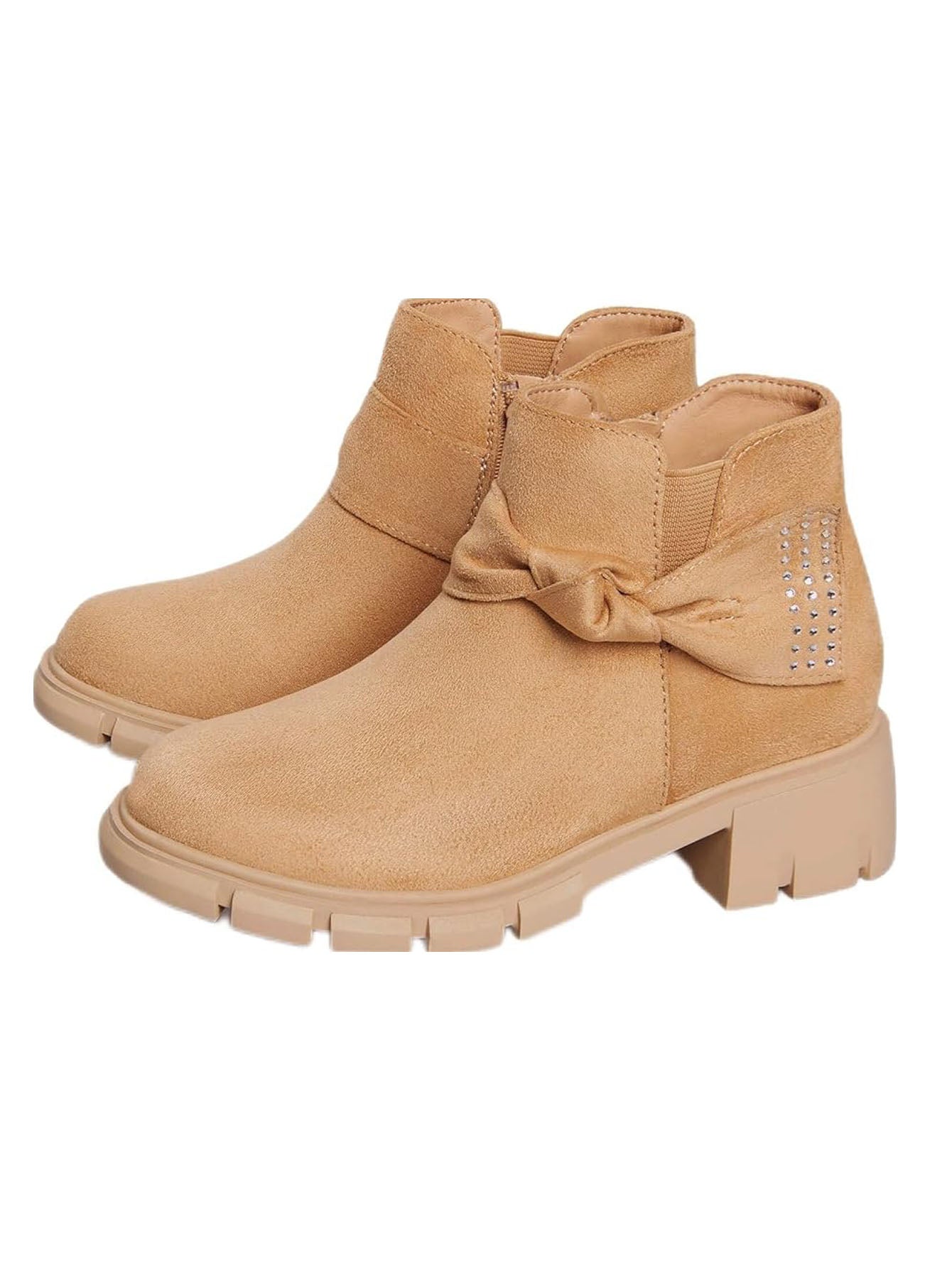 جزمة كاحل للبنات باللون الجملي، تتميز بكعب متوسط الارتفاع. يتميز الجزء العلوي منها برباط عريض يضفي عليها مظهراً أنيقاً وكلاسيكياً مع سحاب جانبي، مما يجعلها قابلة للارتداء مع العديد من الملابس.