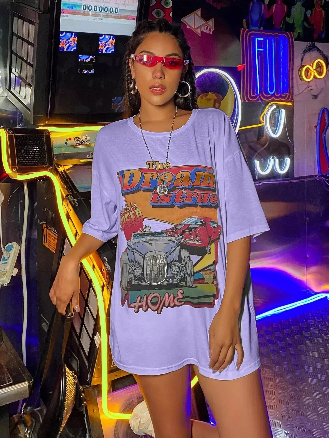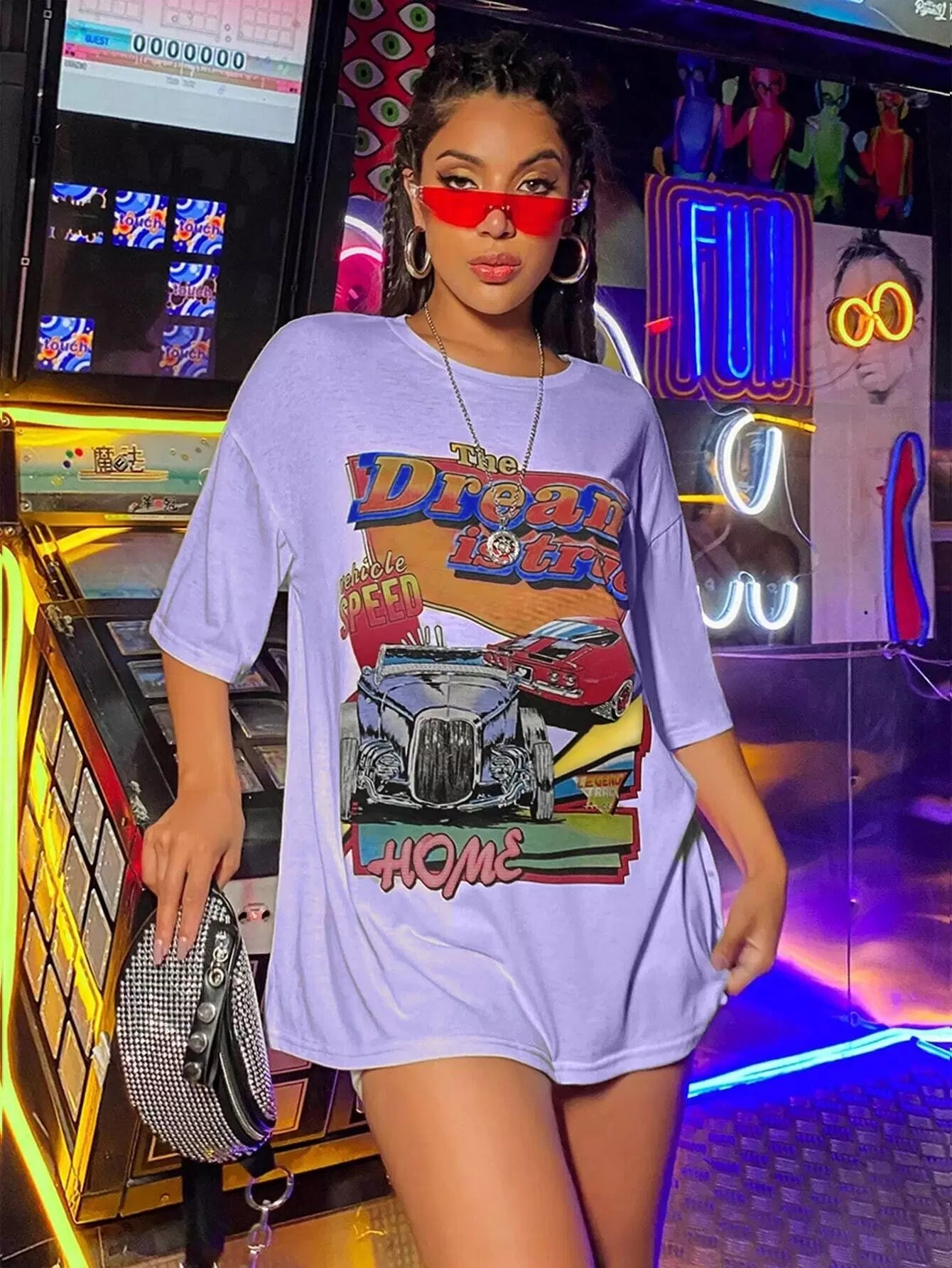 تي شيرت برسومات سيارات ورسومات حروف كبيرة الحجم