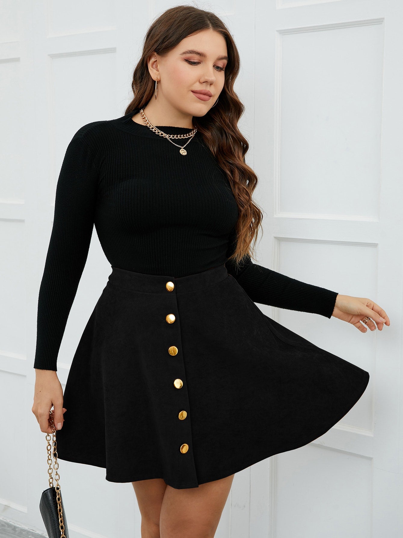 Celure Plus Size Front Button Flared Hem Casual Skirt