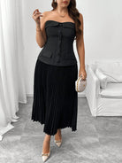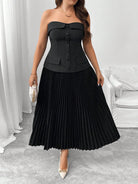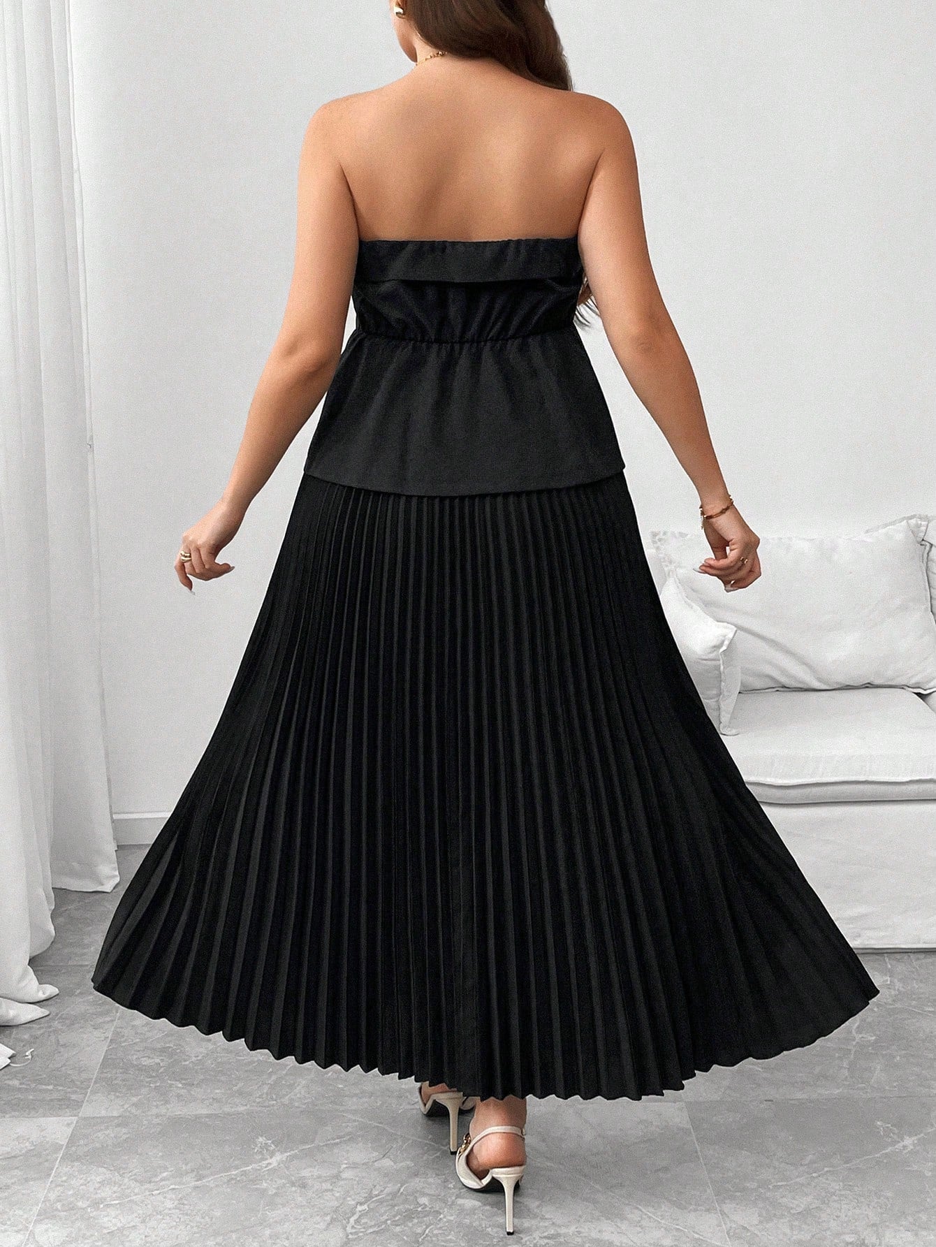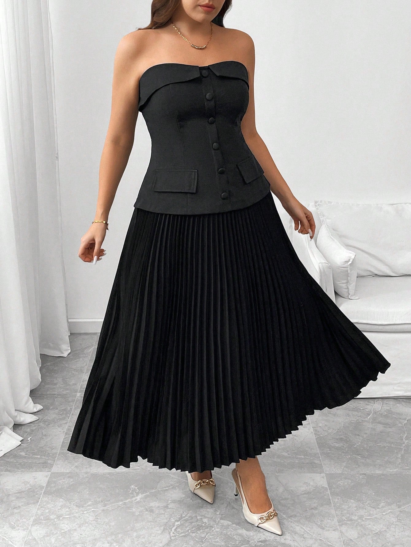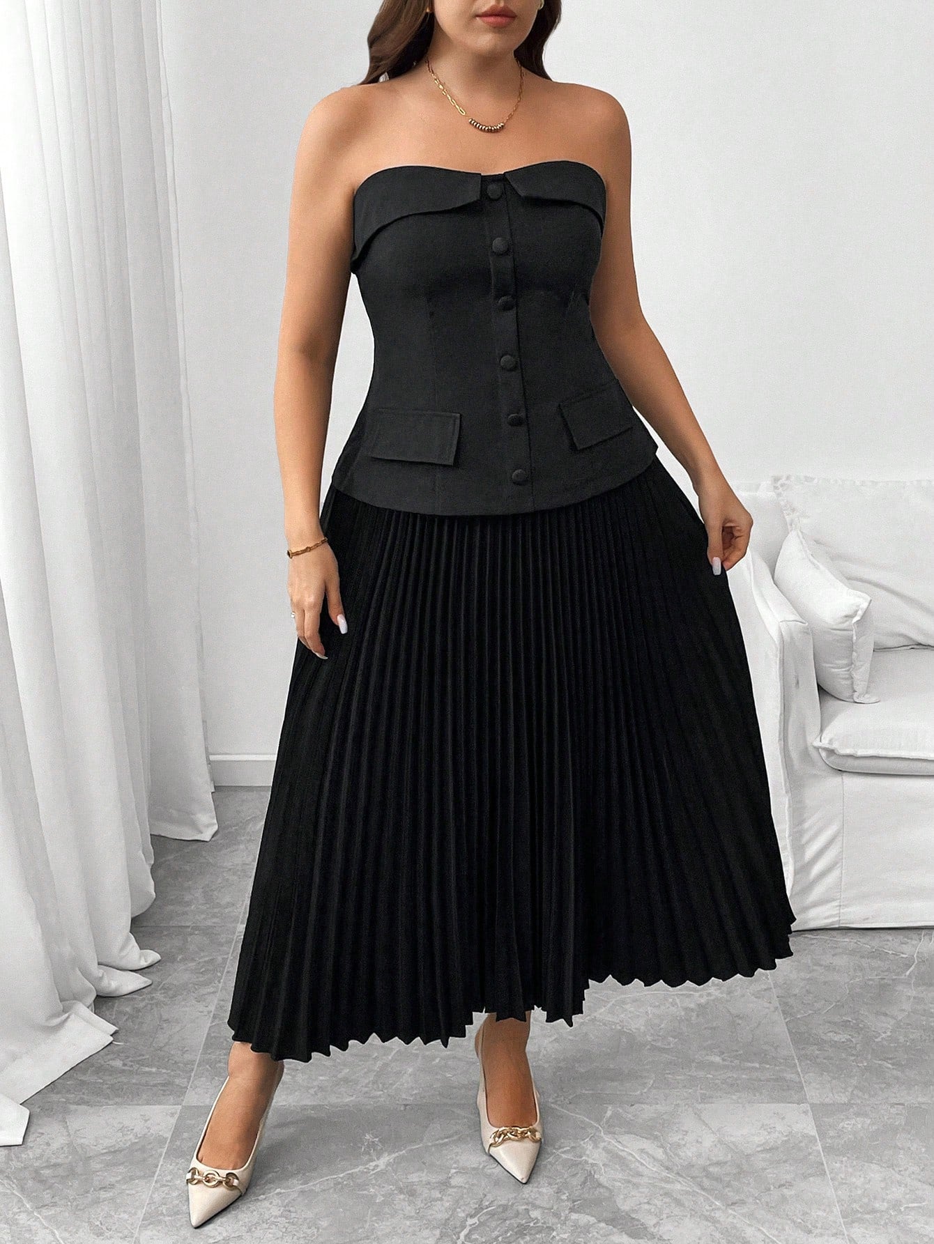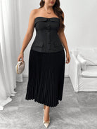 Celure Plus Size Solid Color Bustier Top With Pleated Skirt, 2 Pieces Elegant Suit