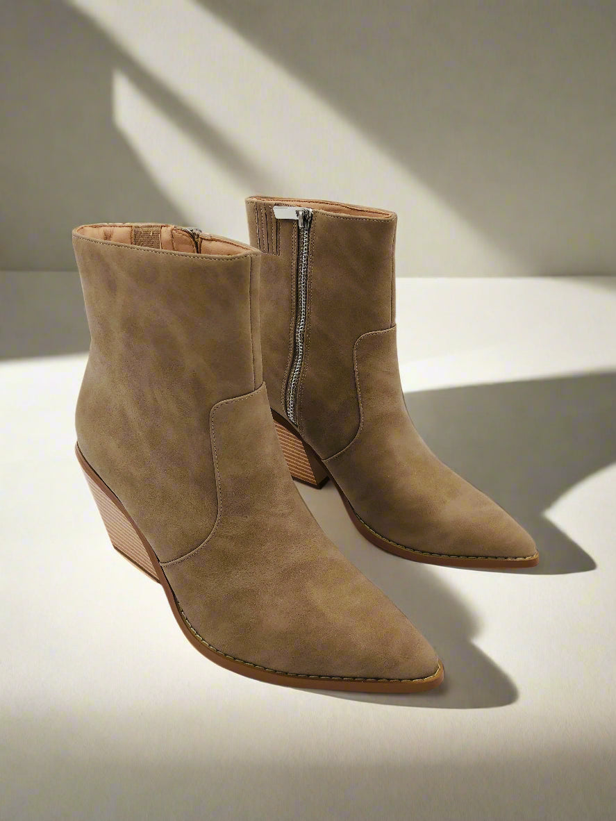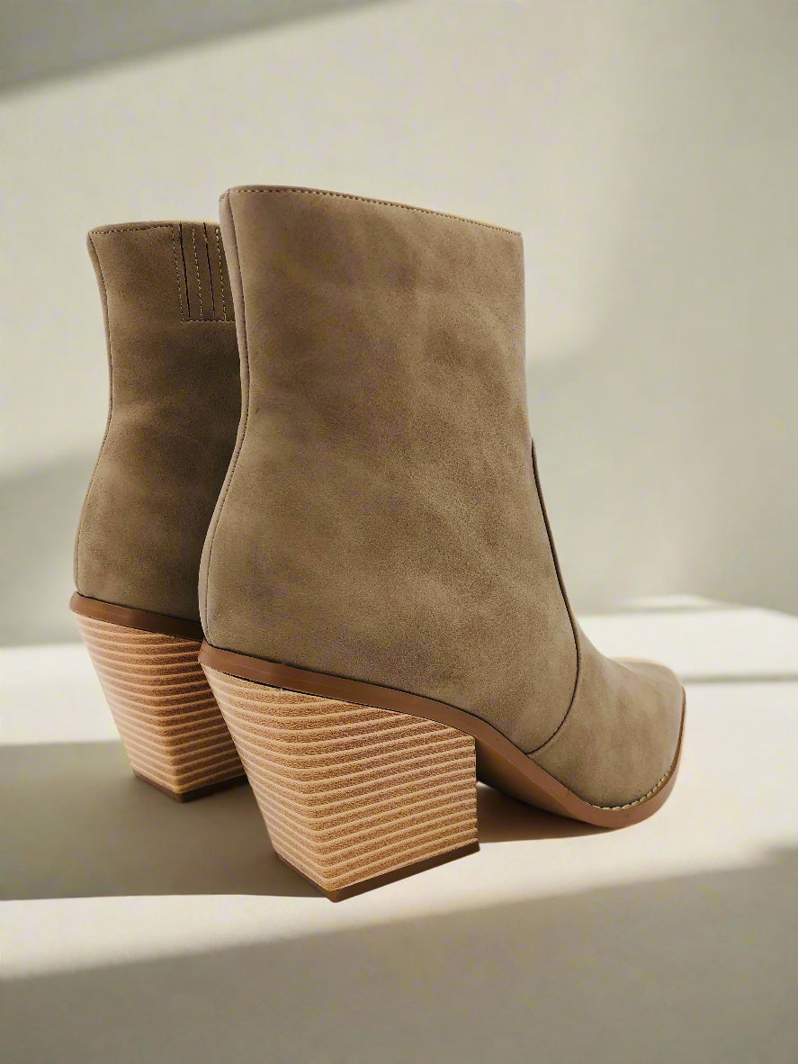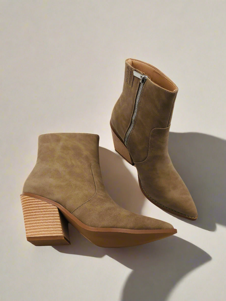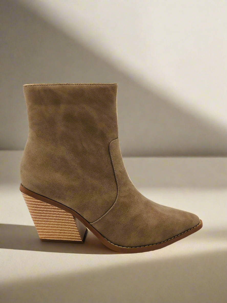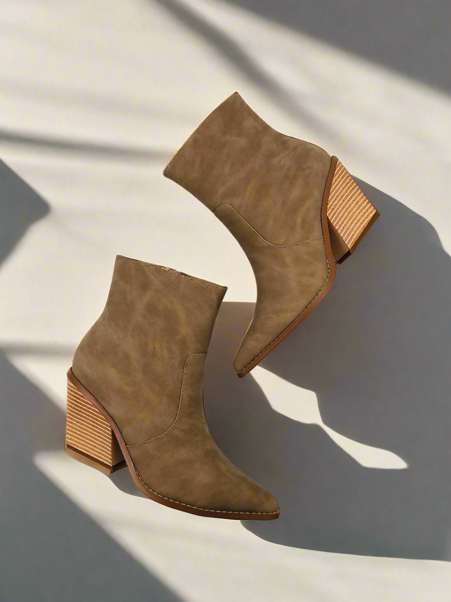 جزمة شتوية كاكي أنيقة تتميز بمقدمة لوزية أنيقة، وكعب عريض متين، وسحاب جانبي مريح لإطلالة بلا مجهود.