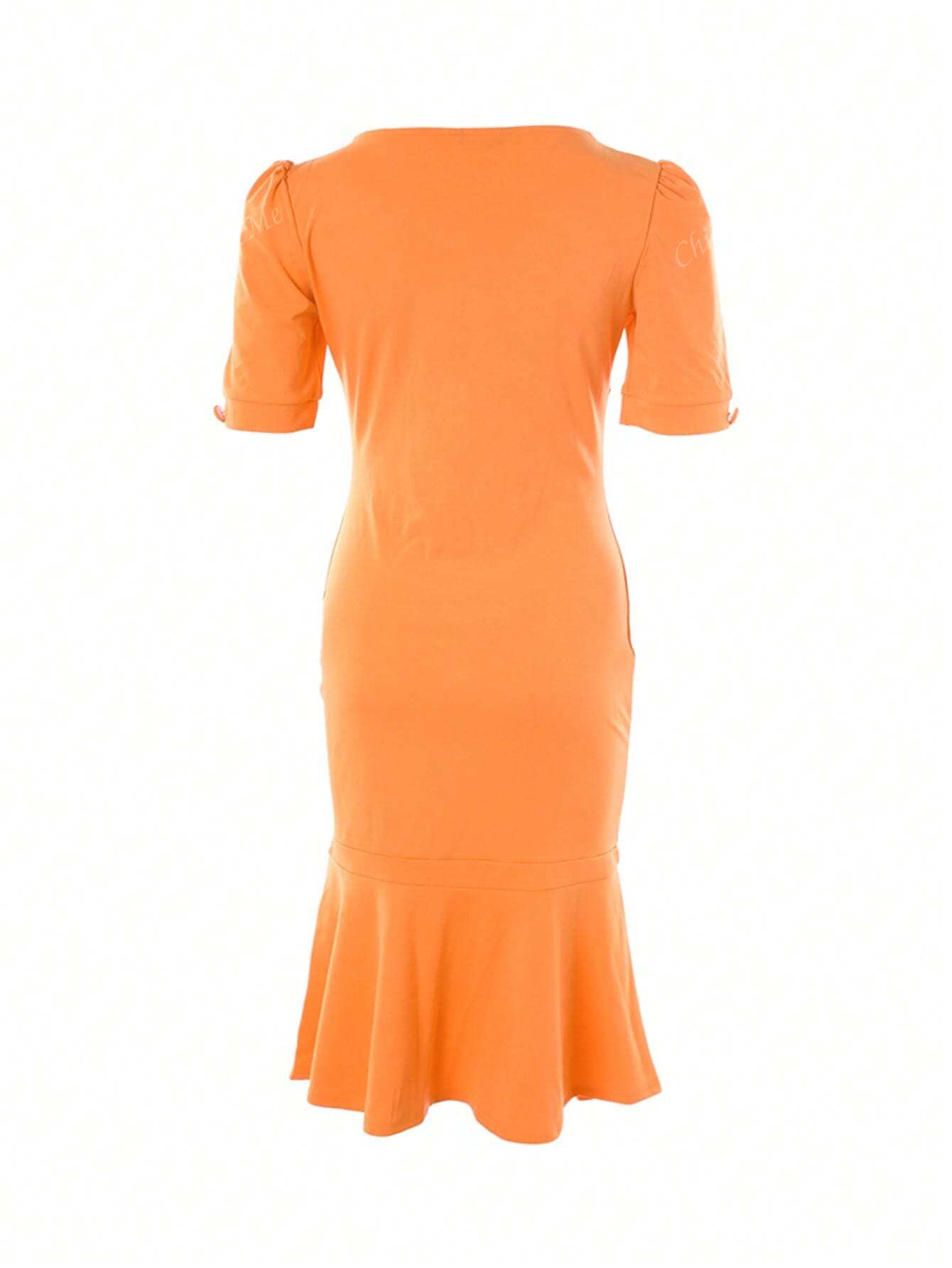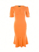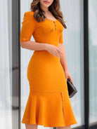 فستان ChicMe متوسط الطول بأكمام منتفخة وحافة مكشكشة وأزرار أمامية وياقة مستديرة وقصّة ضيقة وأنيق للحفلات