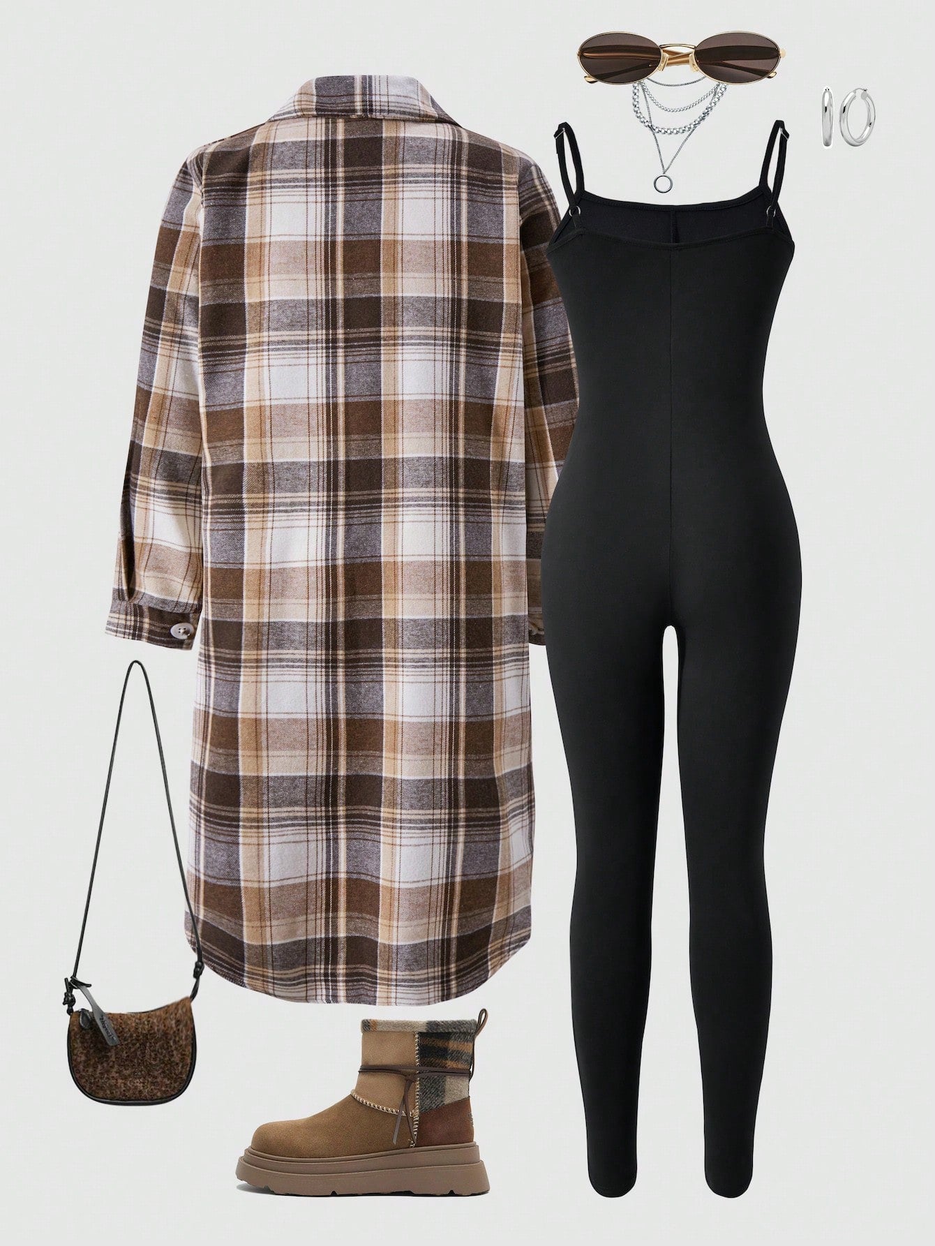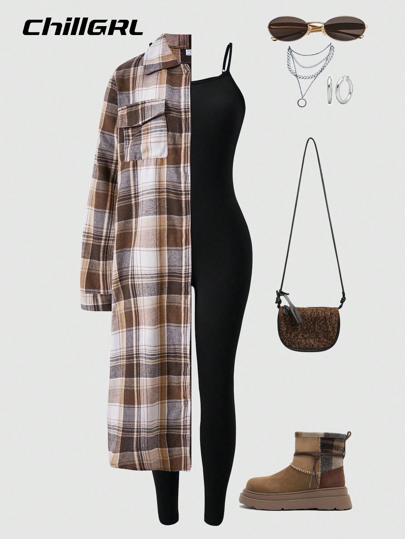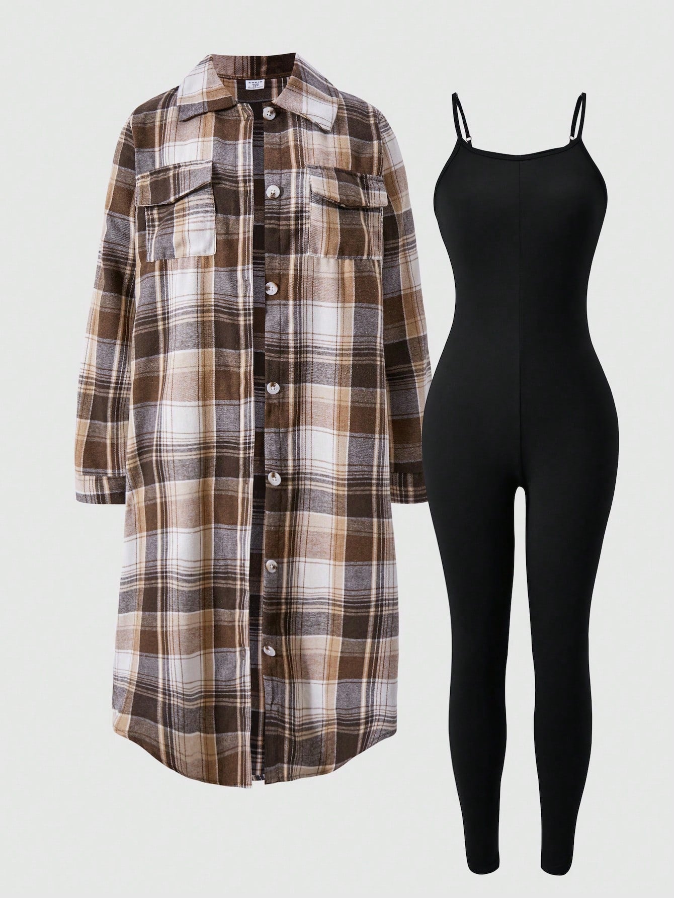 طقم مكون من قطعتين من ChillGRL للفتيات المراهقات: قميص طويل فضفاض بنقشة مربعات وياقة عريضة، بالإضافة إلى جمبسوت أنيق بحمالات.