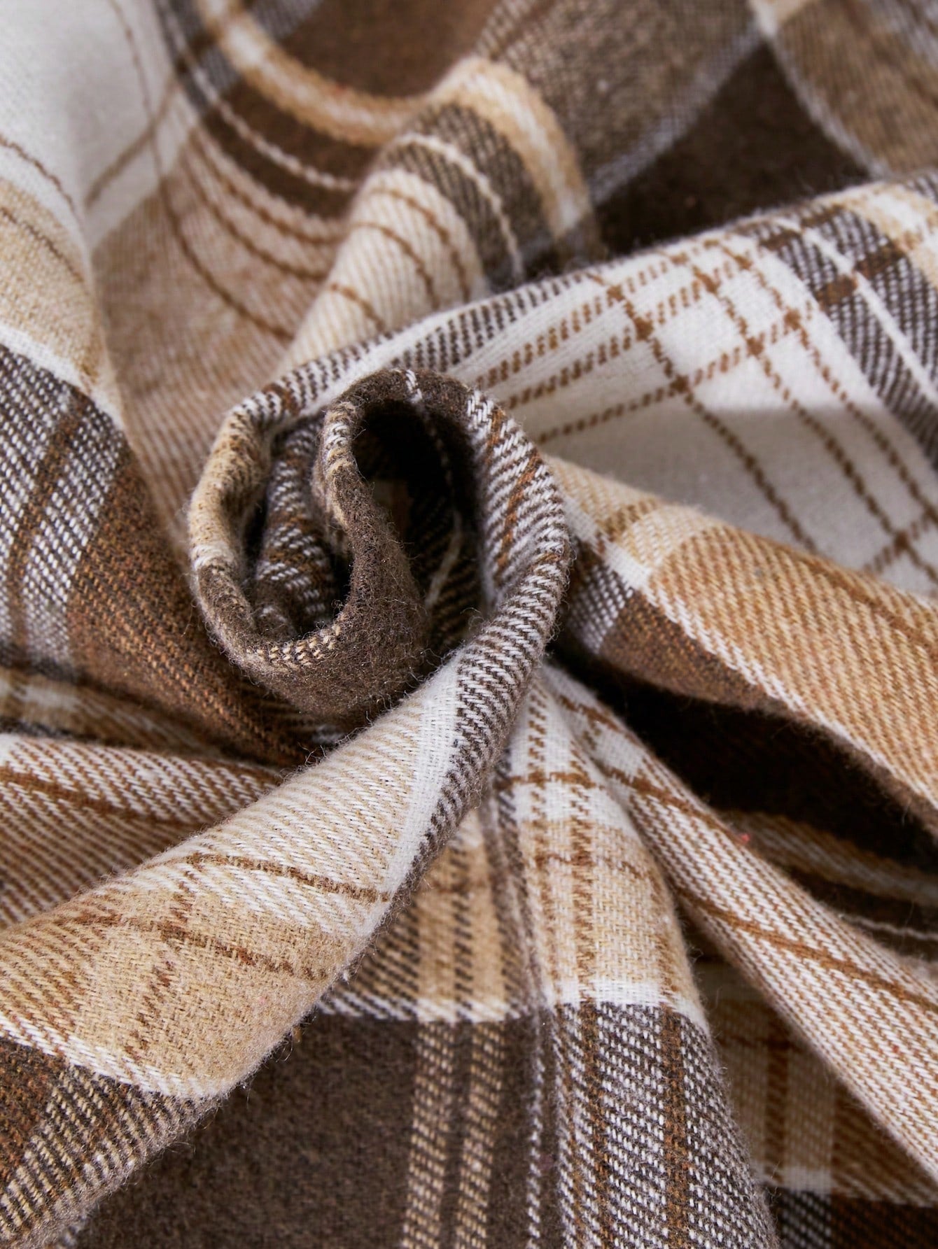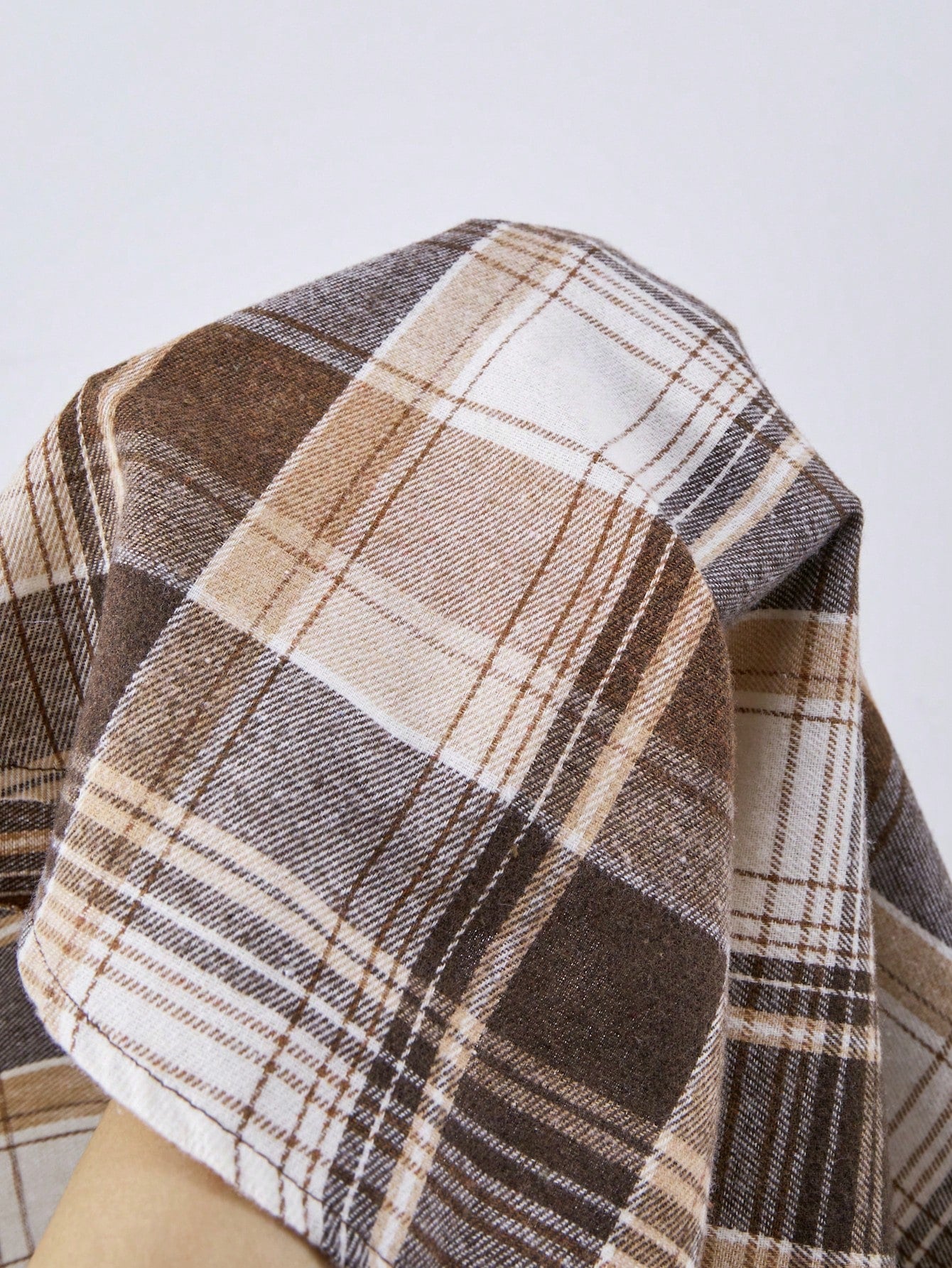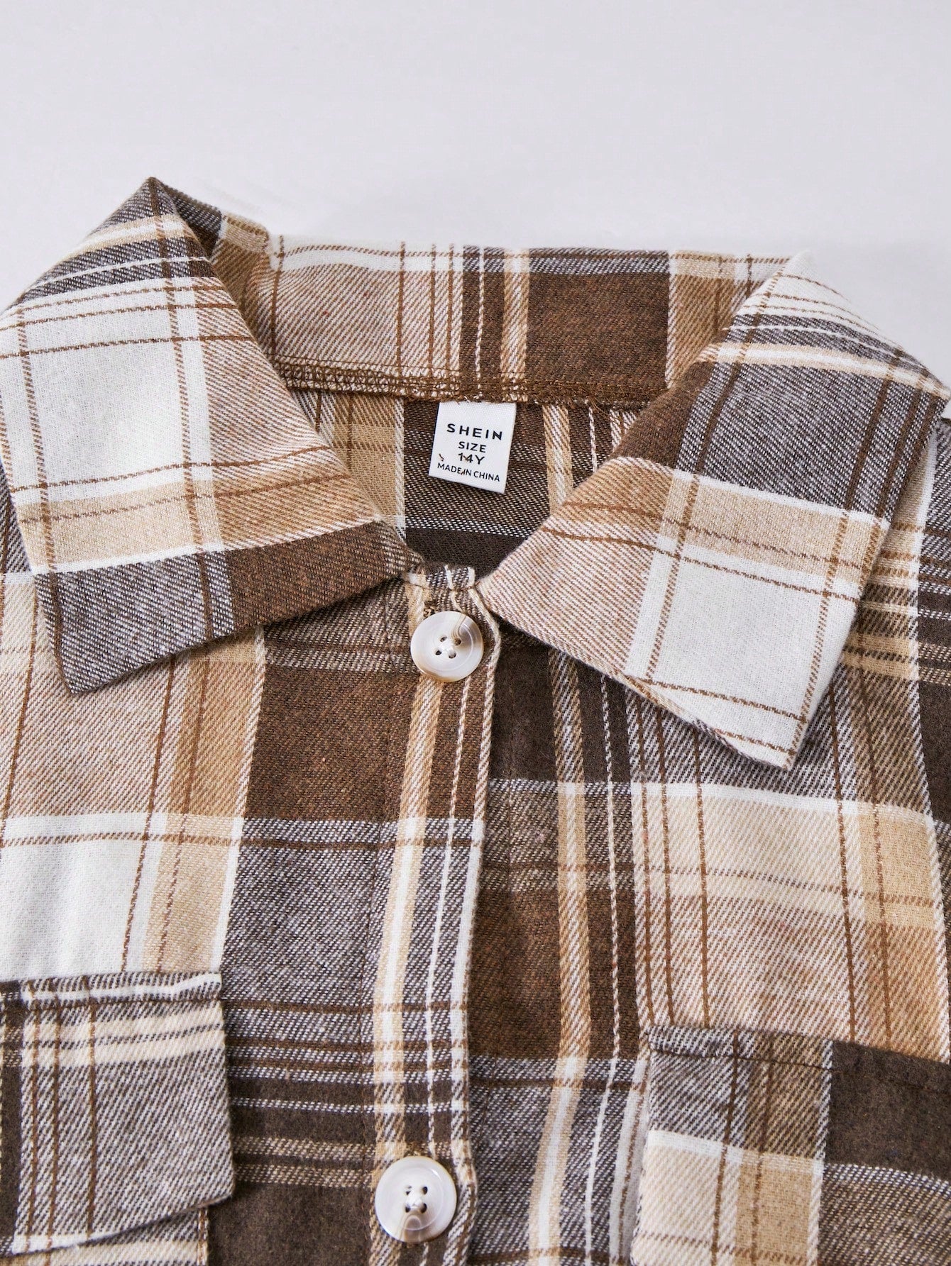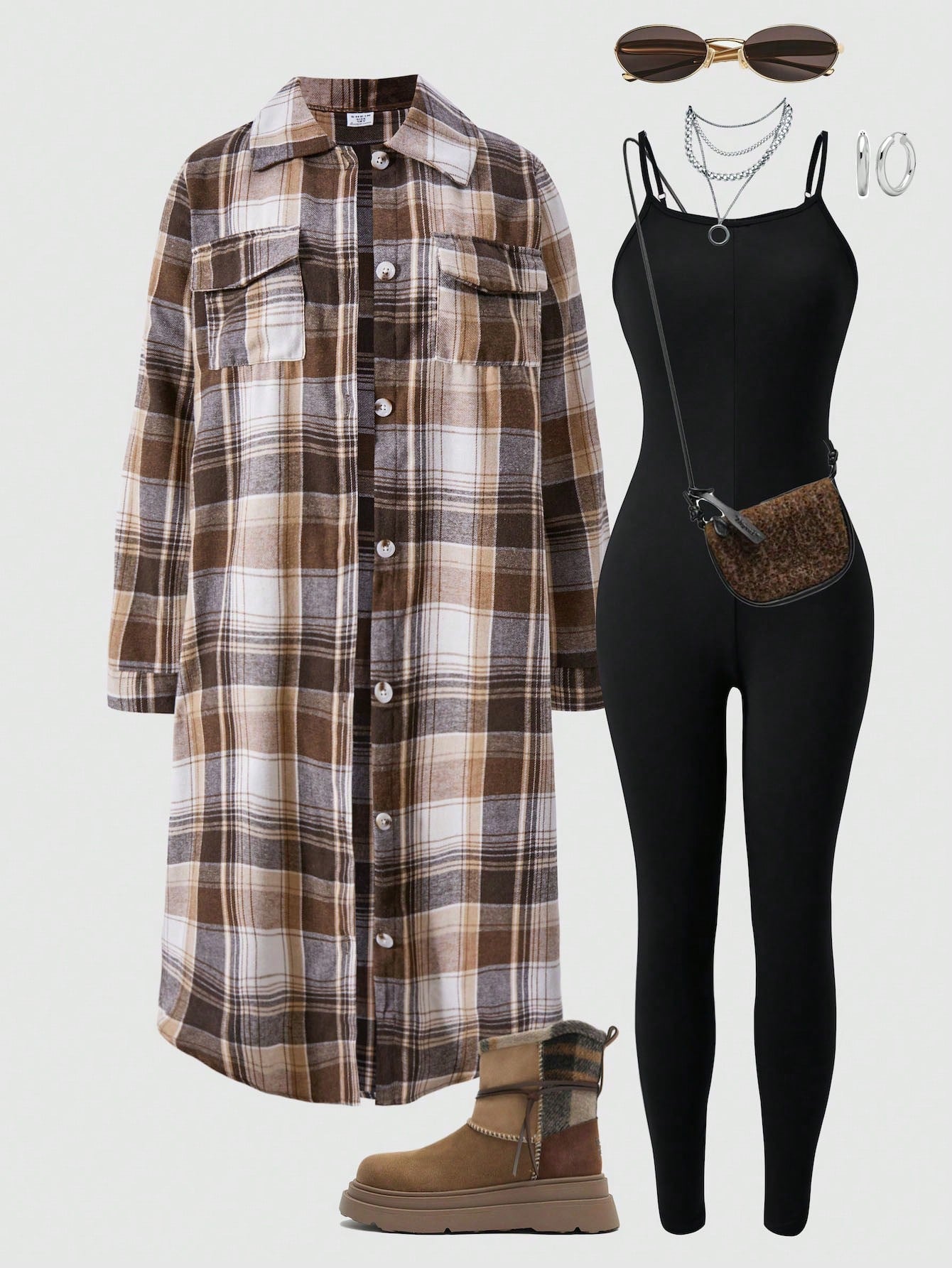 طقم مكون من قطعتين من ChillGRL للفتيات المراهقات: قميص طويل فضفاض بنقشة مربعات وياقة عريضة، بالإضافة إلى جمبسوت أنيق بحمالات.