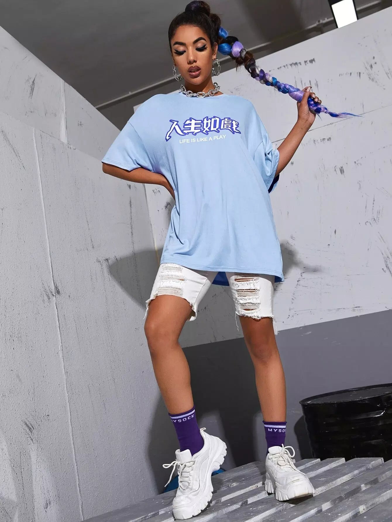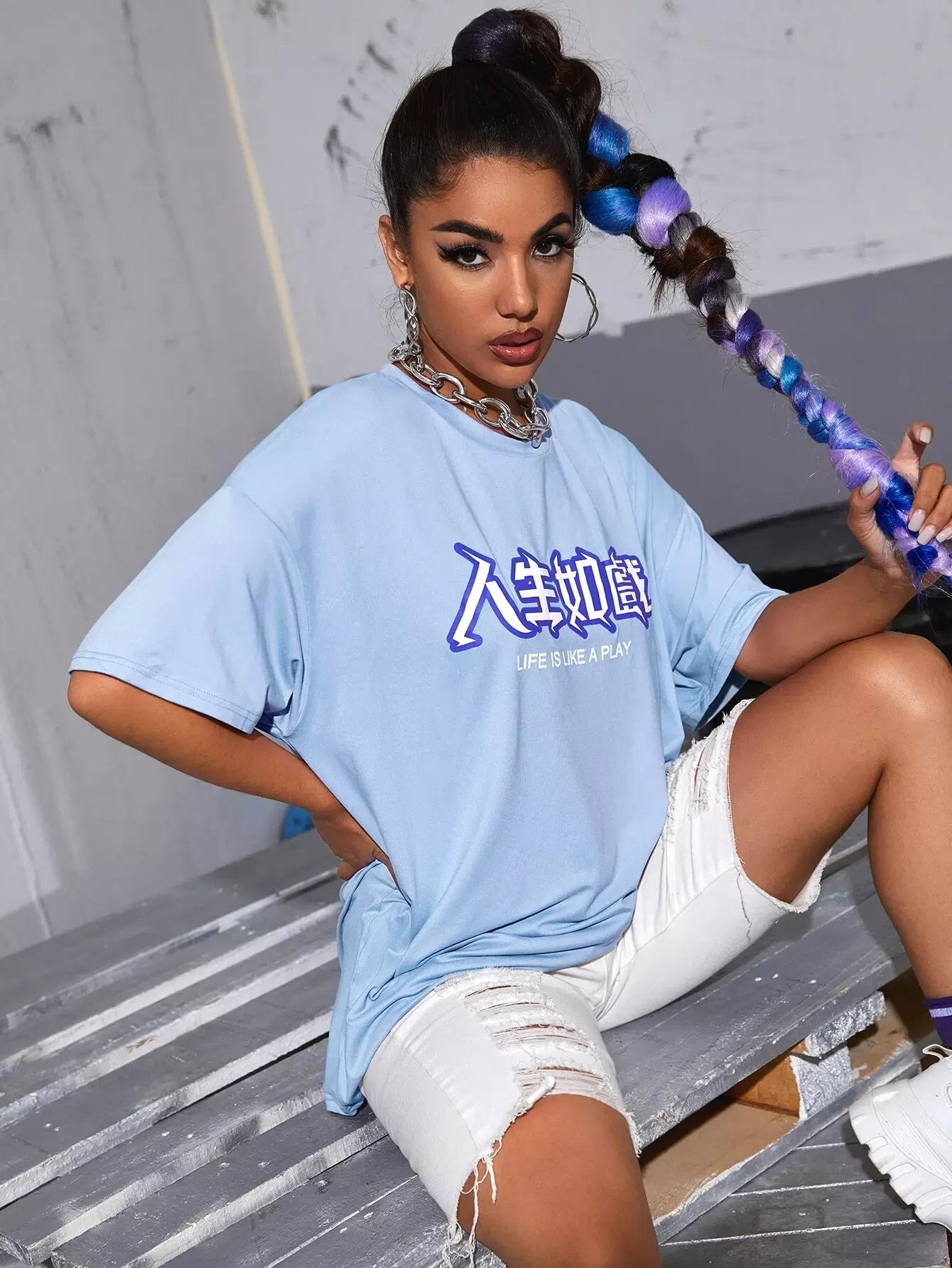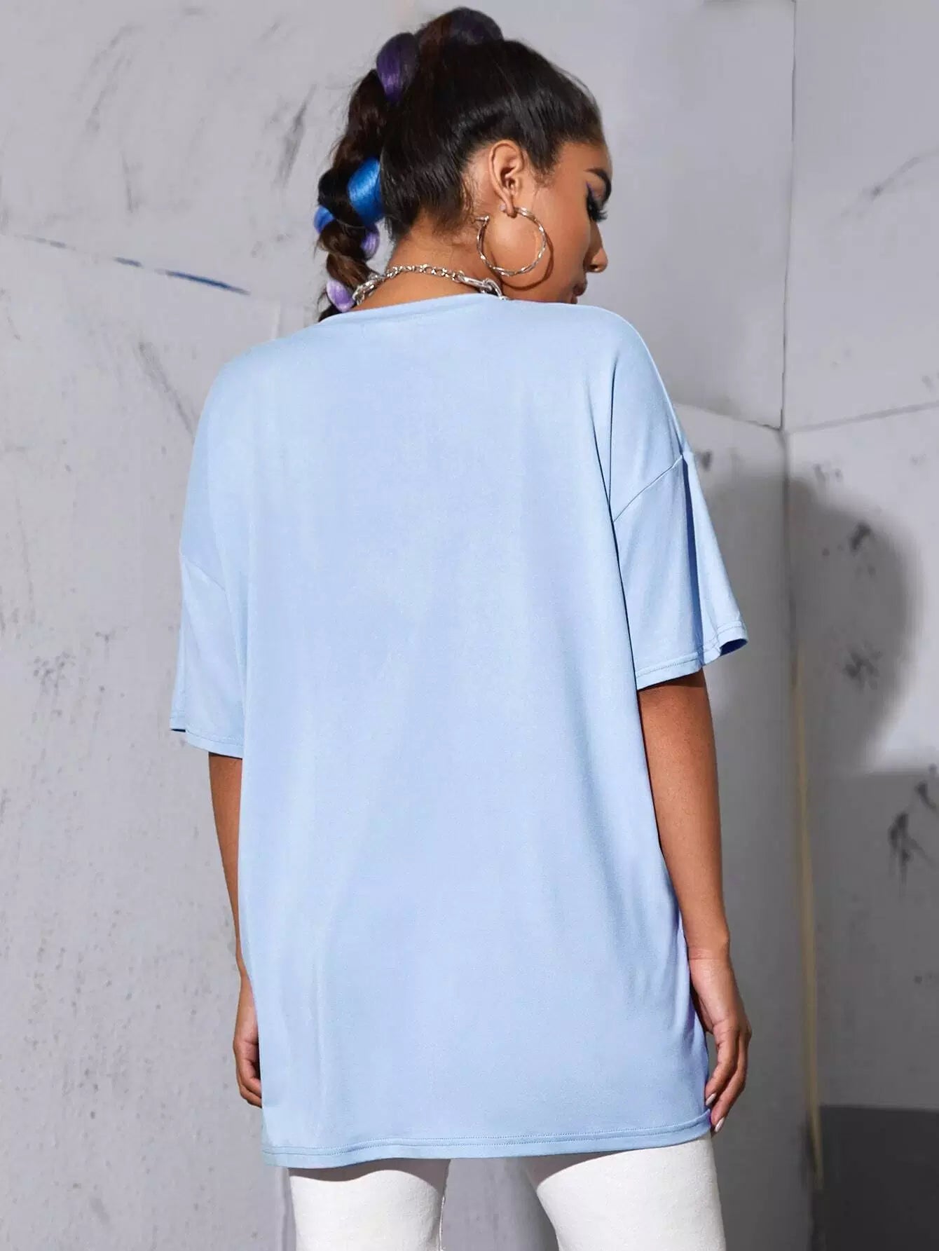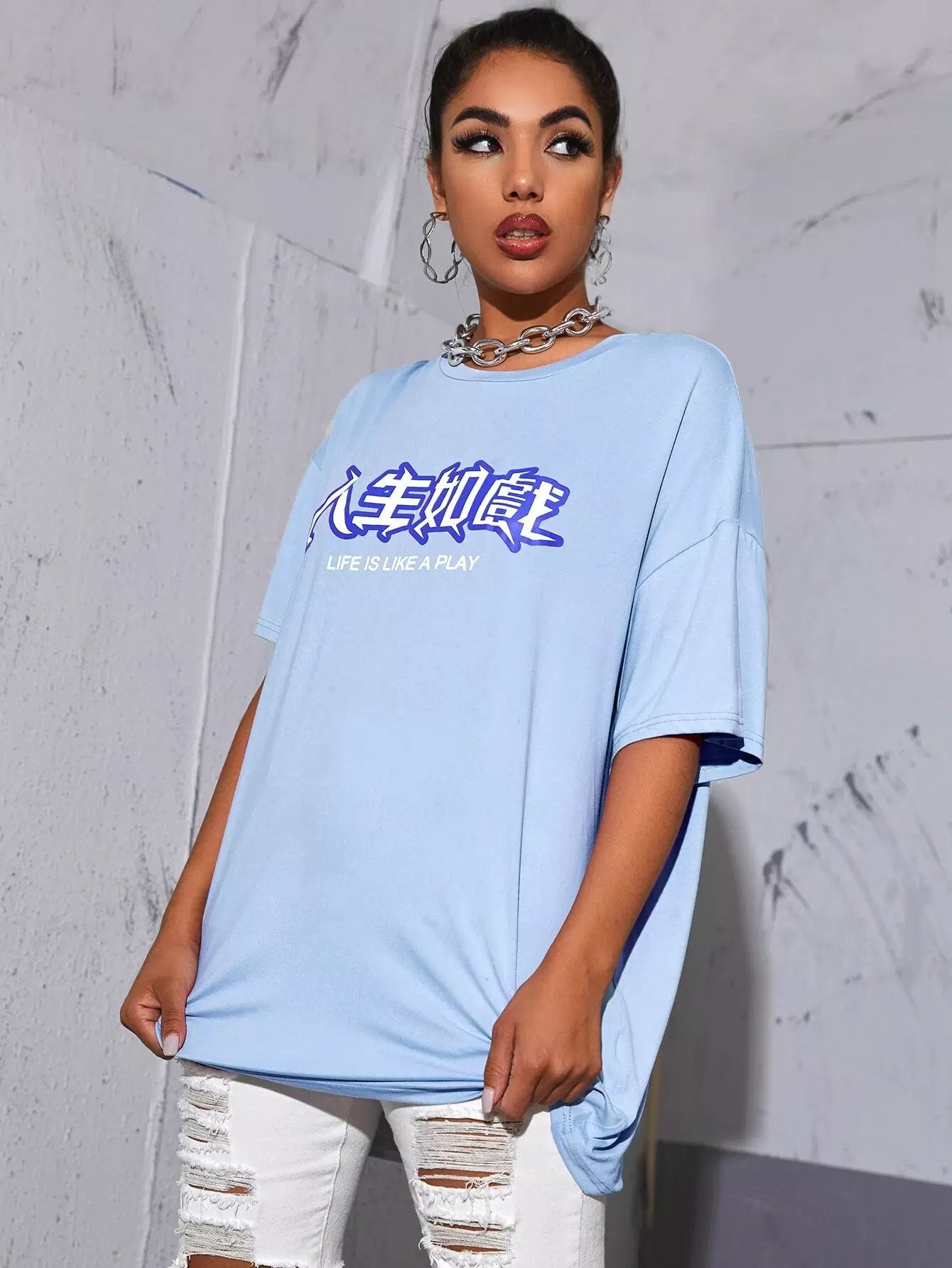 تي شيرت صيني منسدل الكتف ذو شعار صيني كبير الحجم