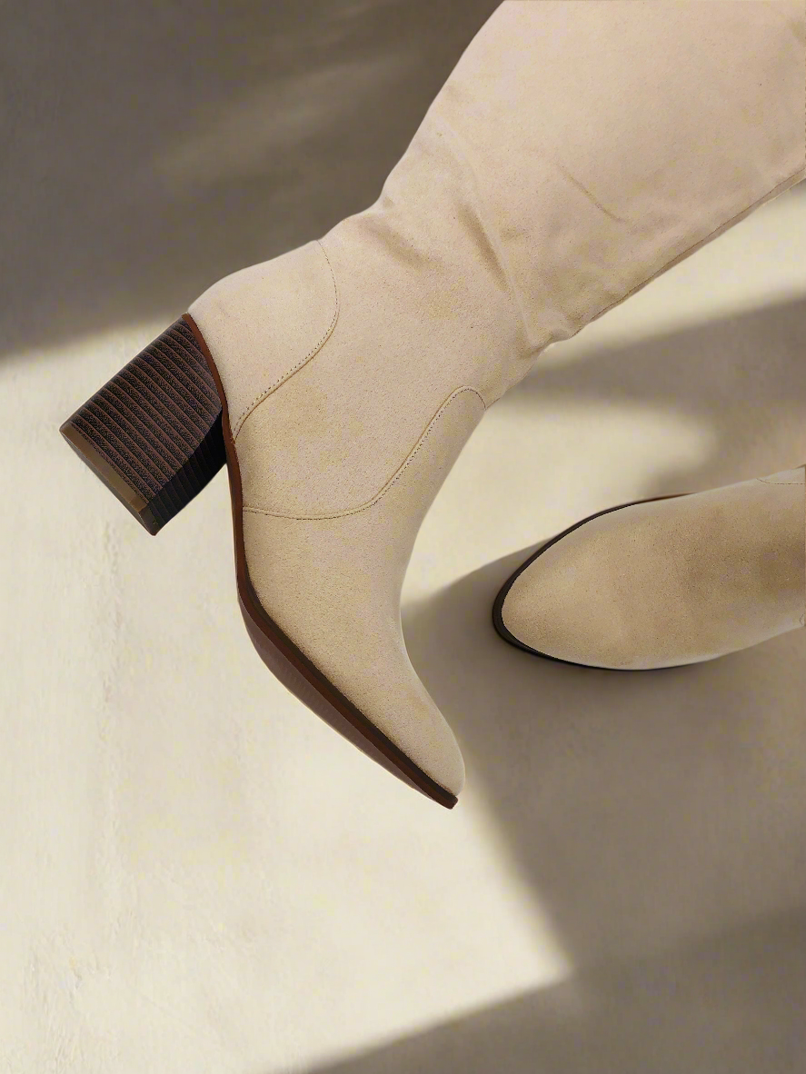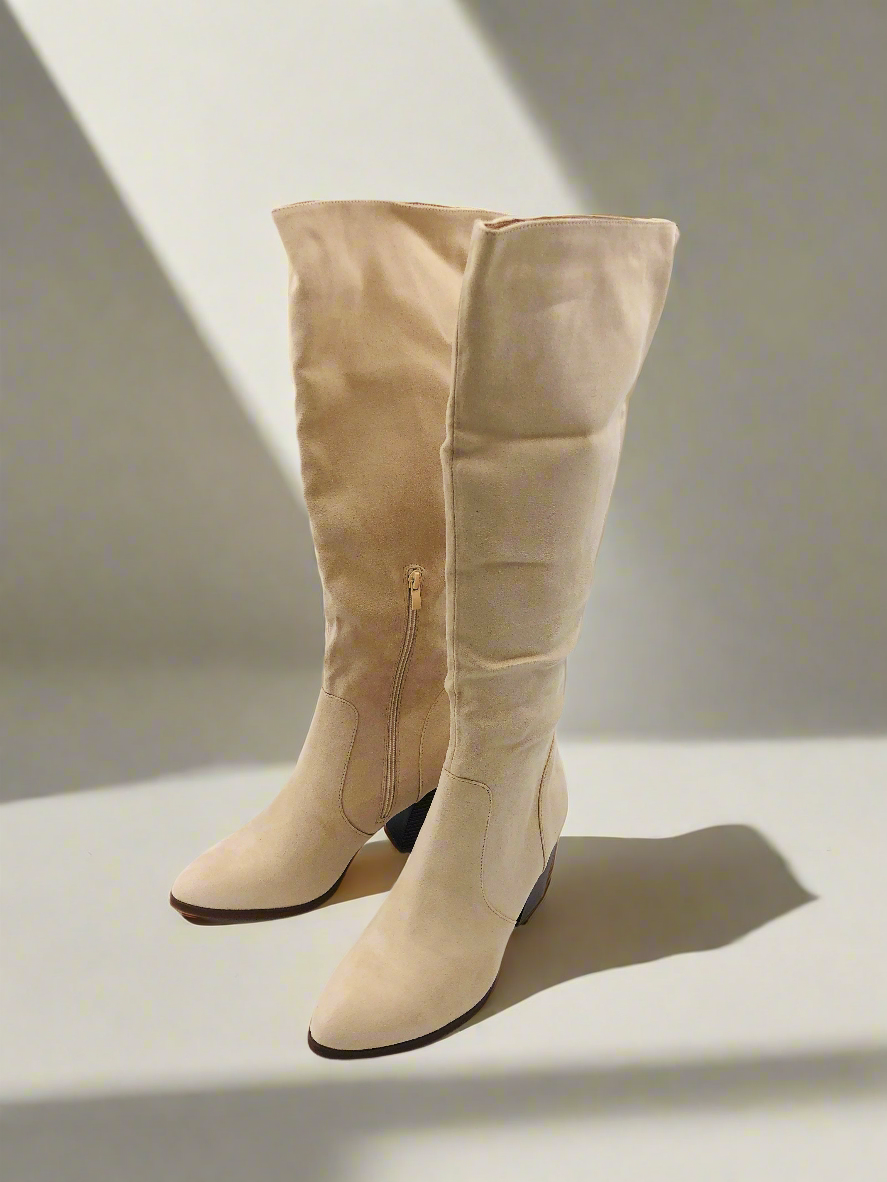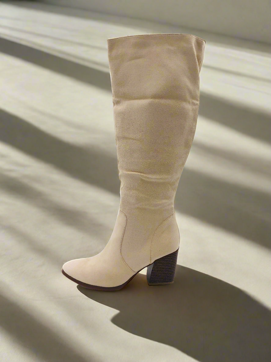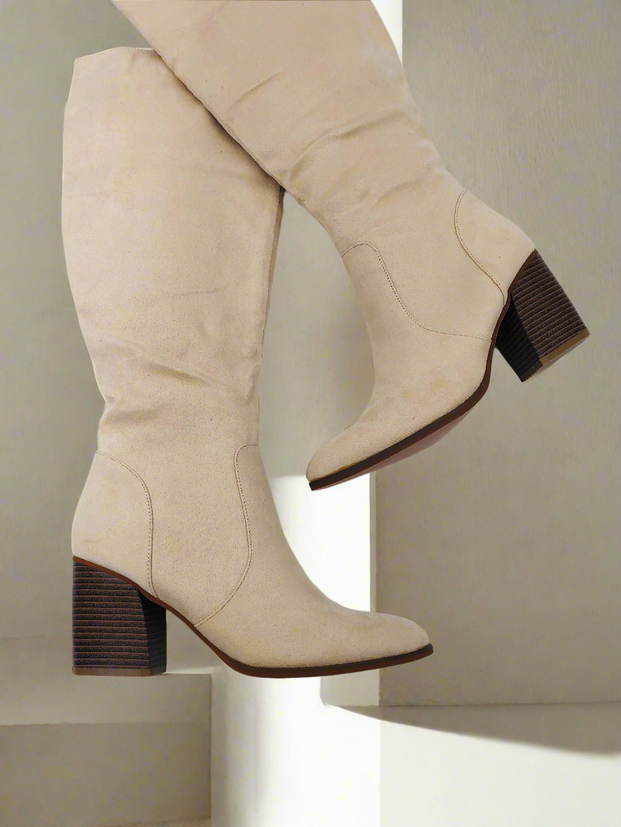 جزمة طويلة بكعب عريض - بيج