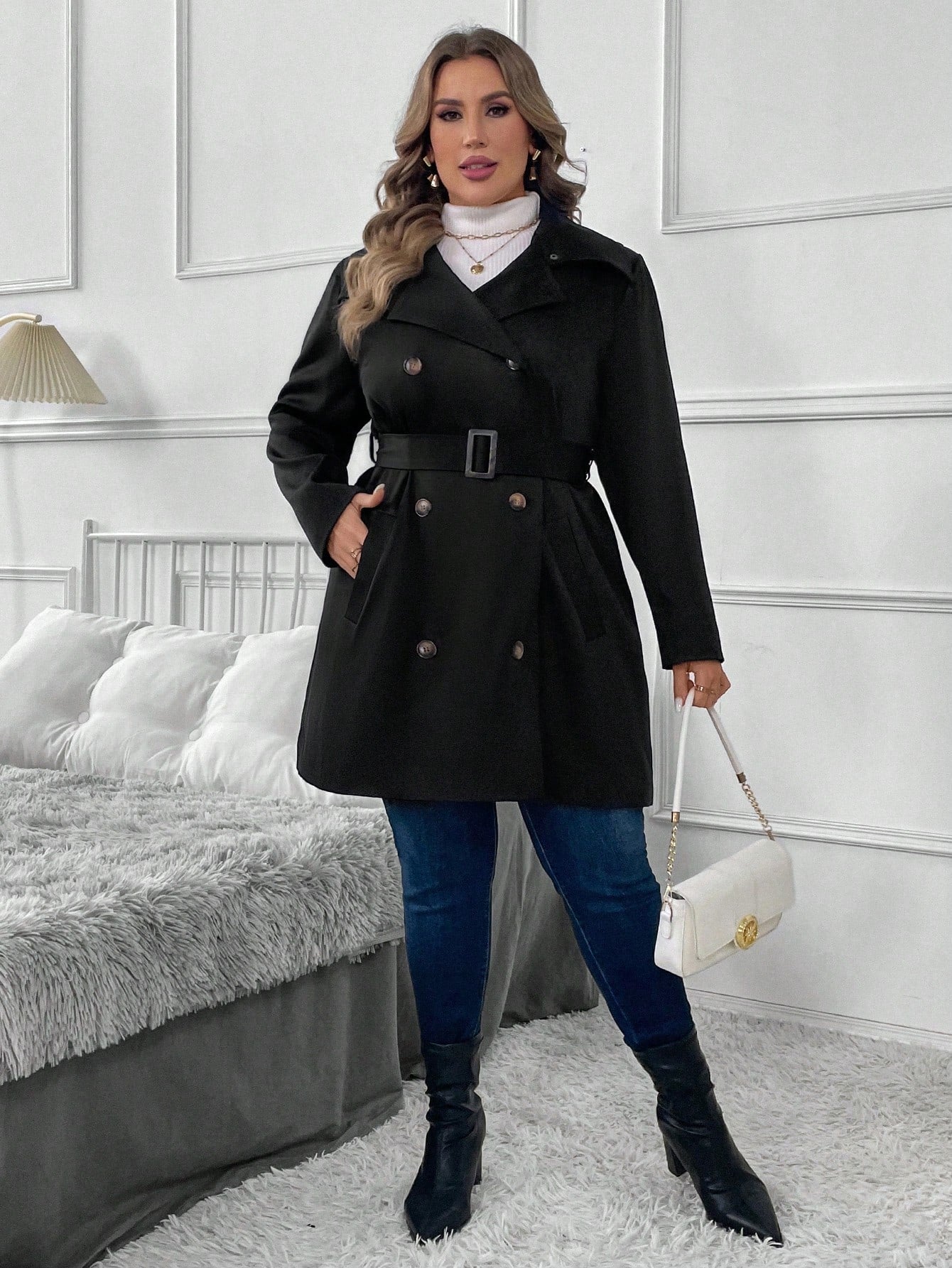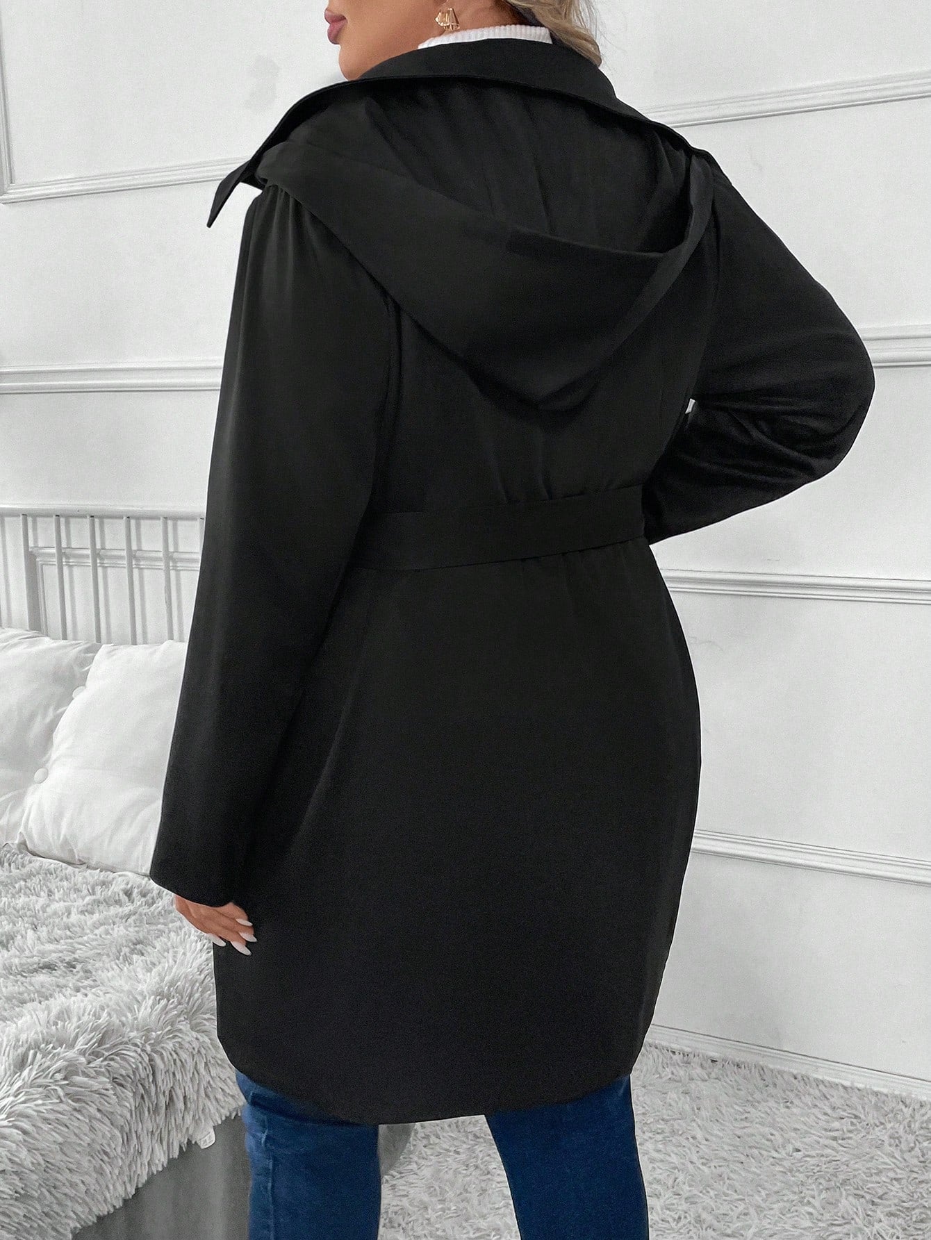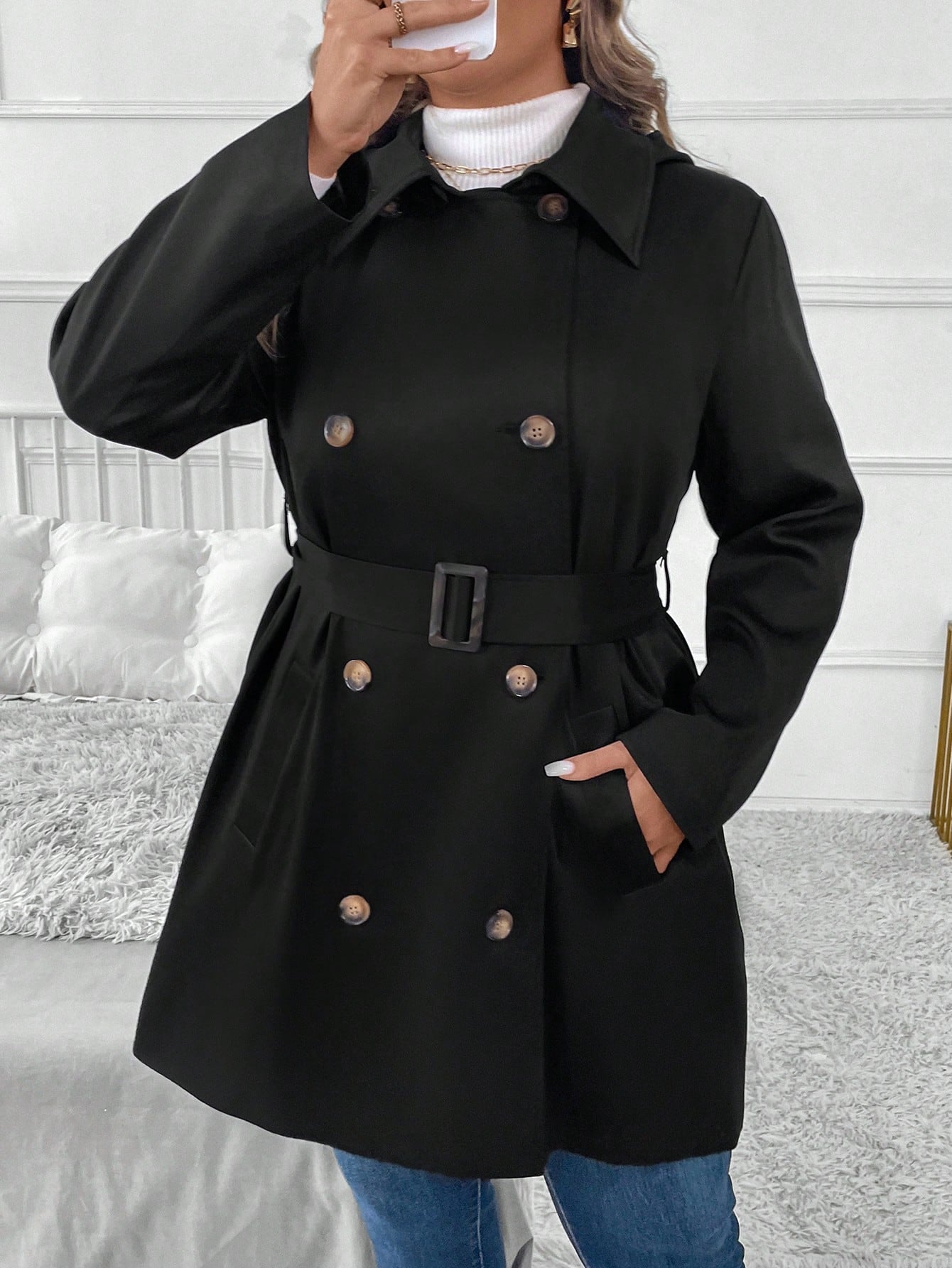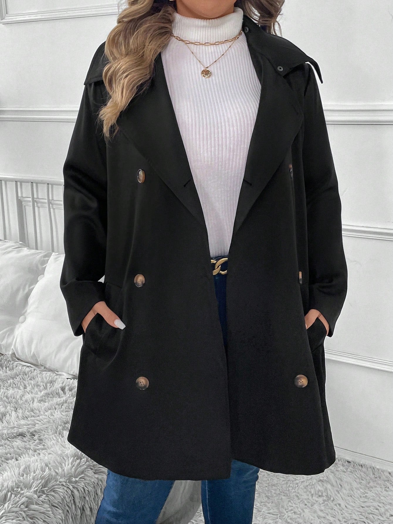 جاكيت كاجوال كلاسيكي بمقاسات كبيرة، سادة، بأزرار أمامية، بأكمام طويلة، بتصميم بسيط وأزرار أمامية.