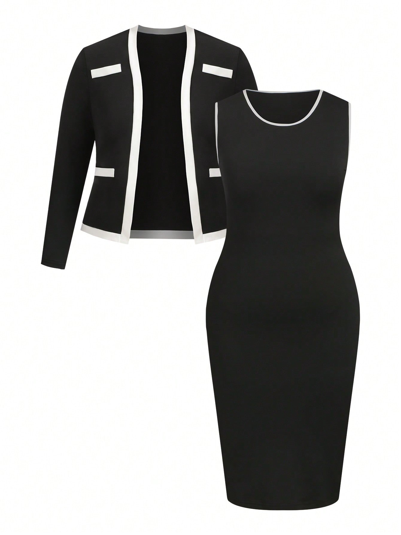 Clasi Plus Size Women Contrast Color Block Sleeveless Dress & Long Sleeve Cardigan Knitted Casual Outfit,