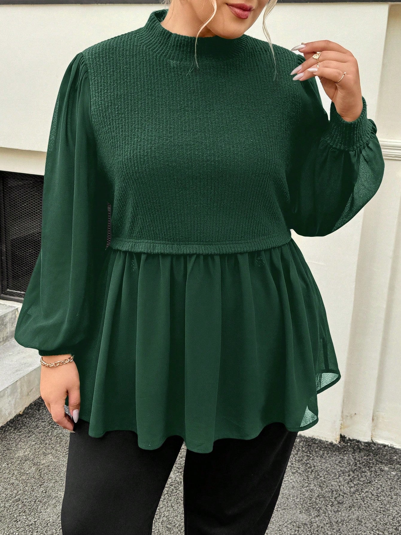 قميص كلاسي بلس سايز نسائي أسود بأكمام طويلة وياقة، بلوزة متعددة الطبقات مناسبة للخريف