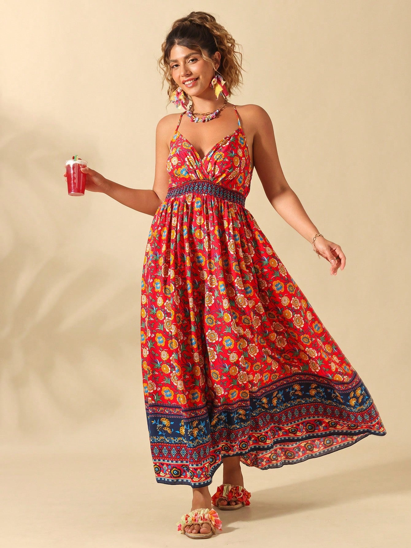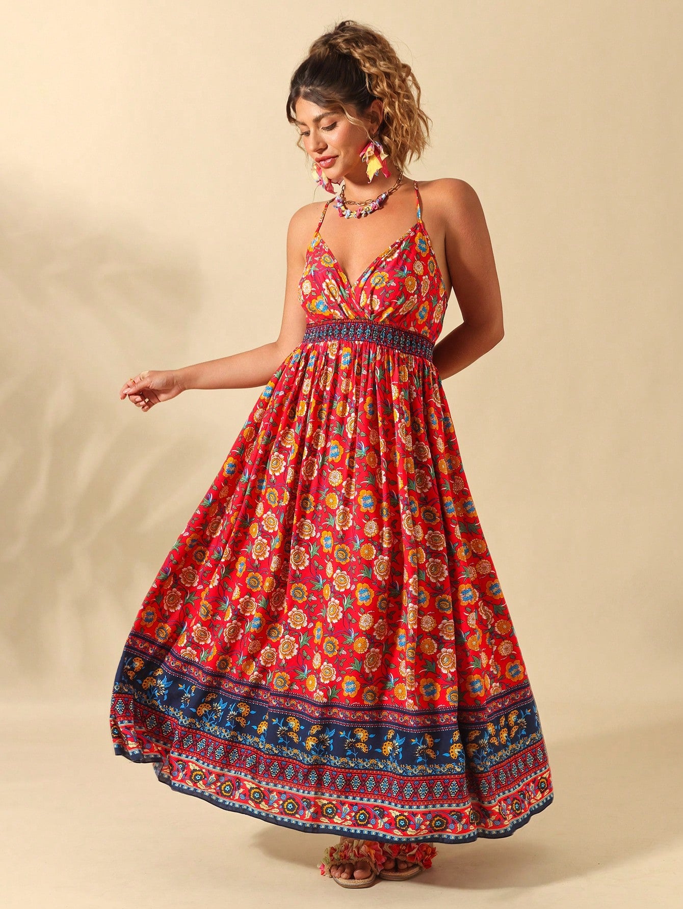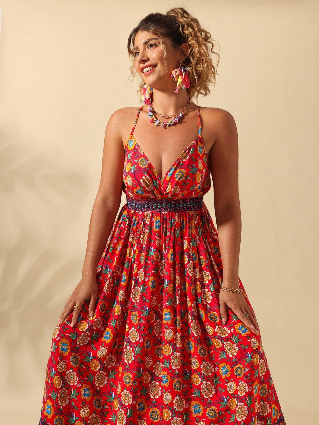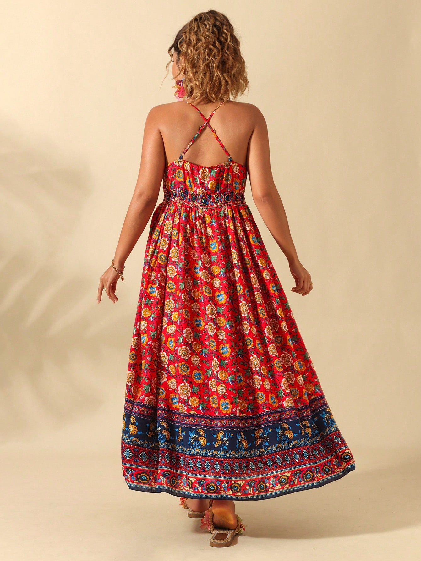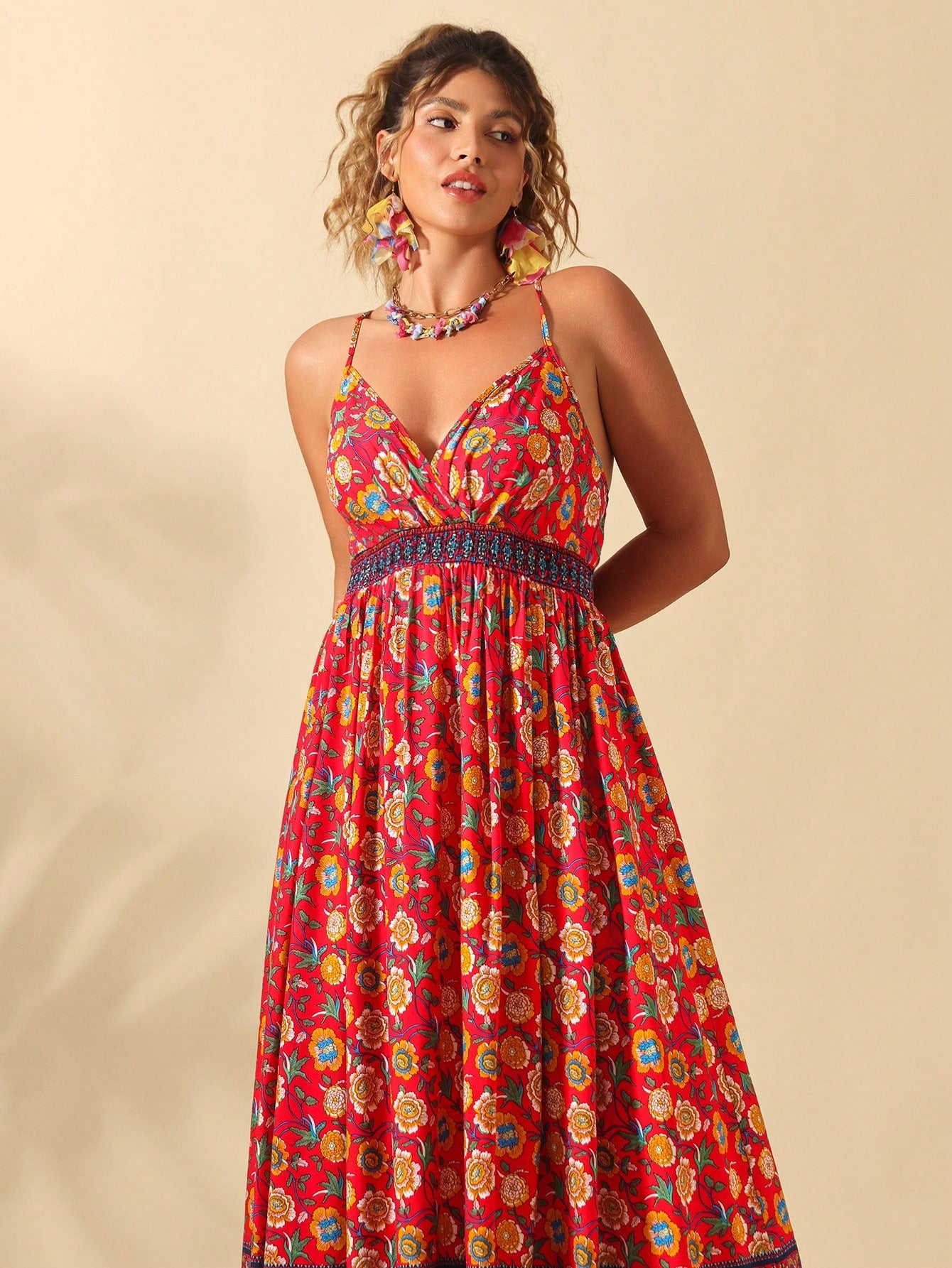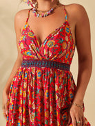 فستان سليب نسائي من كلاسي، مقاسات كبيرة، بياقة على شكل حرف V وطبعة زهور