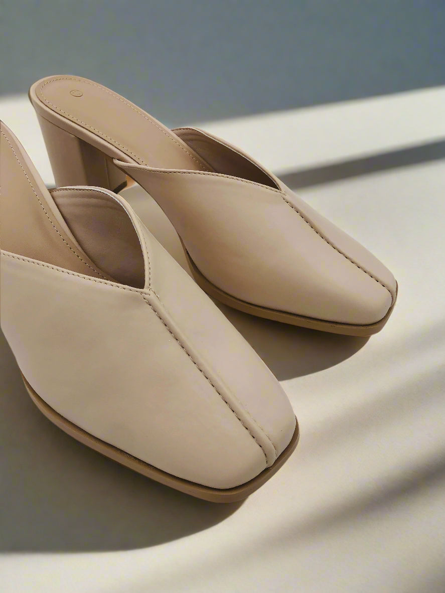 ميولز بيج فاتح كلاسيكية وأنيقة للنساء بكعب متوسط الارتفاع، بتصميم مريح سهل الارتداء ومقدمة مغلقة. مثالية للمكتب والمشي.
