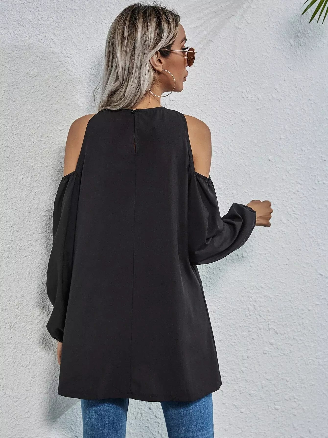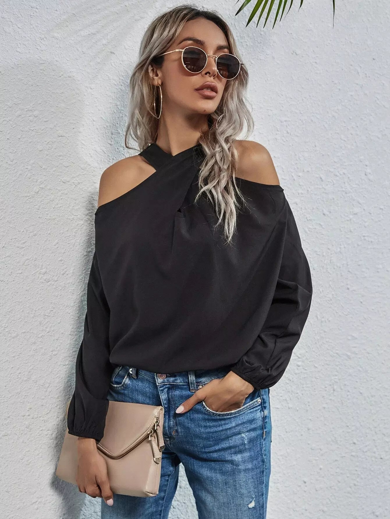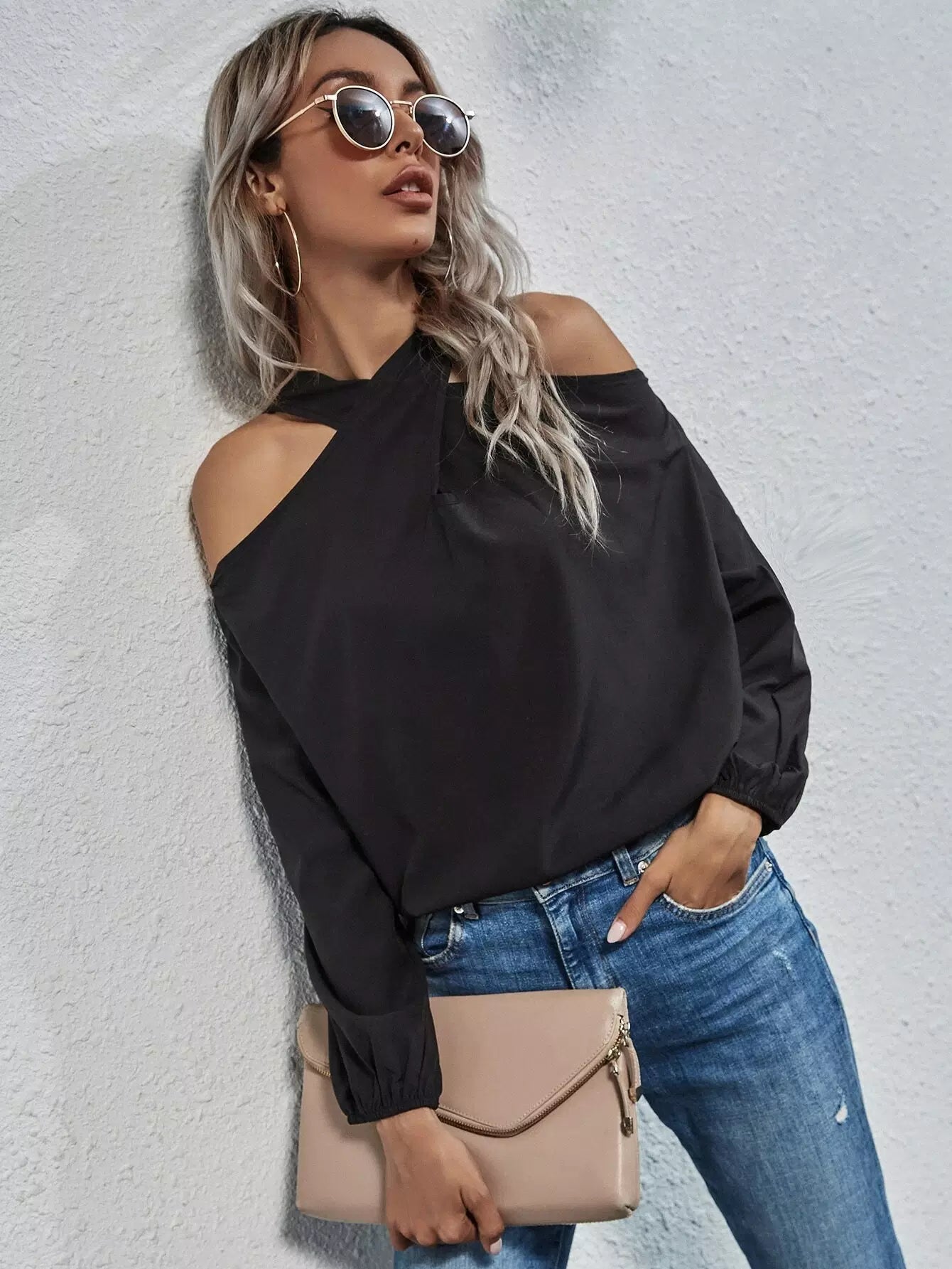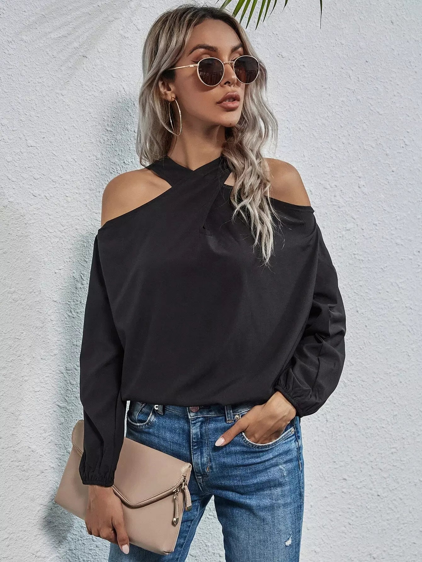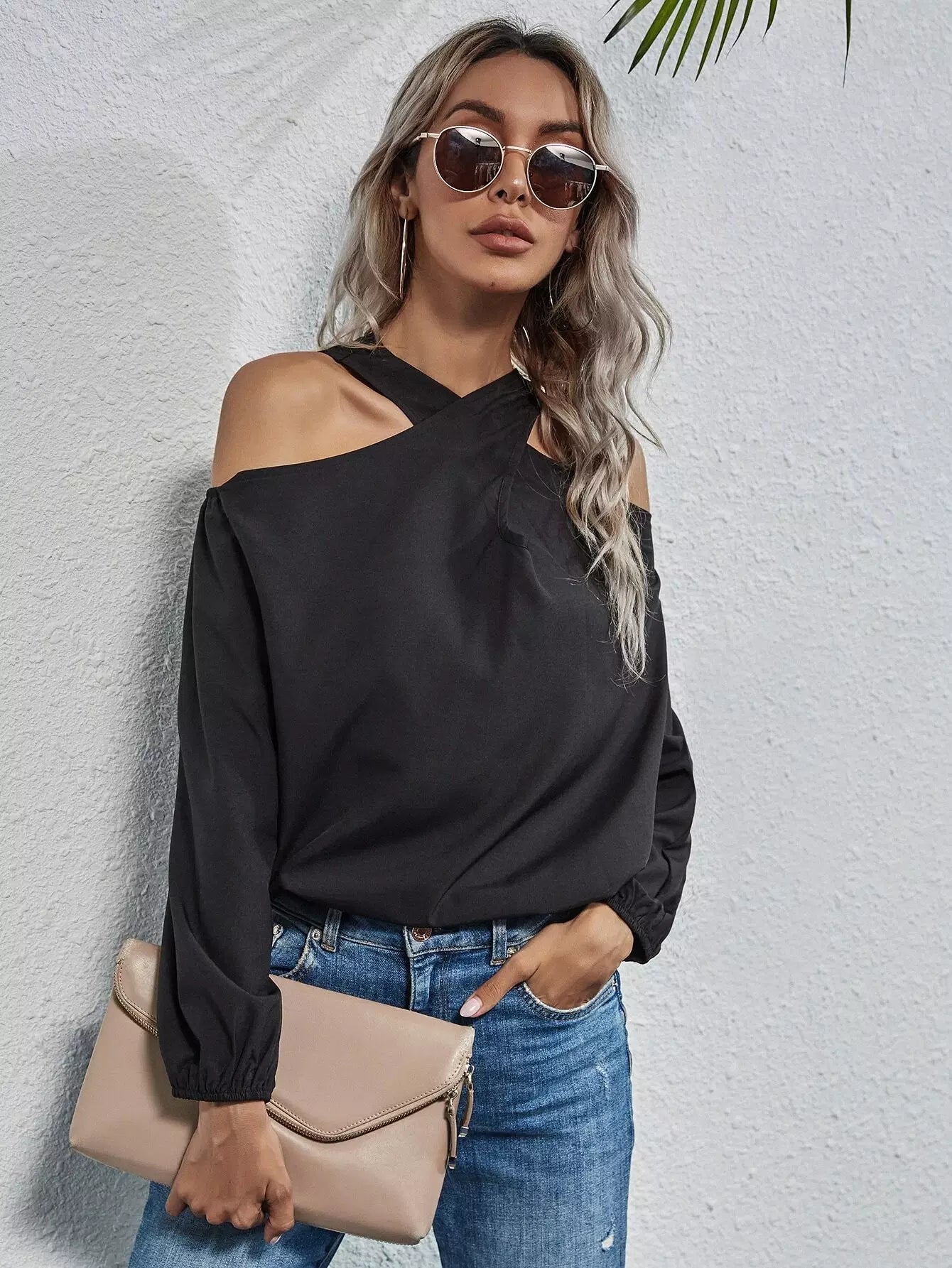 بلوزة بأكتاف باردة سادة طويلة طويلة الأكمام ذات أكتاف باردة