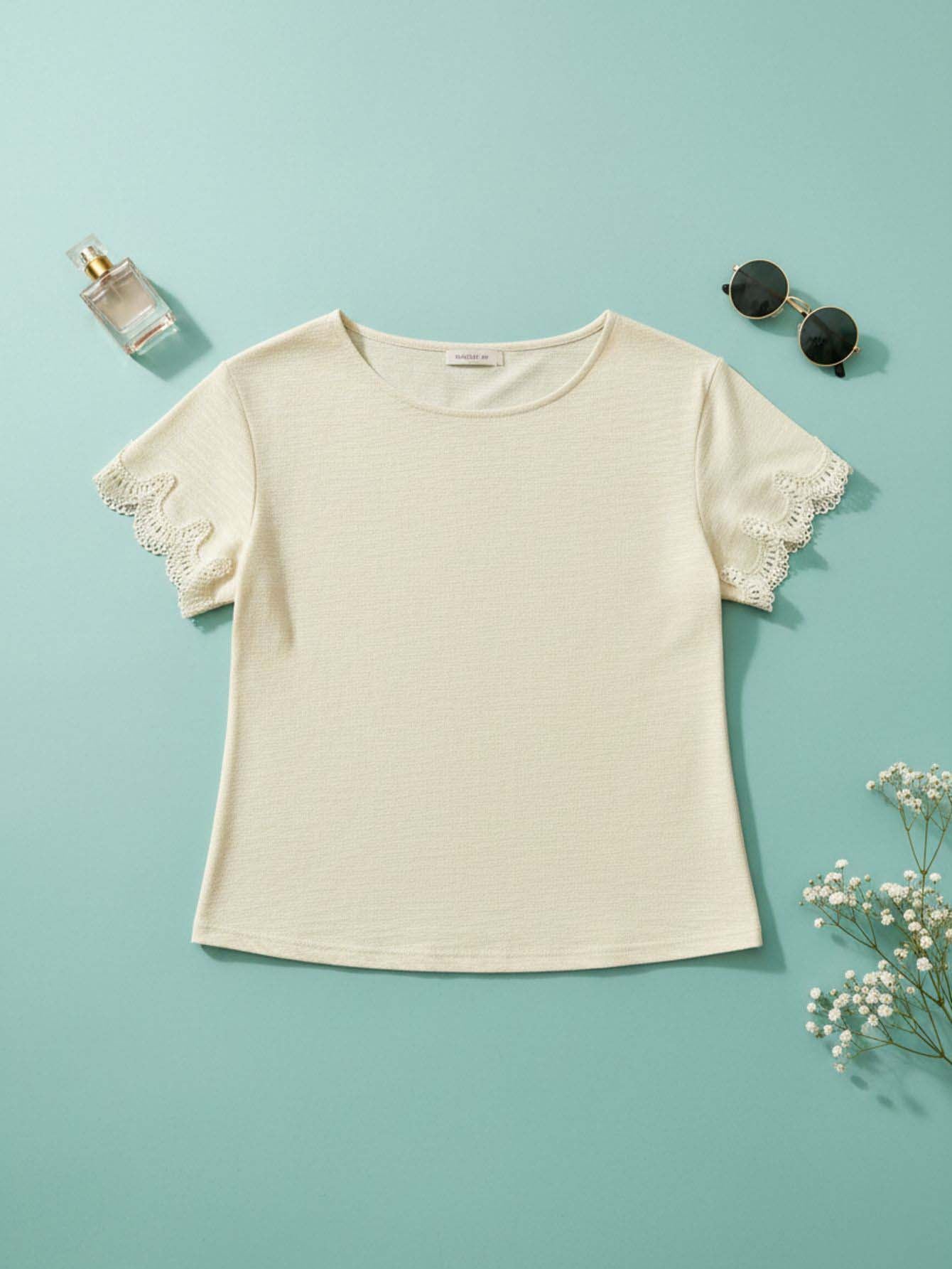 تي شيرت كروشيه بأكمام قصيرة كروشيه بلون مغاير