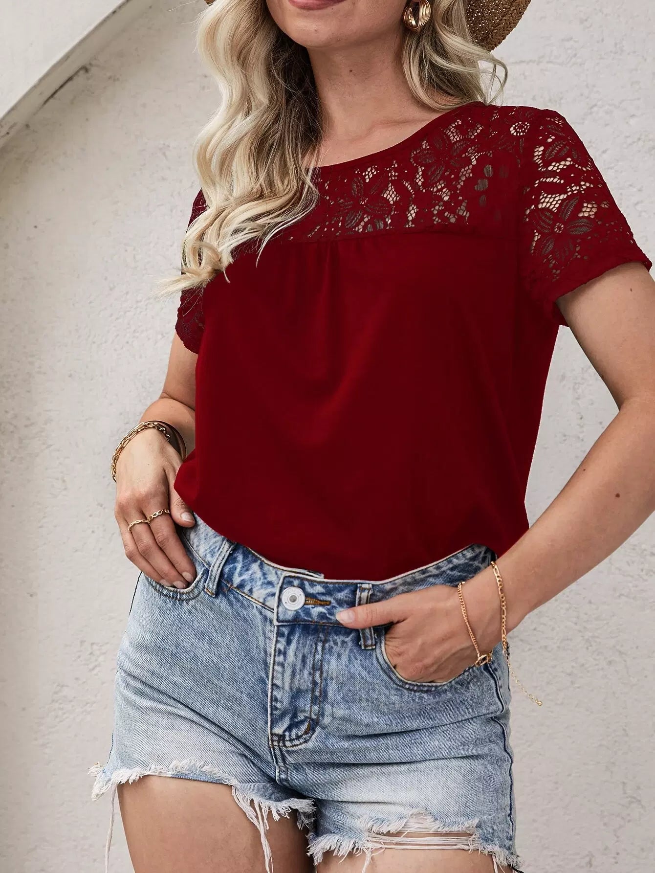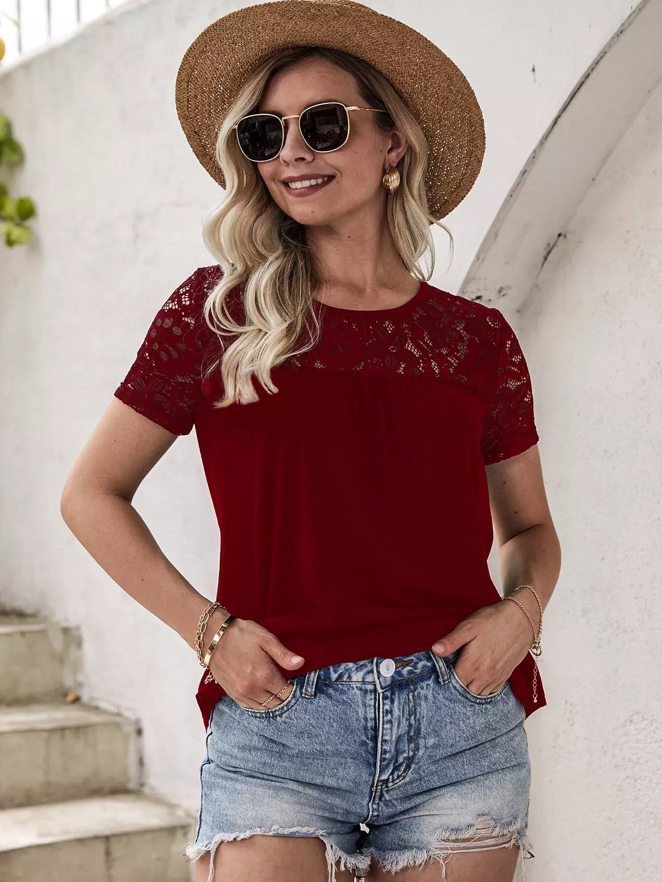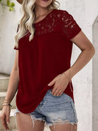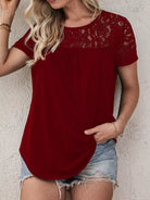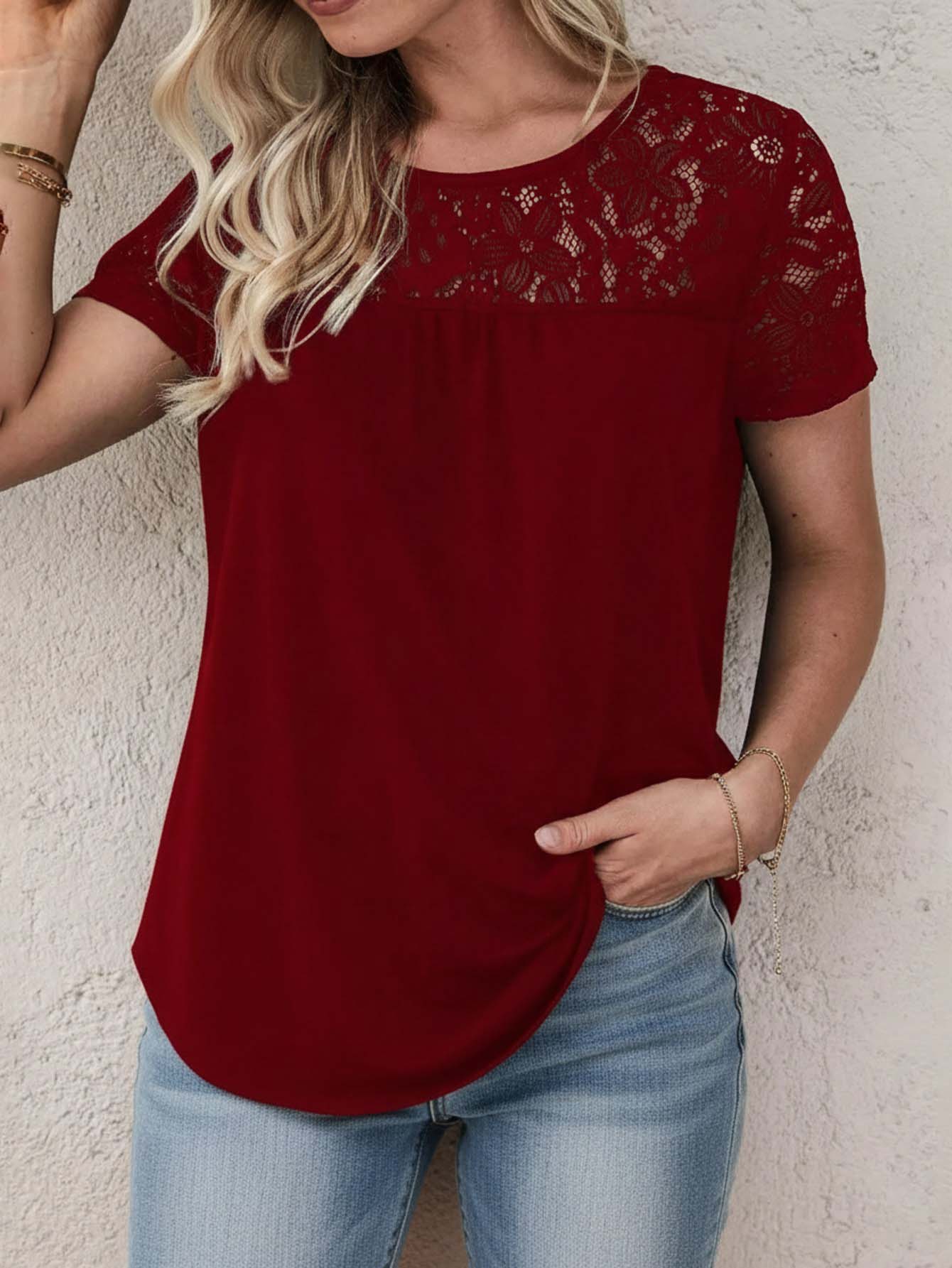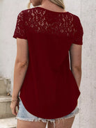 للنساء - تي شيرت بحاشية منحنية من الدانتيل المتباين