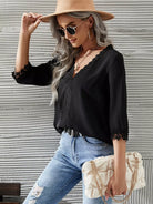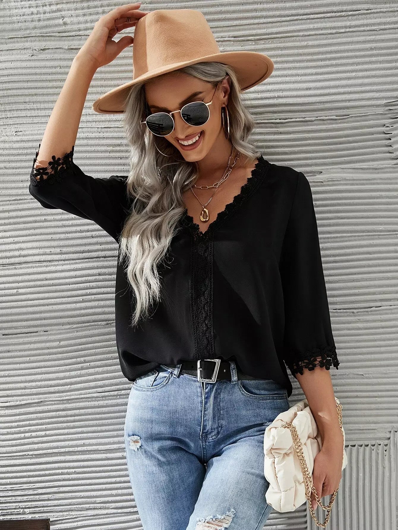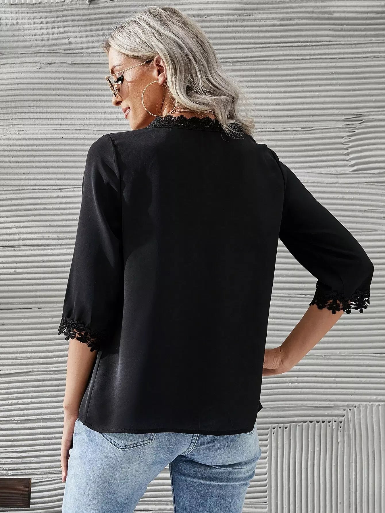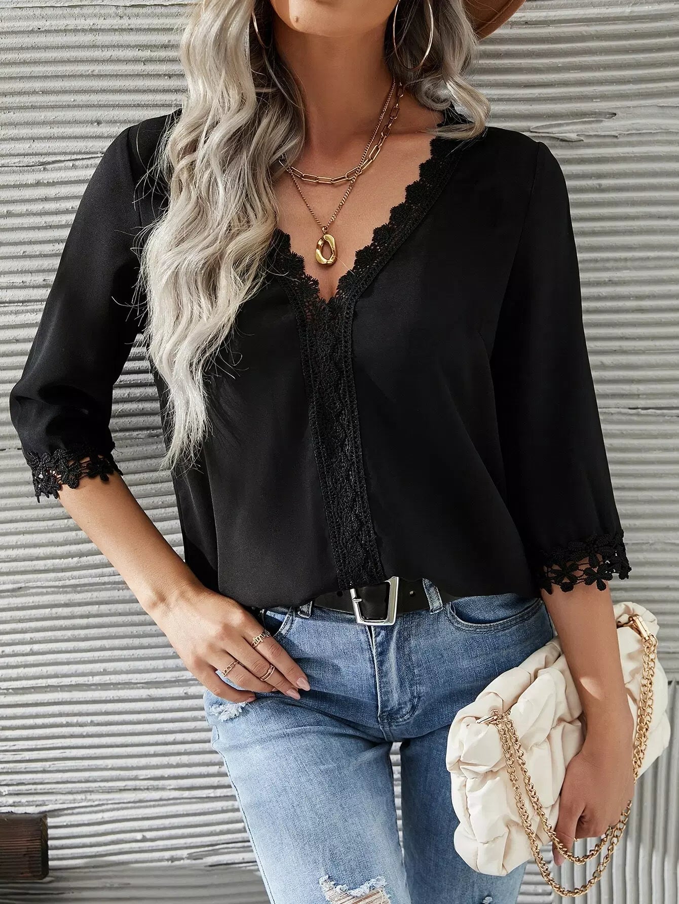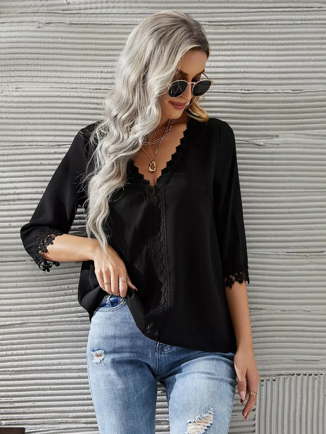 بلوزة بياقة على شكل V دانتيل بلون مغاير