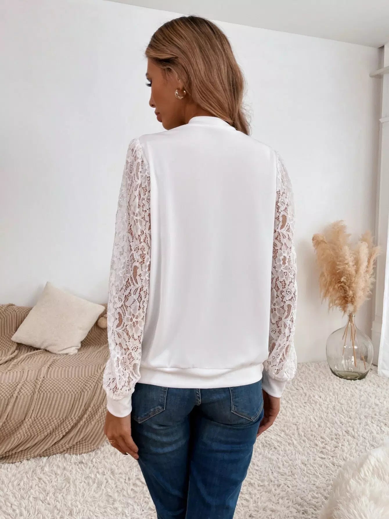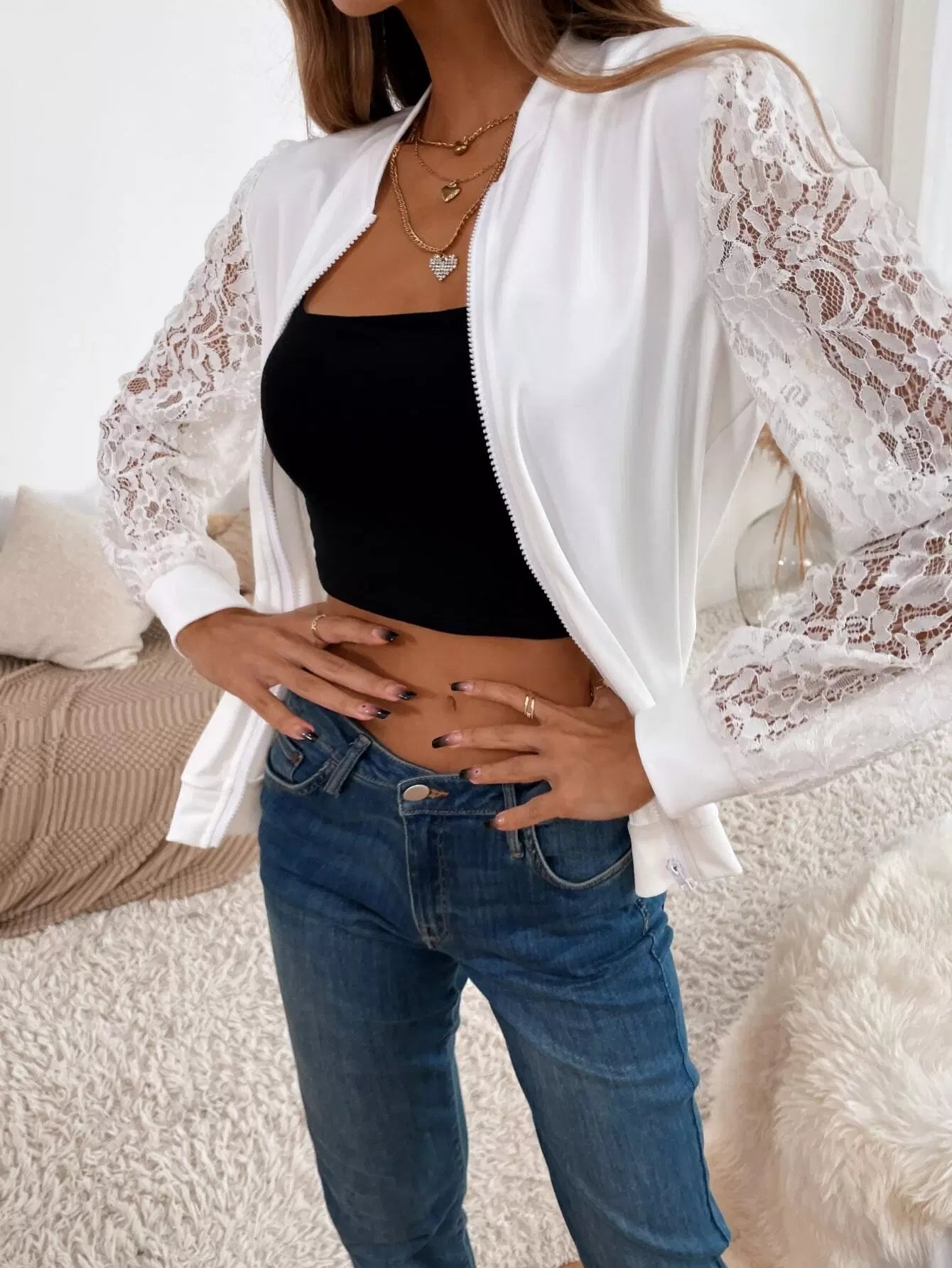 النساء - سترة بسحاب من الدانتيل المتباين