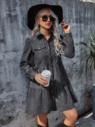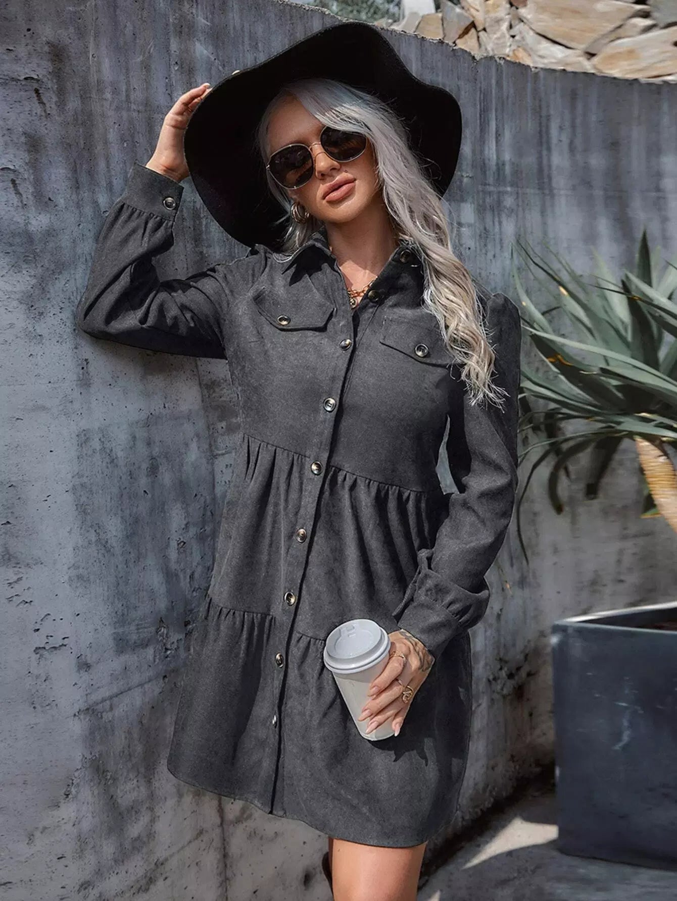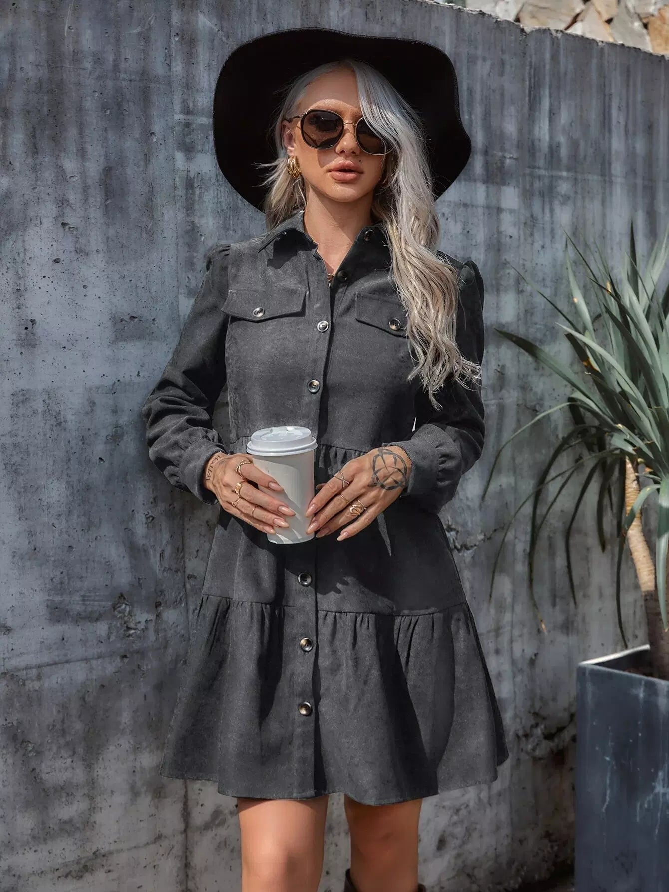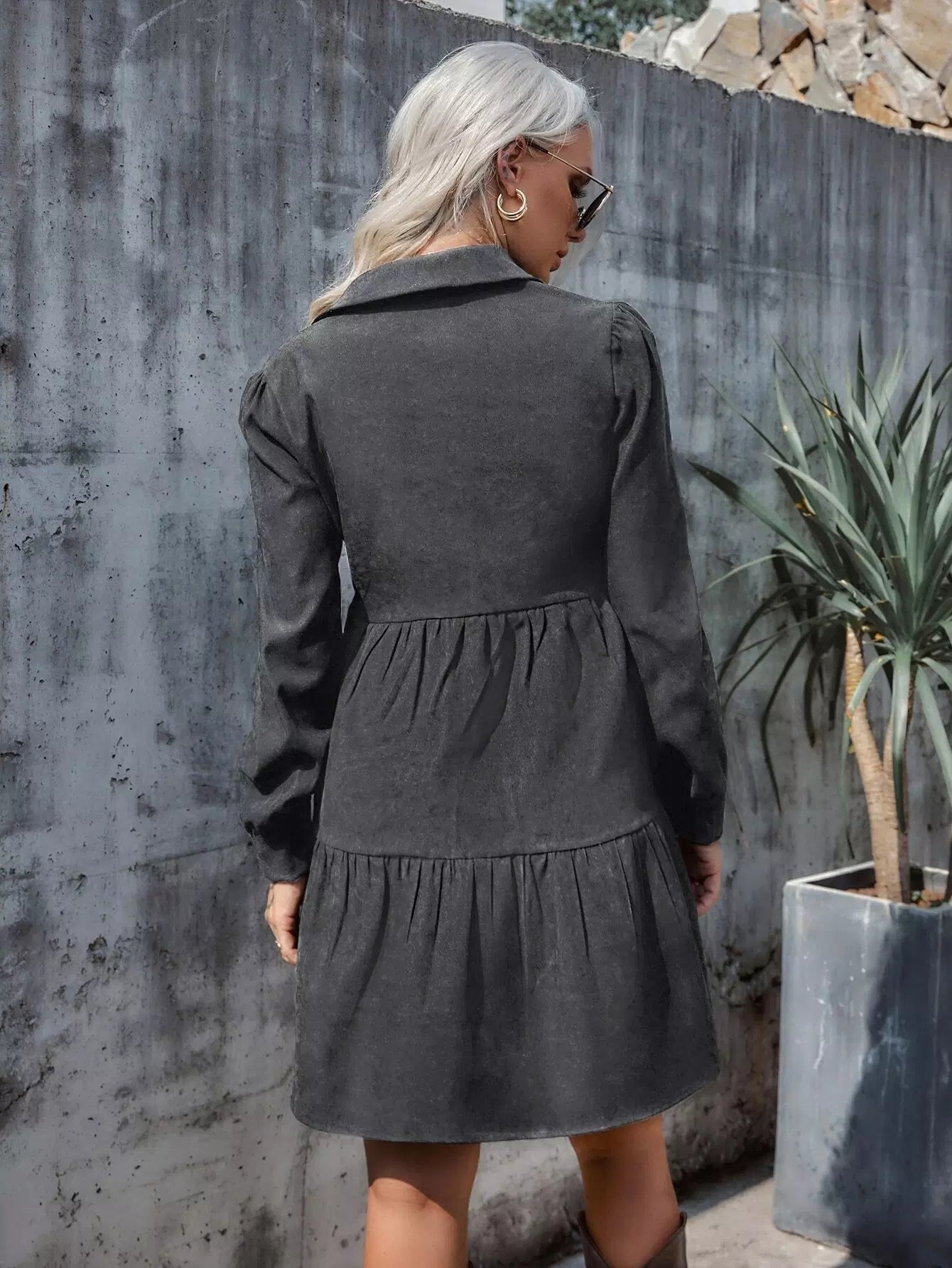 للنساء - فستان قصير بأكمام منتفخة وتفاصيل قلاب