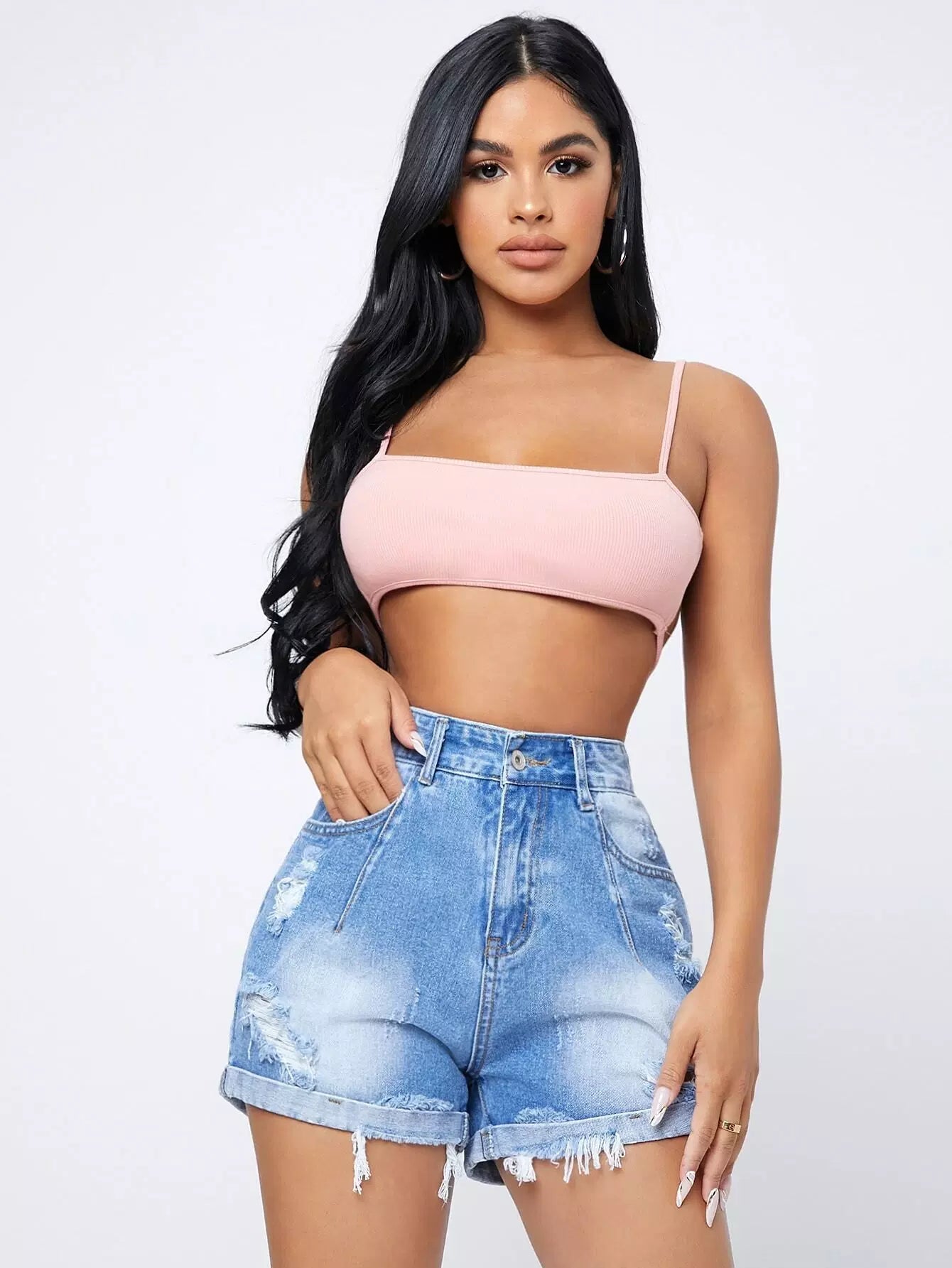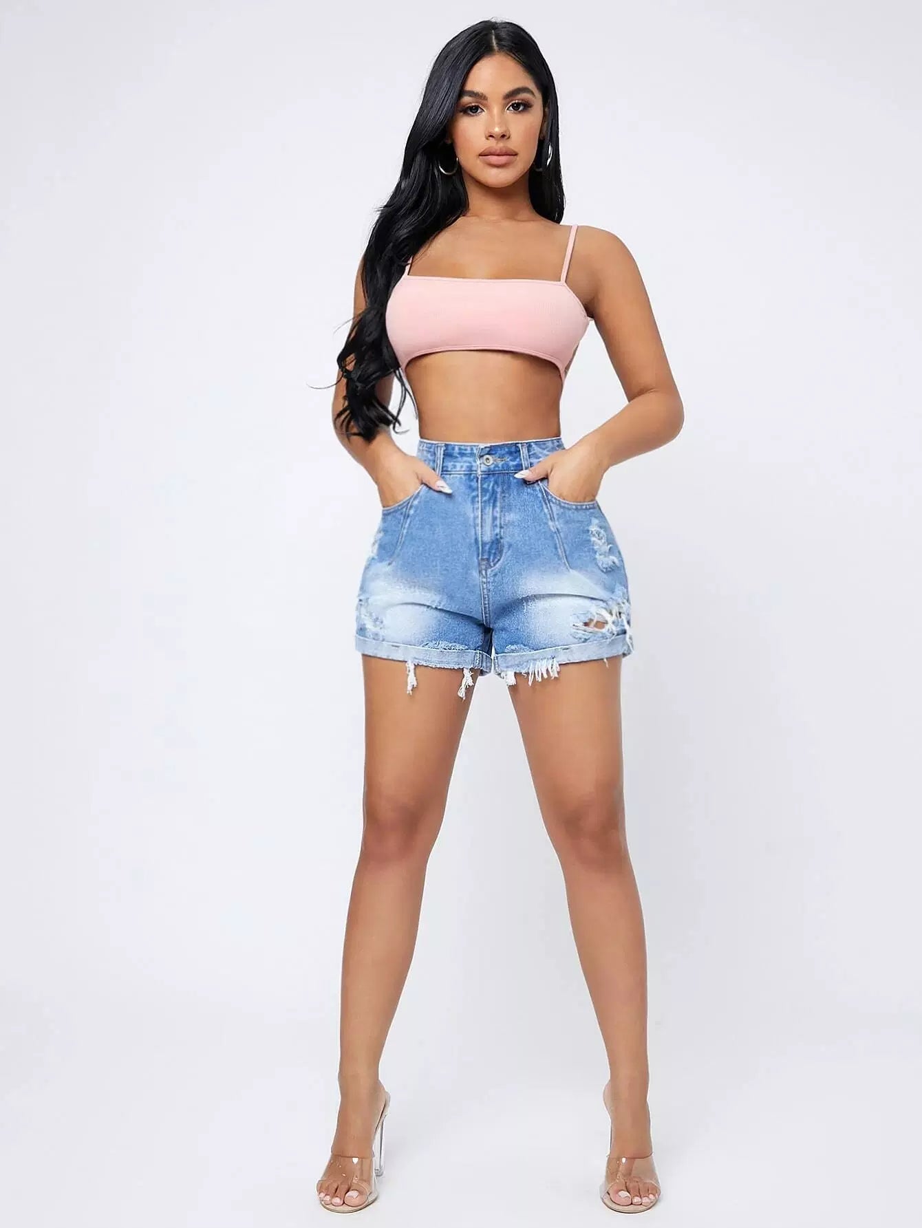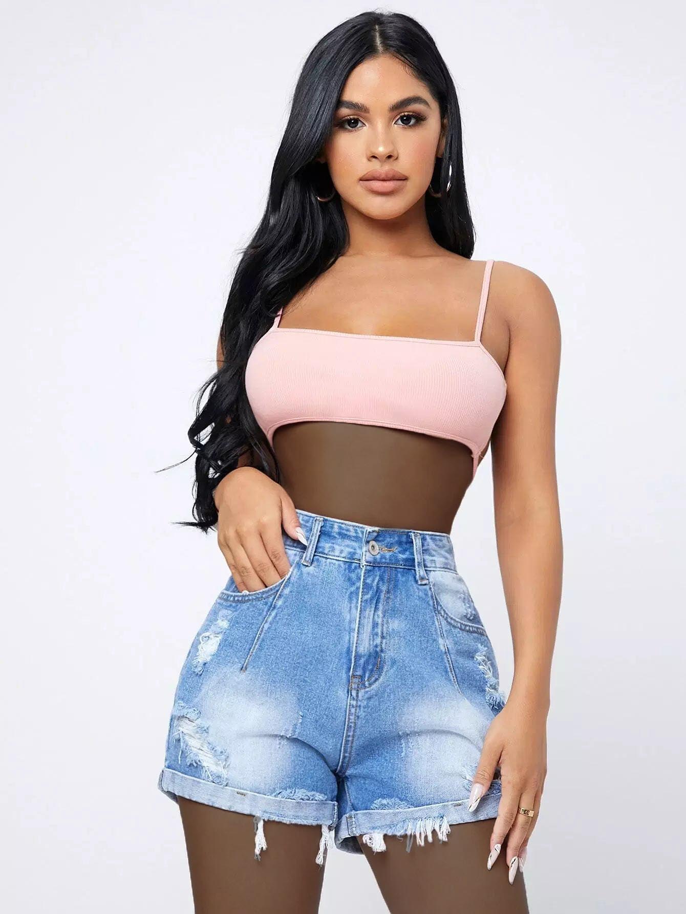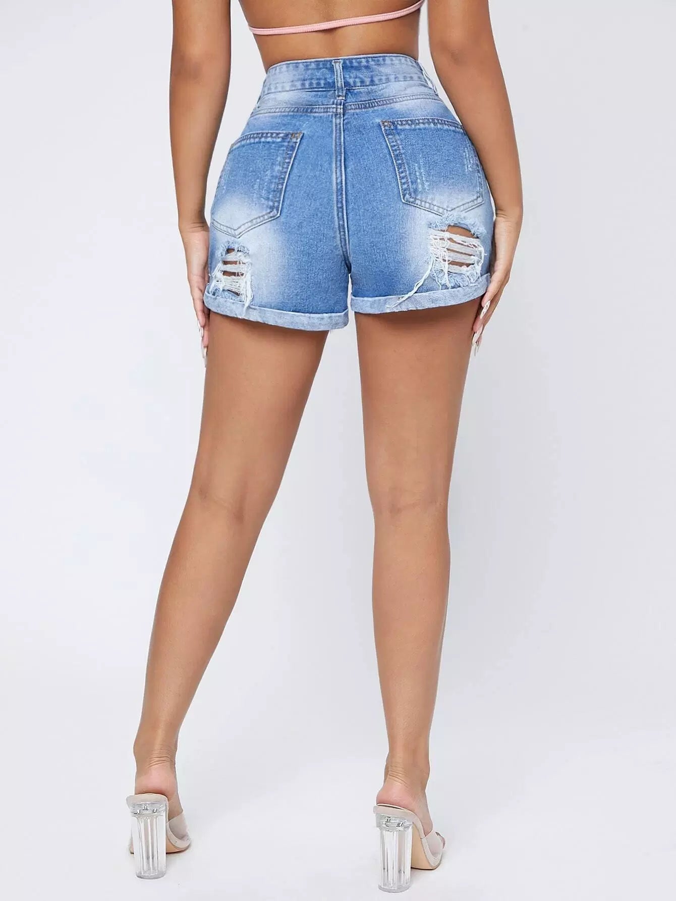 شورت دنيم ممزق عالي الخصر ومتعرج الخصر