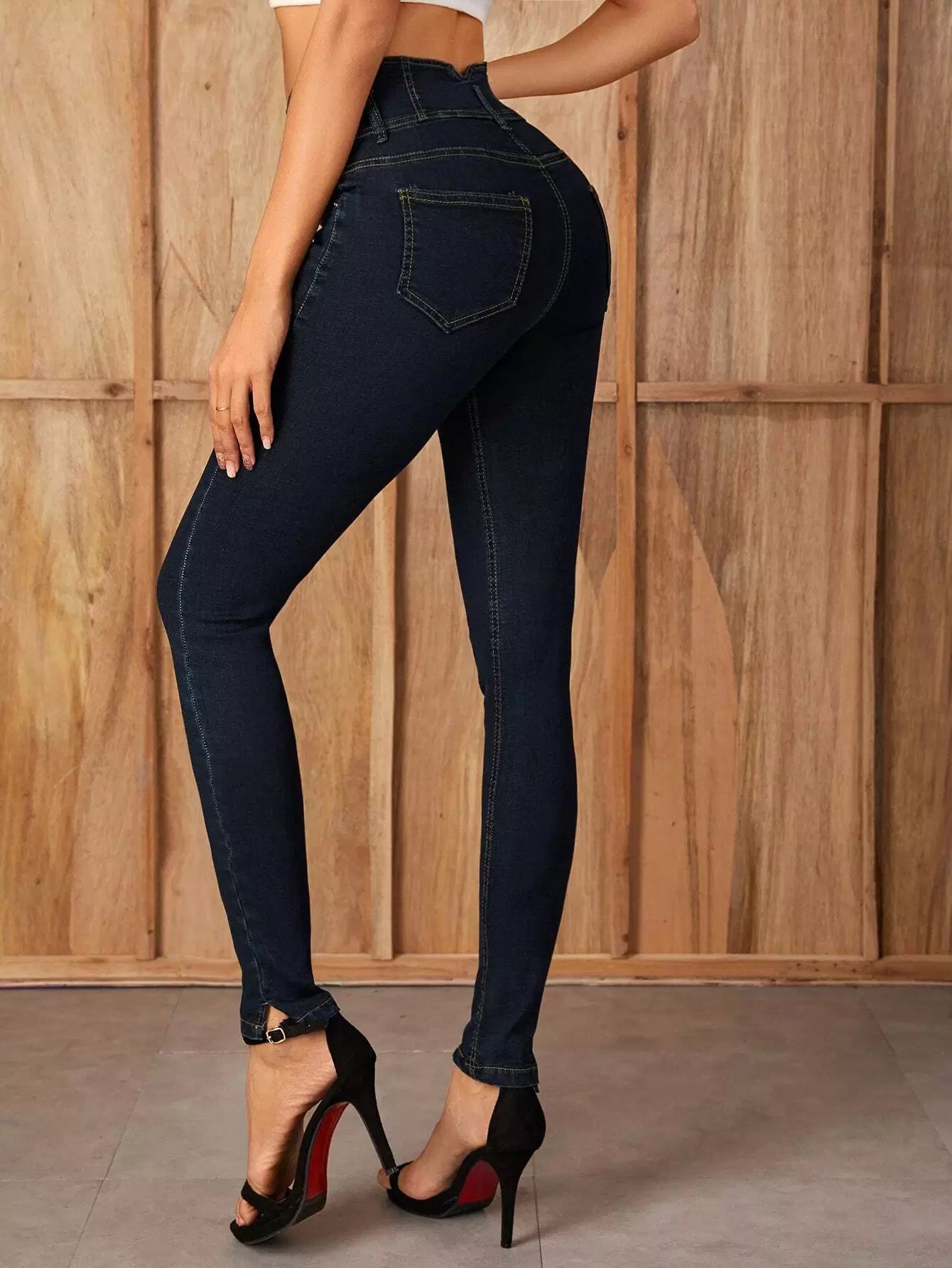 بنطال جينز جينز سكيني ضيق واسع الخصر عالي التمدد داكن اللون