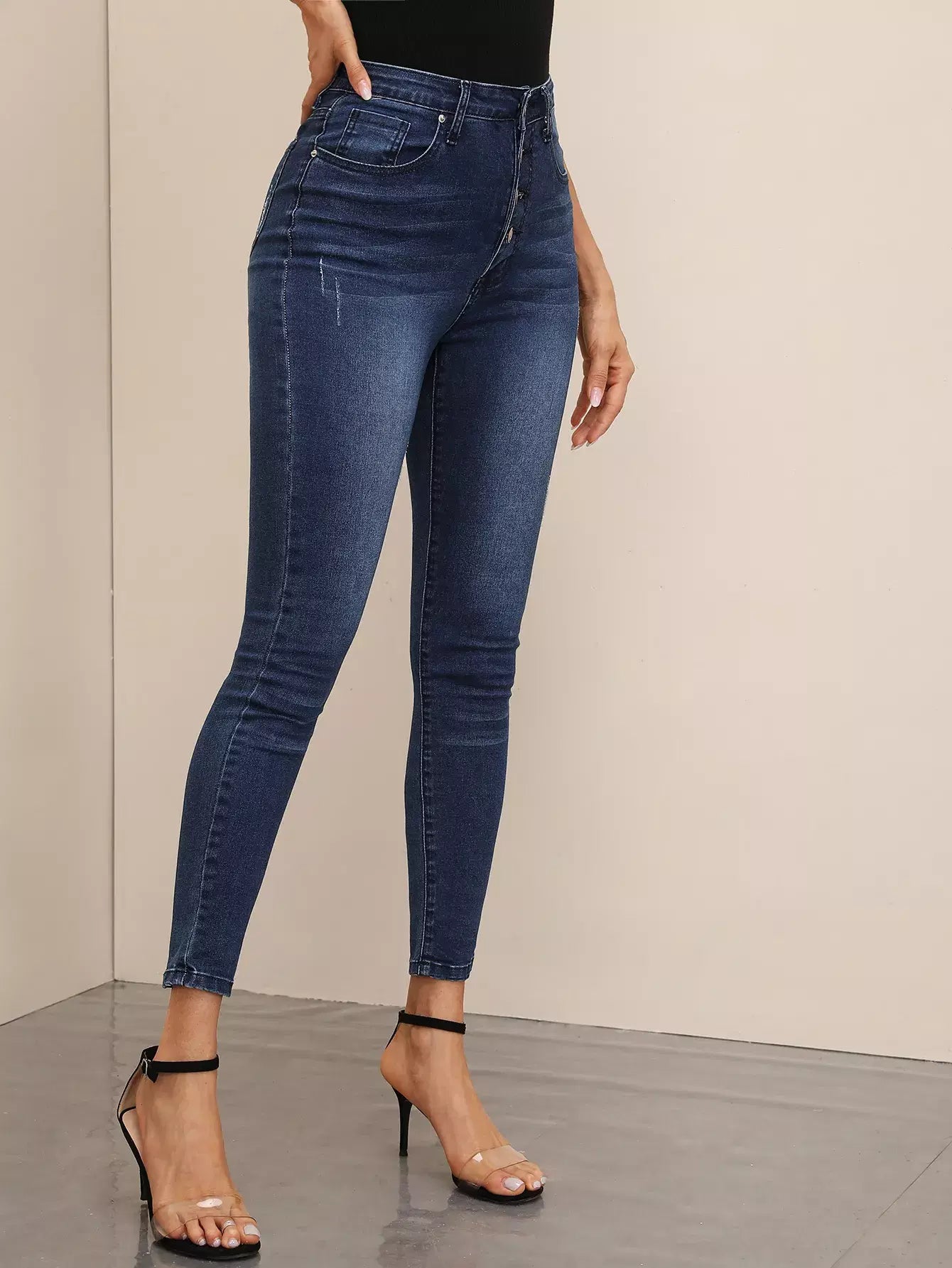 بنطلون جينز جينز سكيني عالي الخصر عالي التمدد بغسول داكن اللون