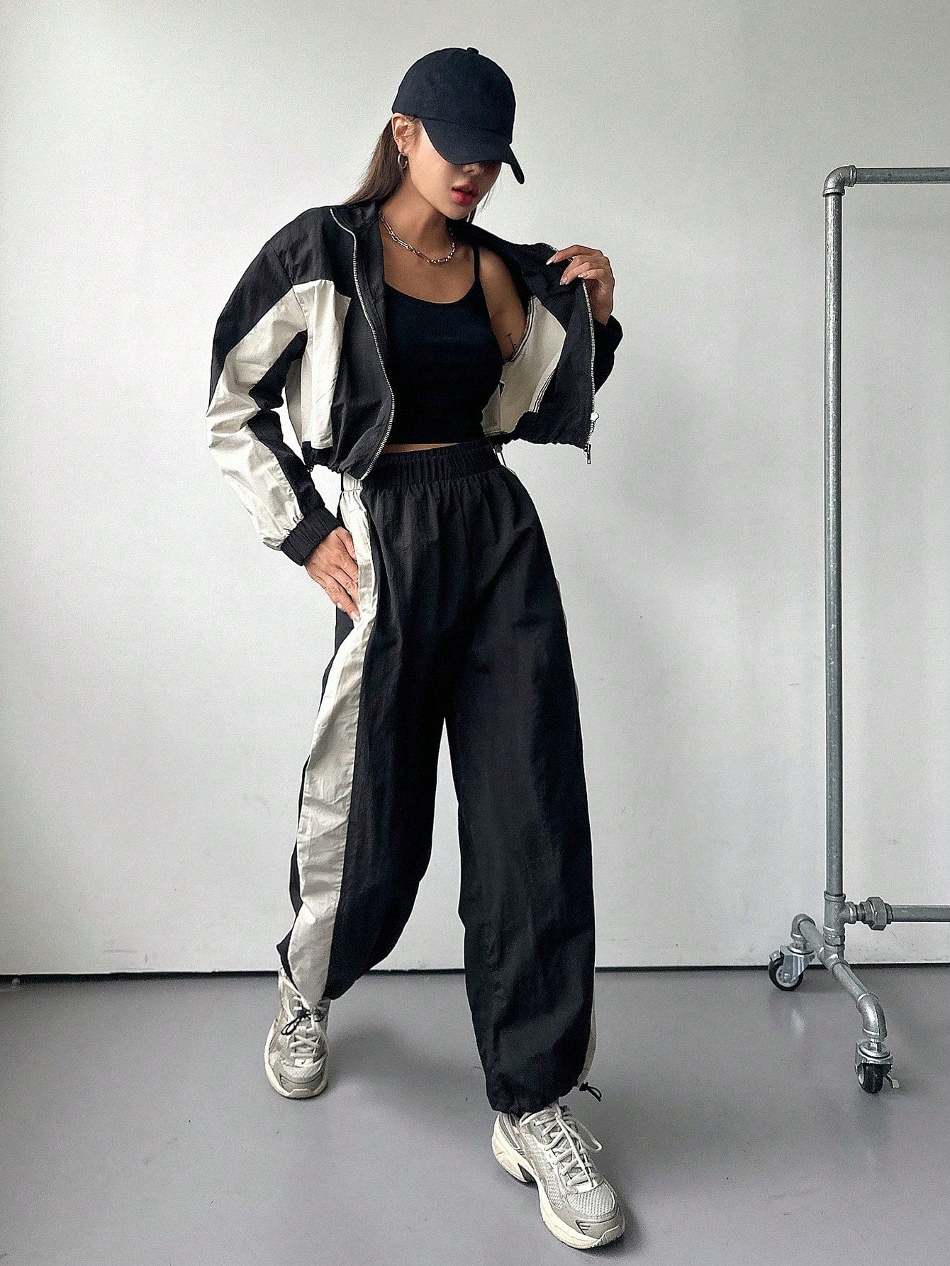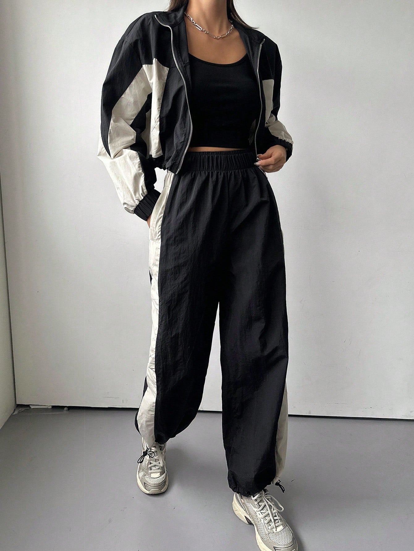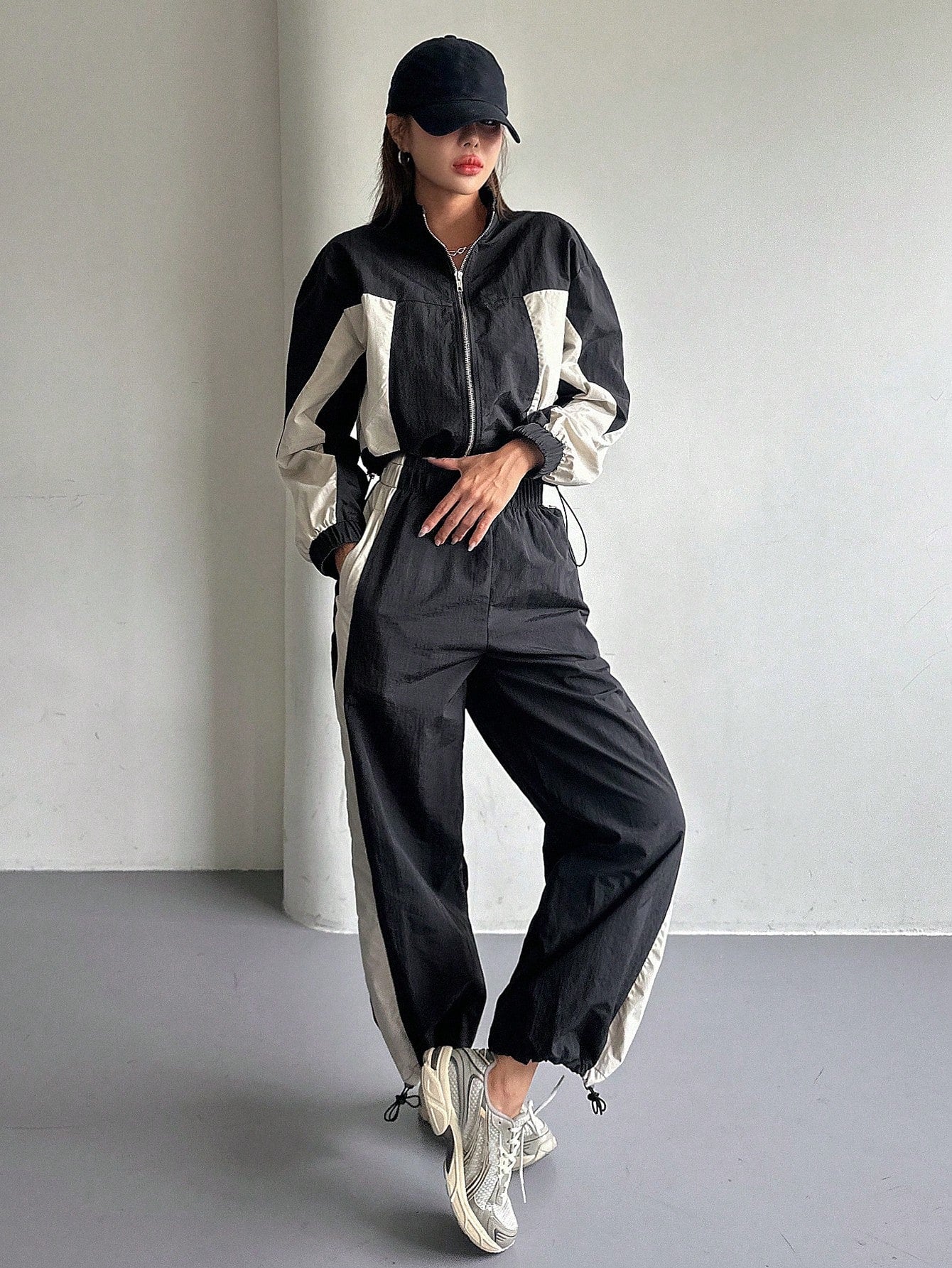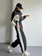 طقم نسائي من قطعتين من DAZY، بتصميم ألوان متناقضة، يتكون من جاكيت بأكمام طويلة وسحاب أمامي برباط، وبنطال.