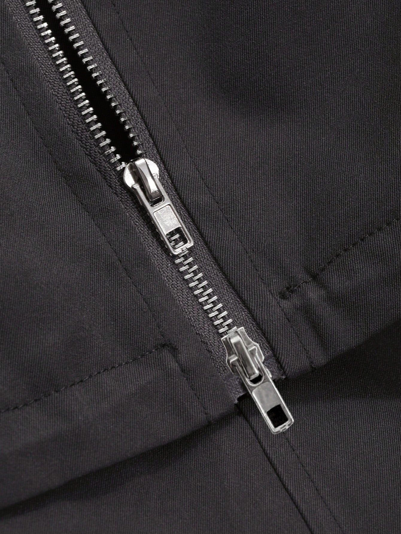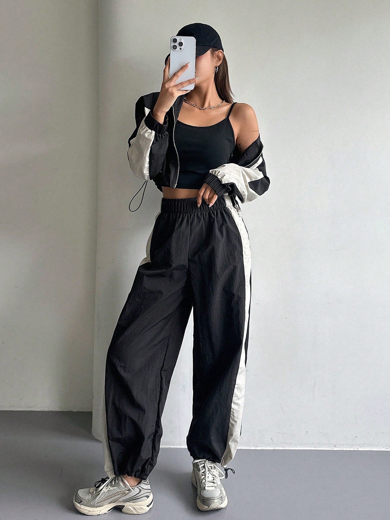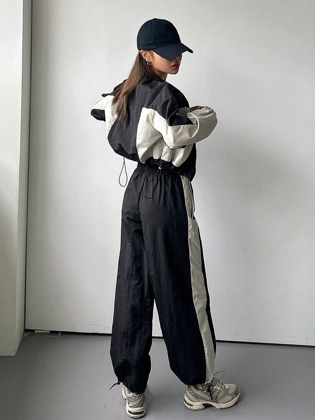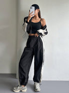 طقم نسائي من قطعتين من DAZY، بتصميم ألوان متناقضة، يتكون من جاكيت بأكمام طويلة وسحاب أمامي برباط، وبنطال.