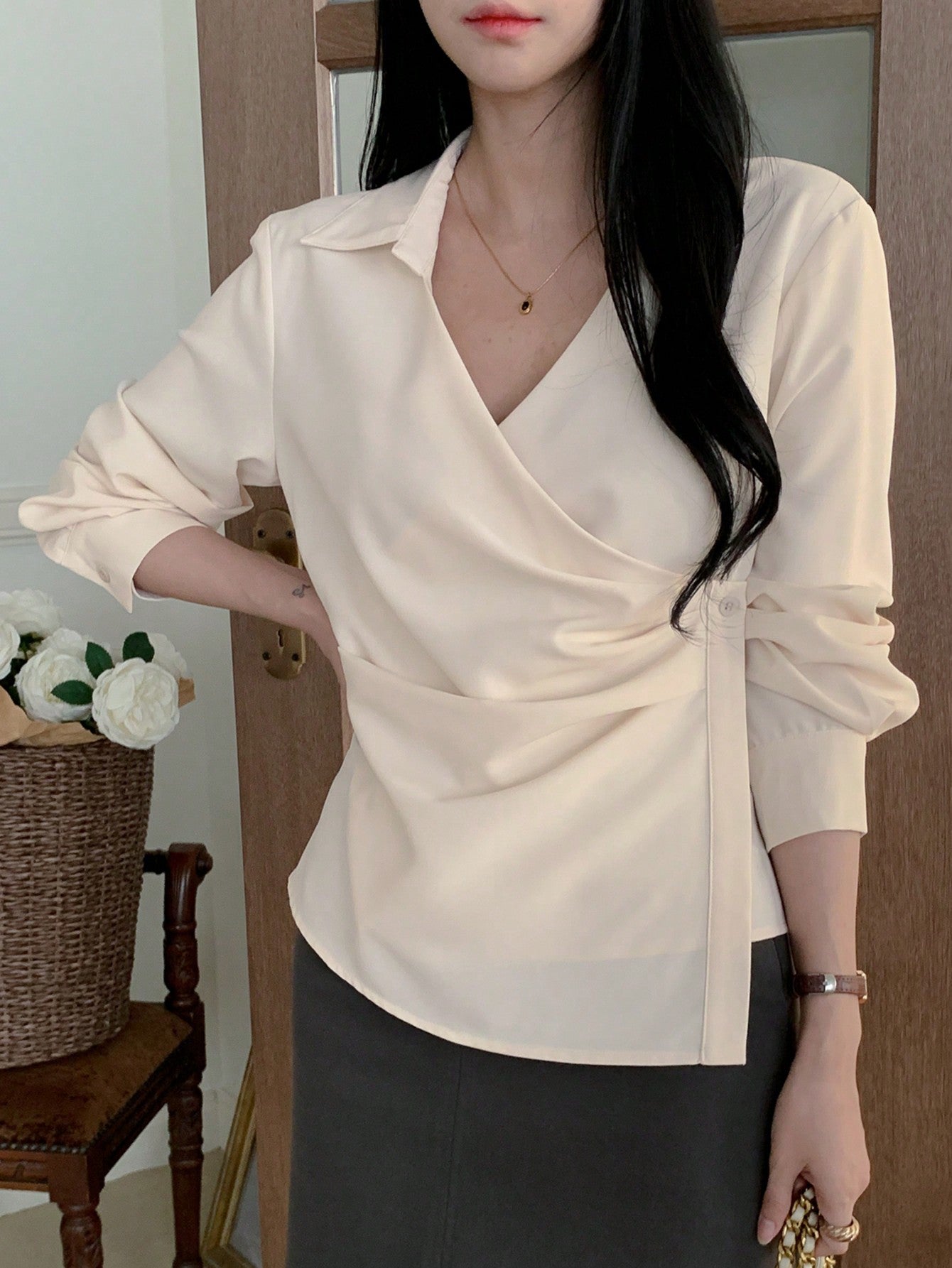 بلوزة DAZY أنيقة كاجوال ربيعية/صيفية بأكمام طويلة وخصر مطوي بلون واحد للنساء