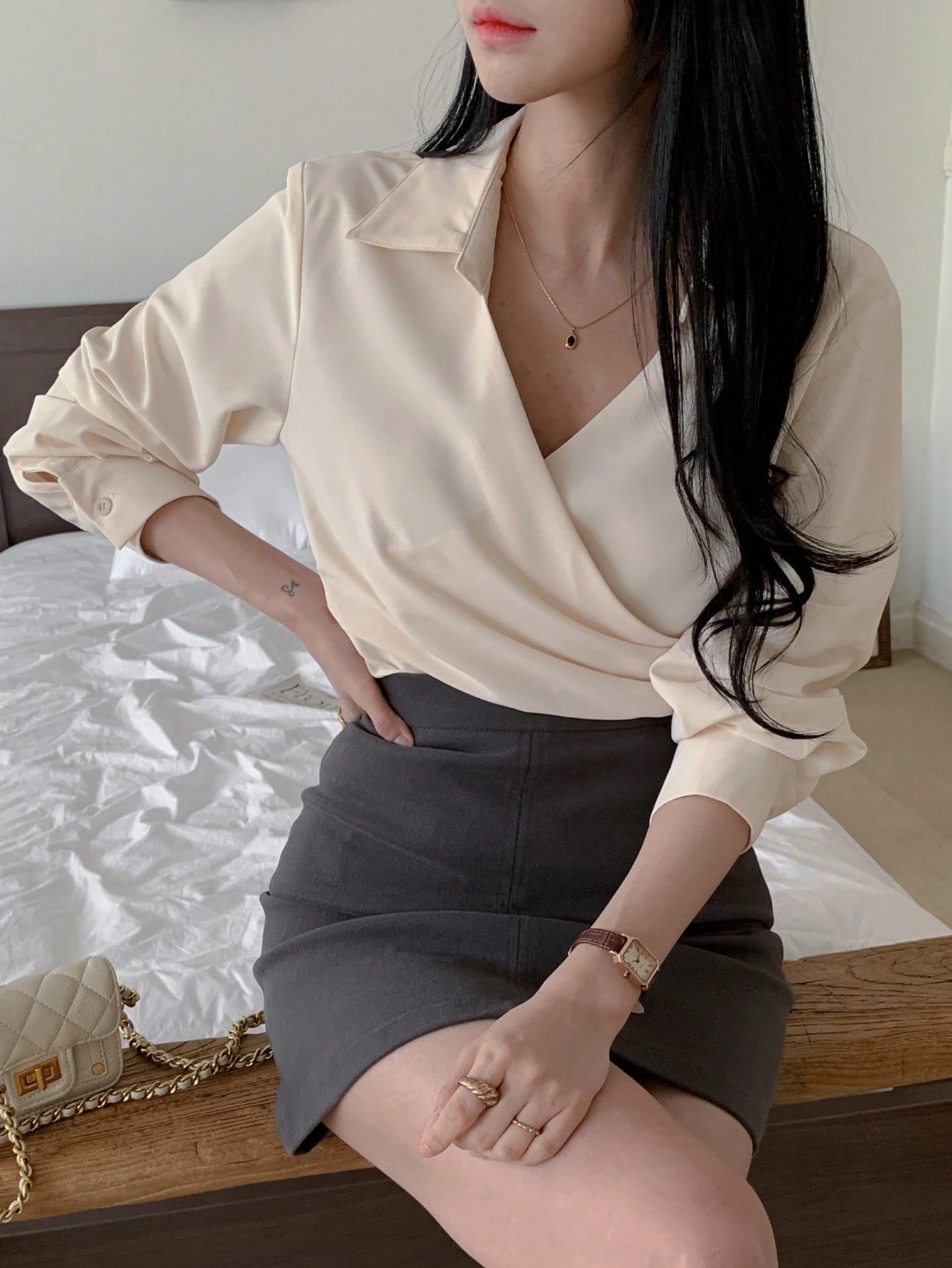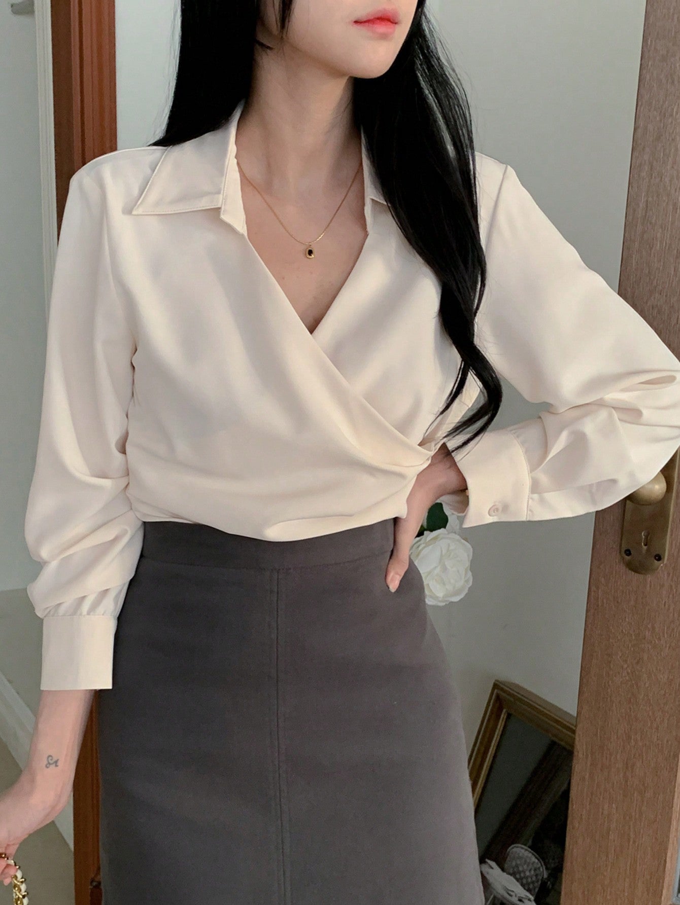 DAZY Elegant Commuting Casual Spring/Summer Solid Color Fitted Long Sleeve Pleated Waist Blouse For Women