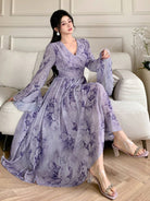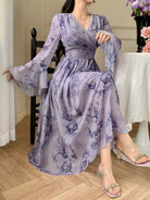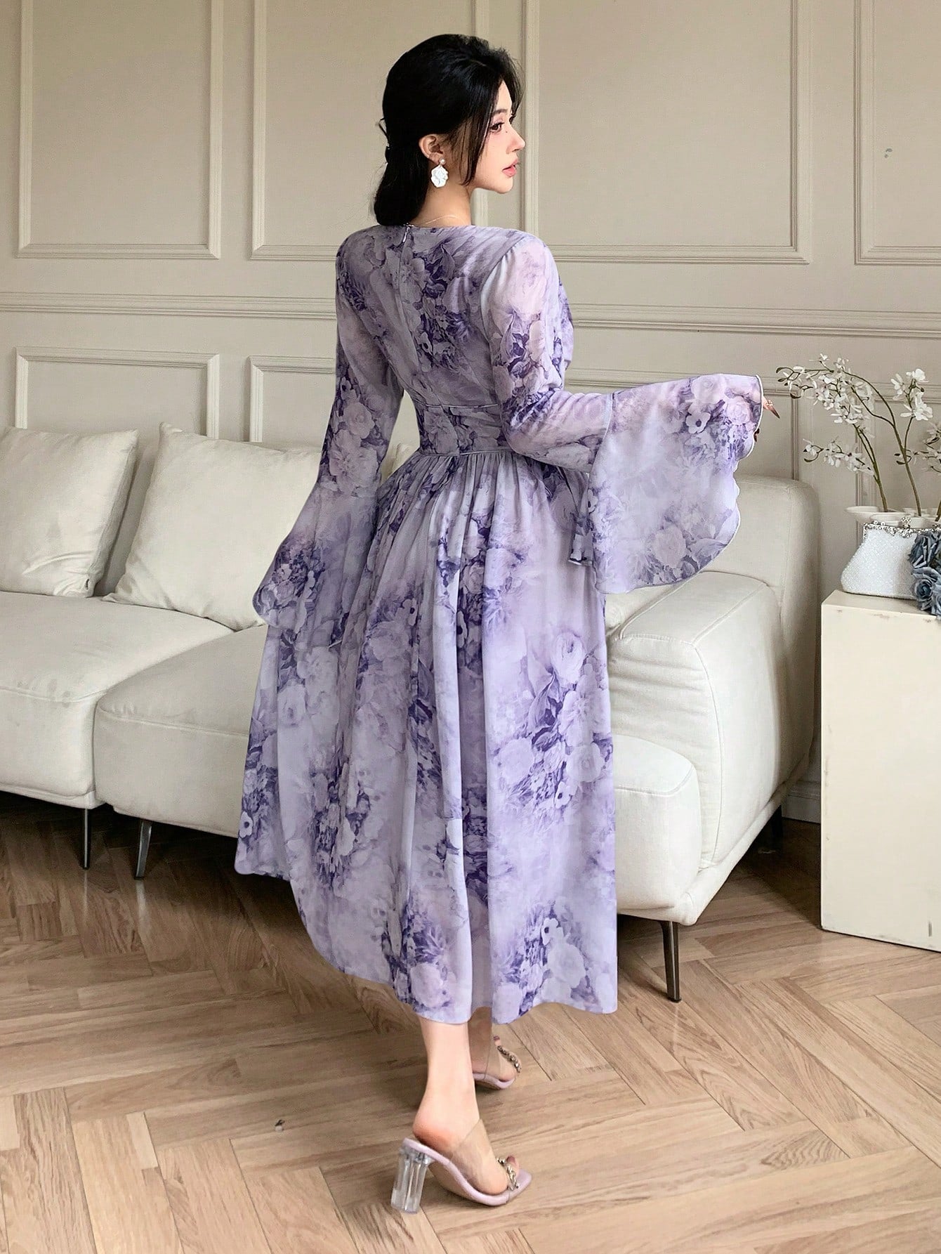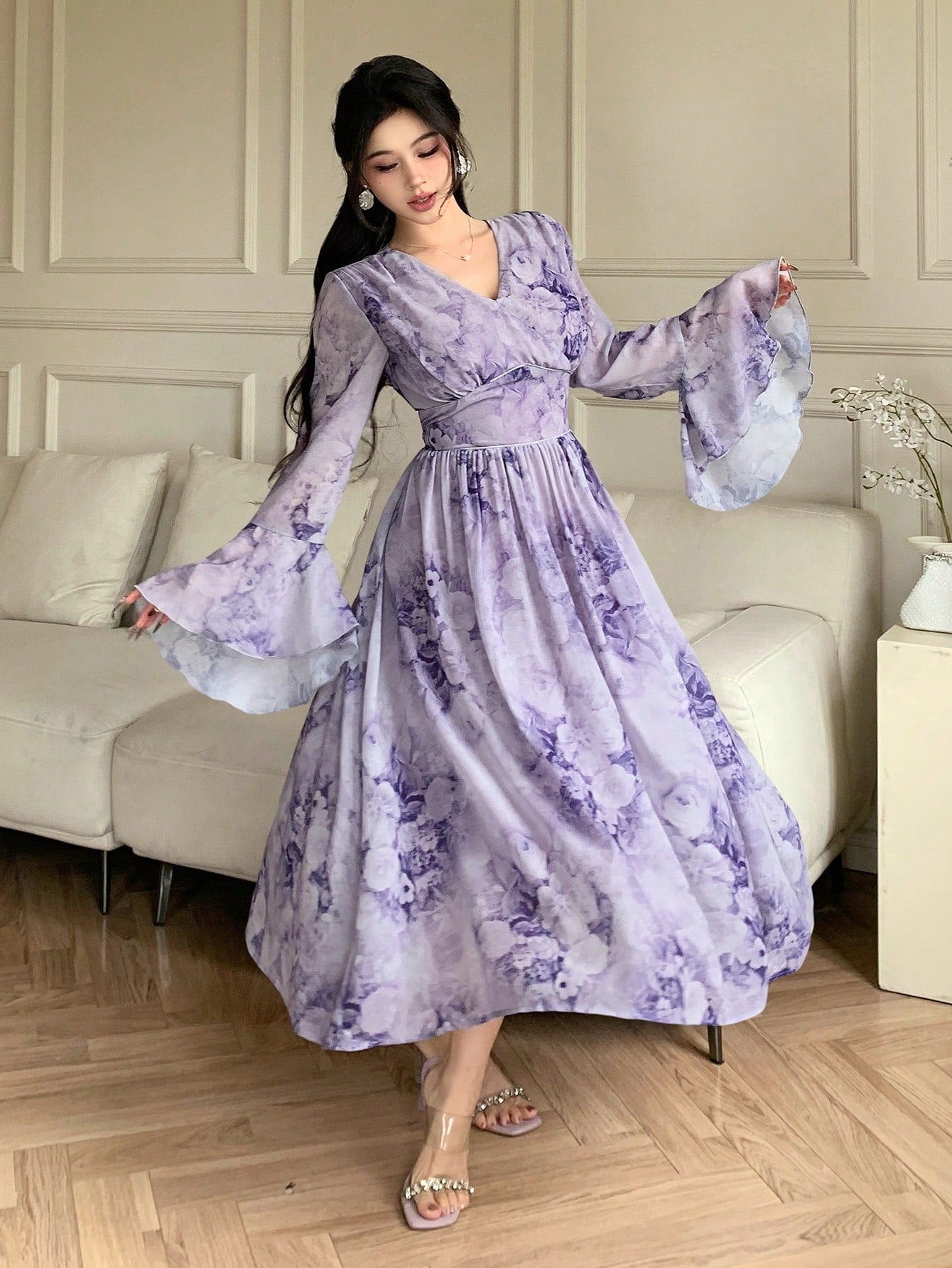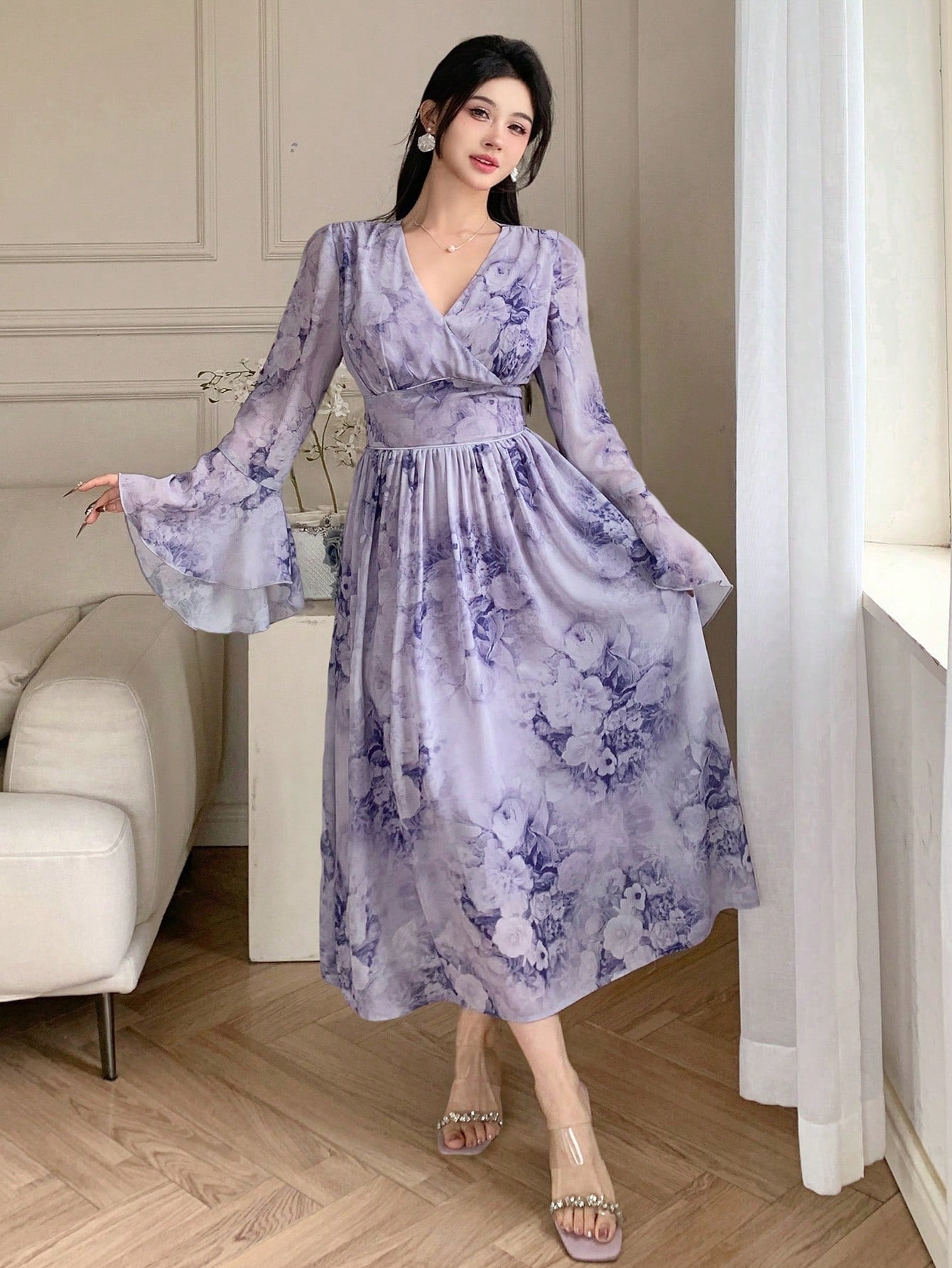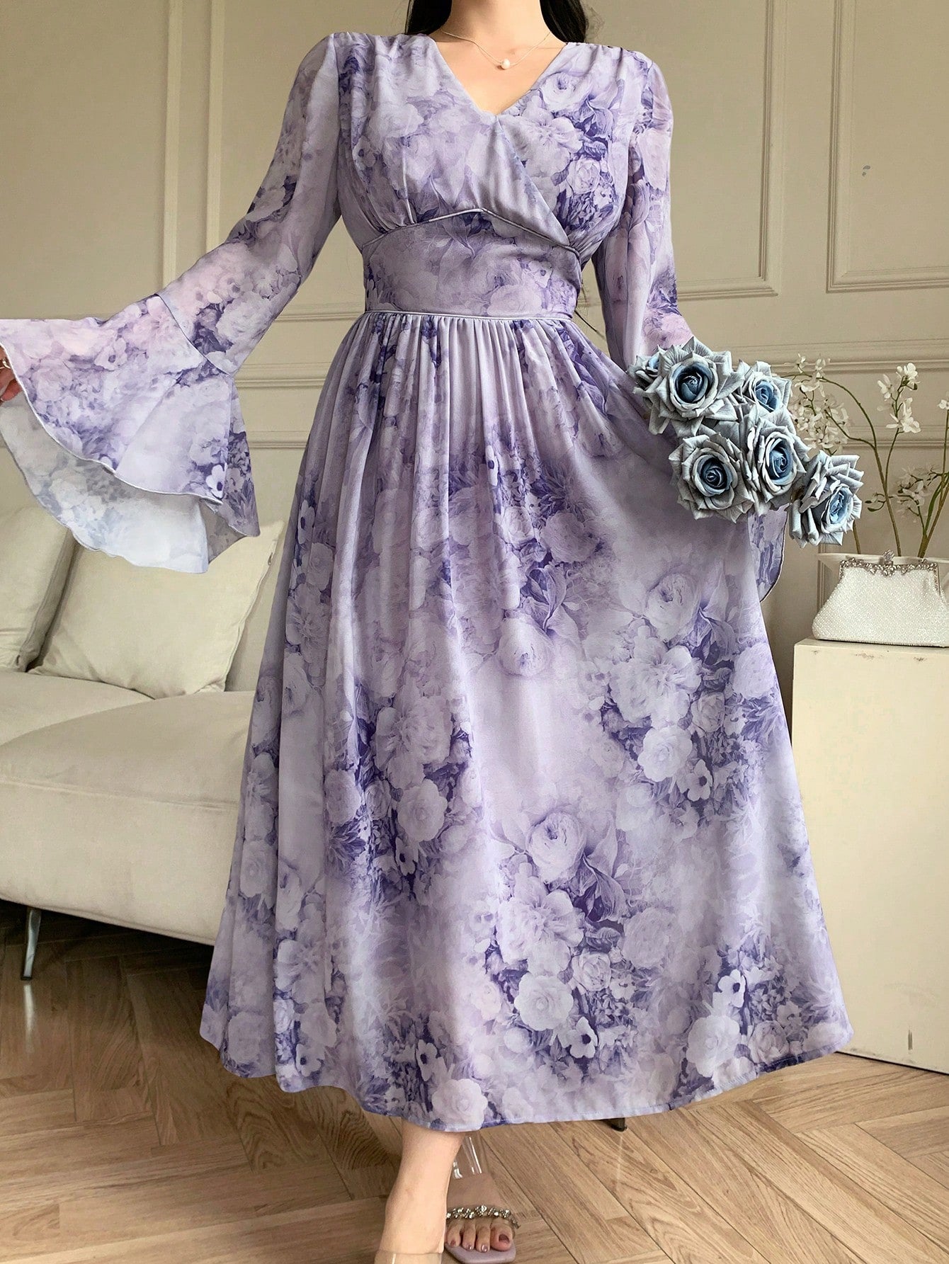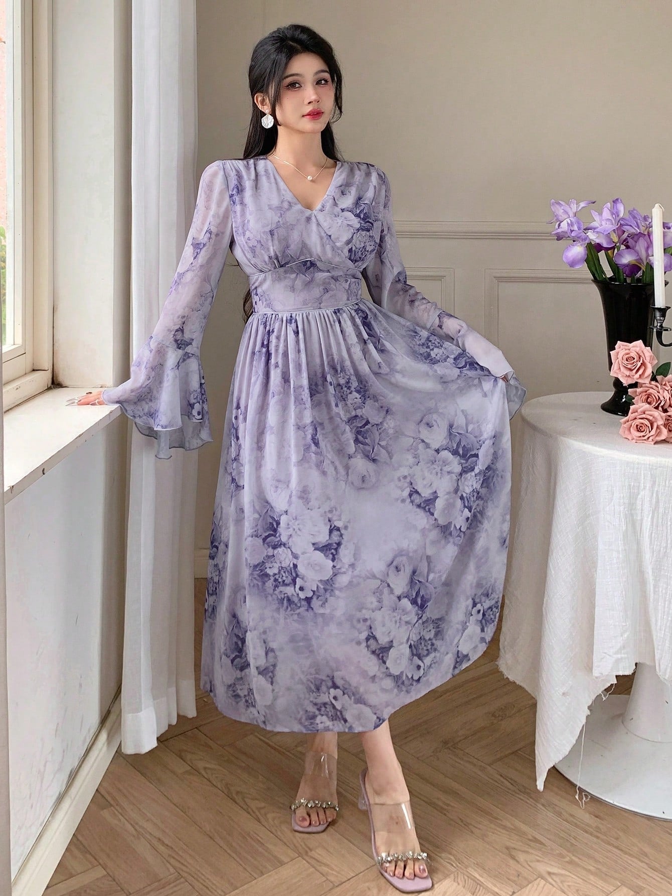 DAZY V-Neck Floral Print Midi Ruffled Hem Dress For Women Elegant,Fall Dress Long Sleeve Dress