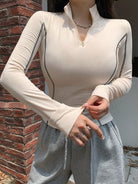 تي شيرت نسائي من DAZY برقبة دائرية وأكمام طويلة وسحاب جزئي مع خط مزخرف، تي شيرت بقصة ضيقة