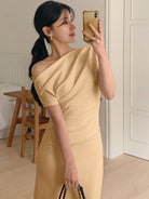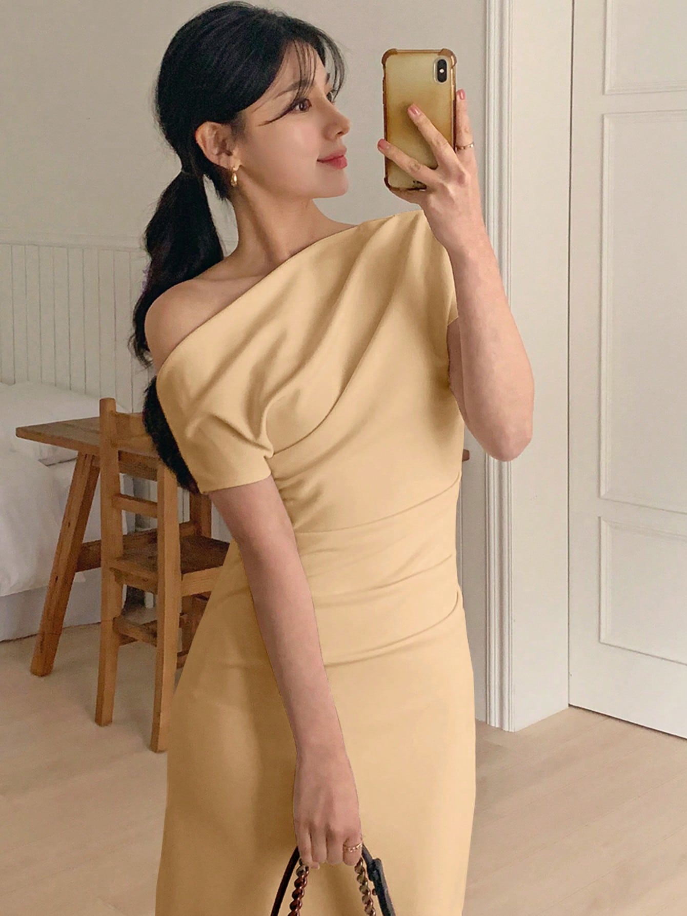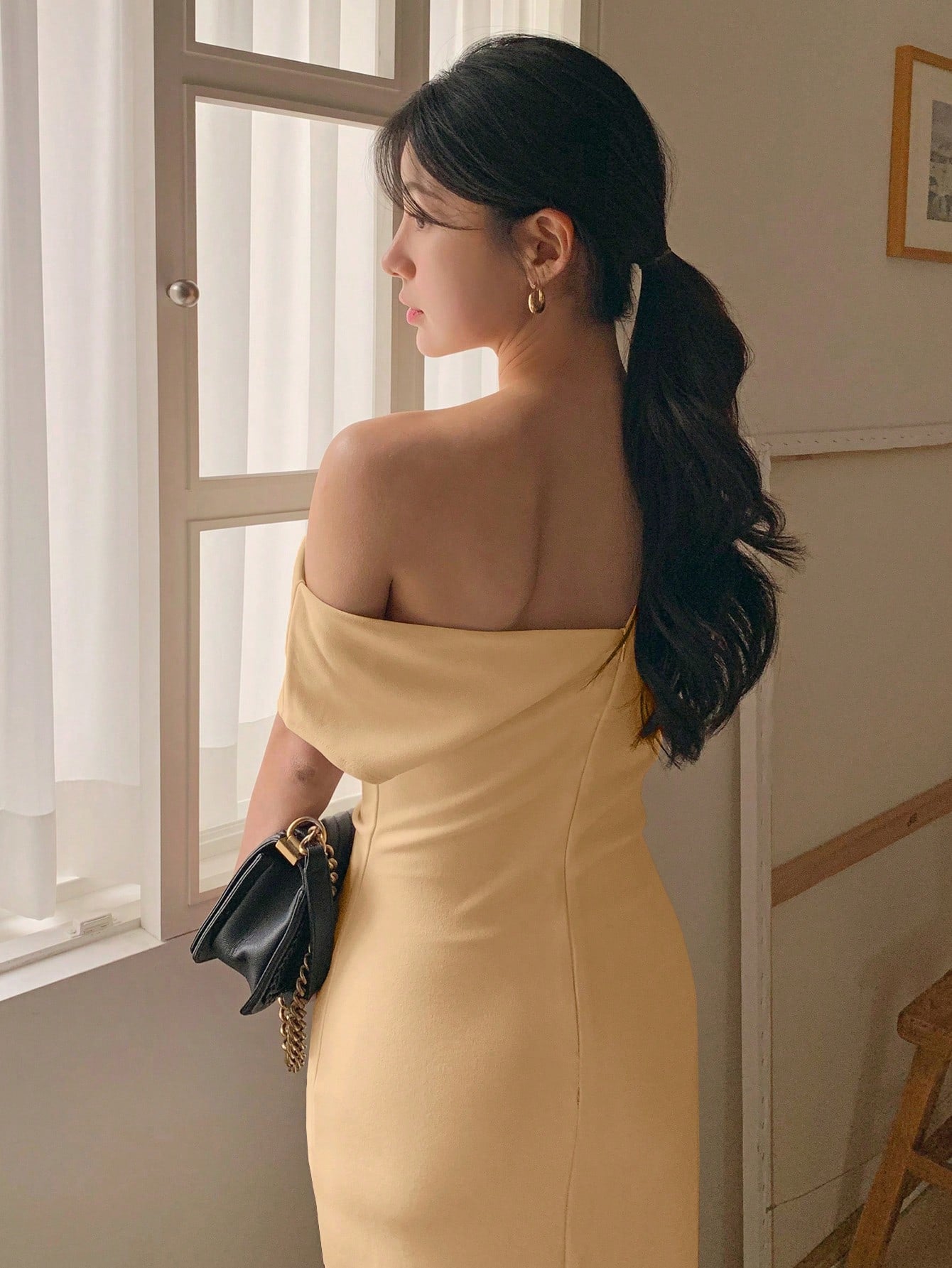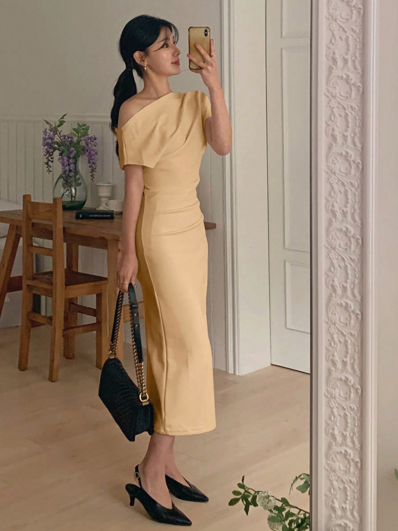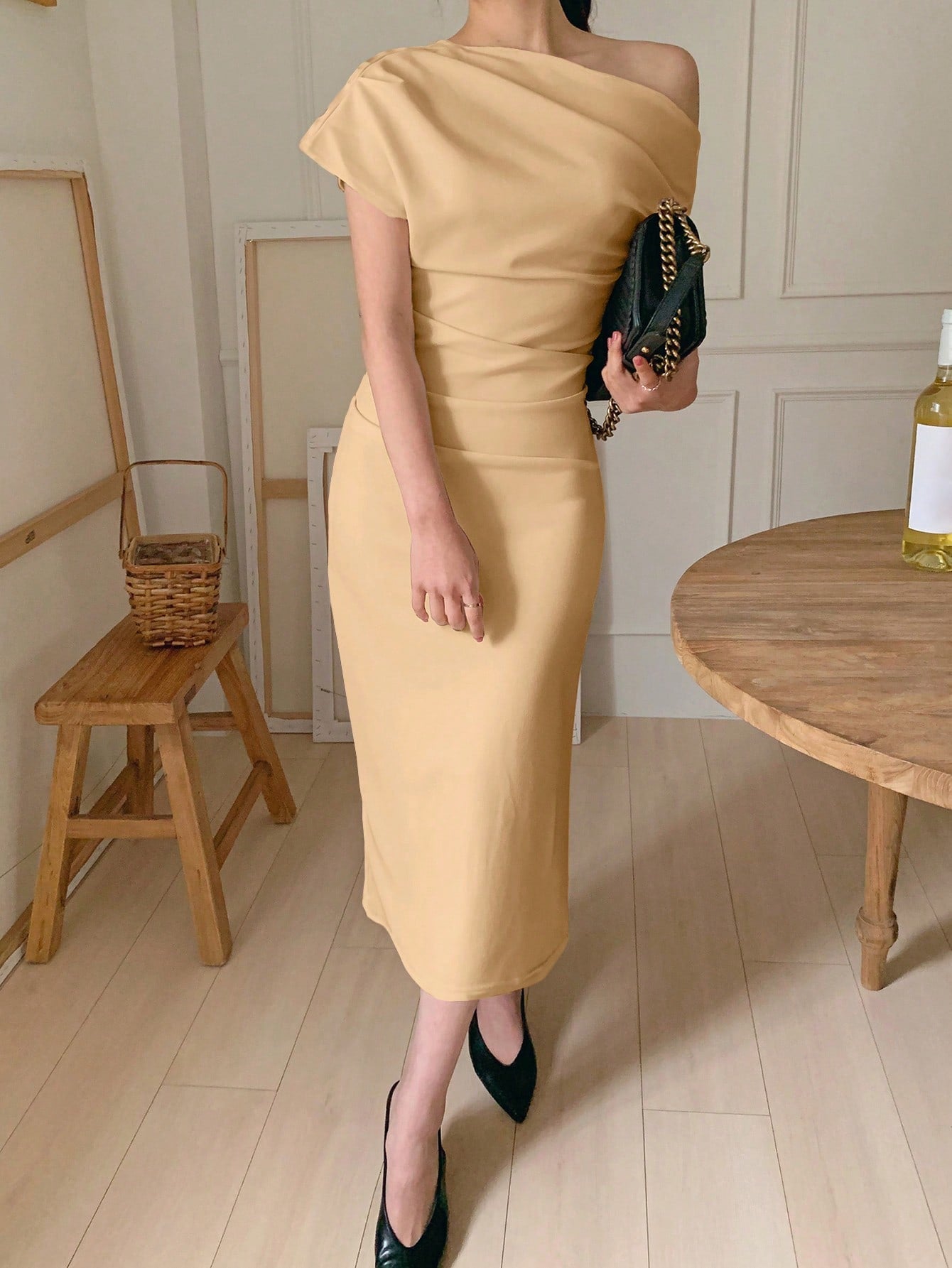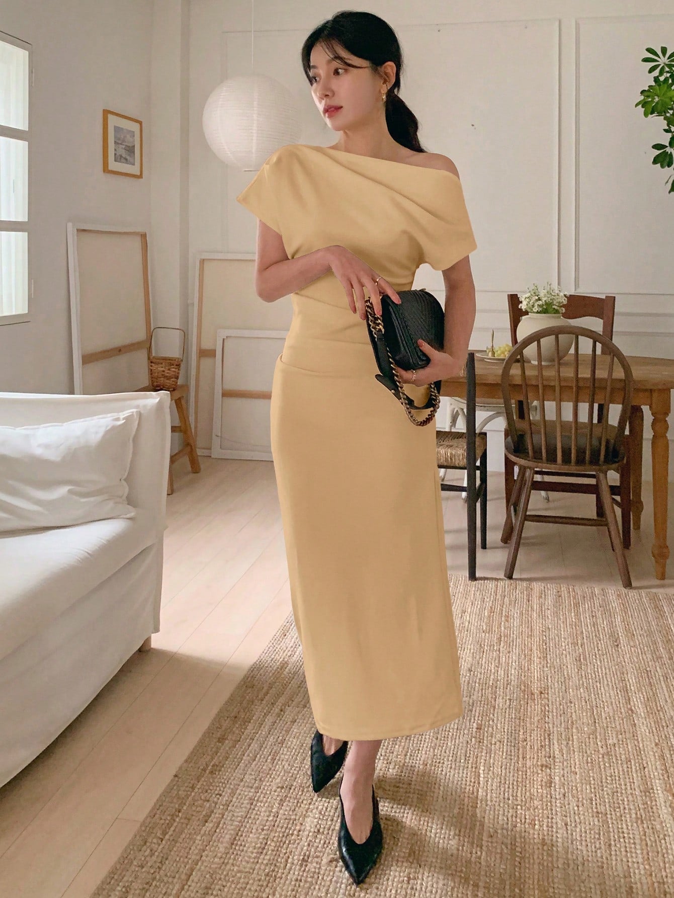 women DAZY Women's Solid Color Oblique Shoulder Waist-Cinched Midi Dress