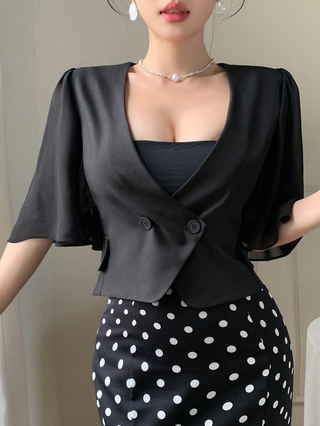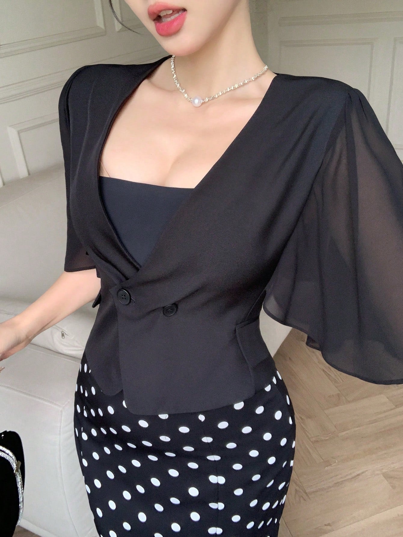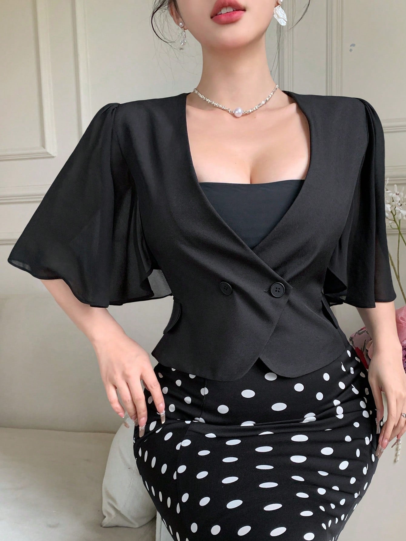 جاكيت بليزر نسائي من DAZY بأكمام قصيرة ورقبة على شكل حرف V من الشيفون المرقعة، بتصميم أنيق، بدلة خفيفة الوزن