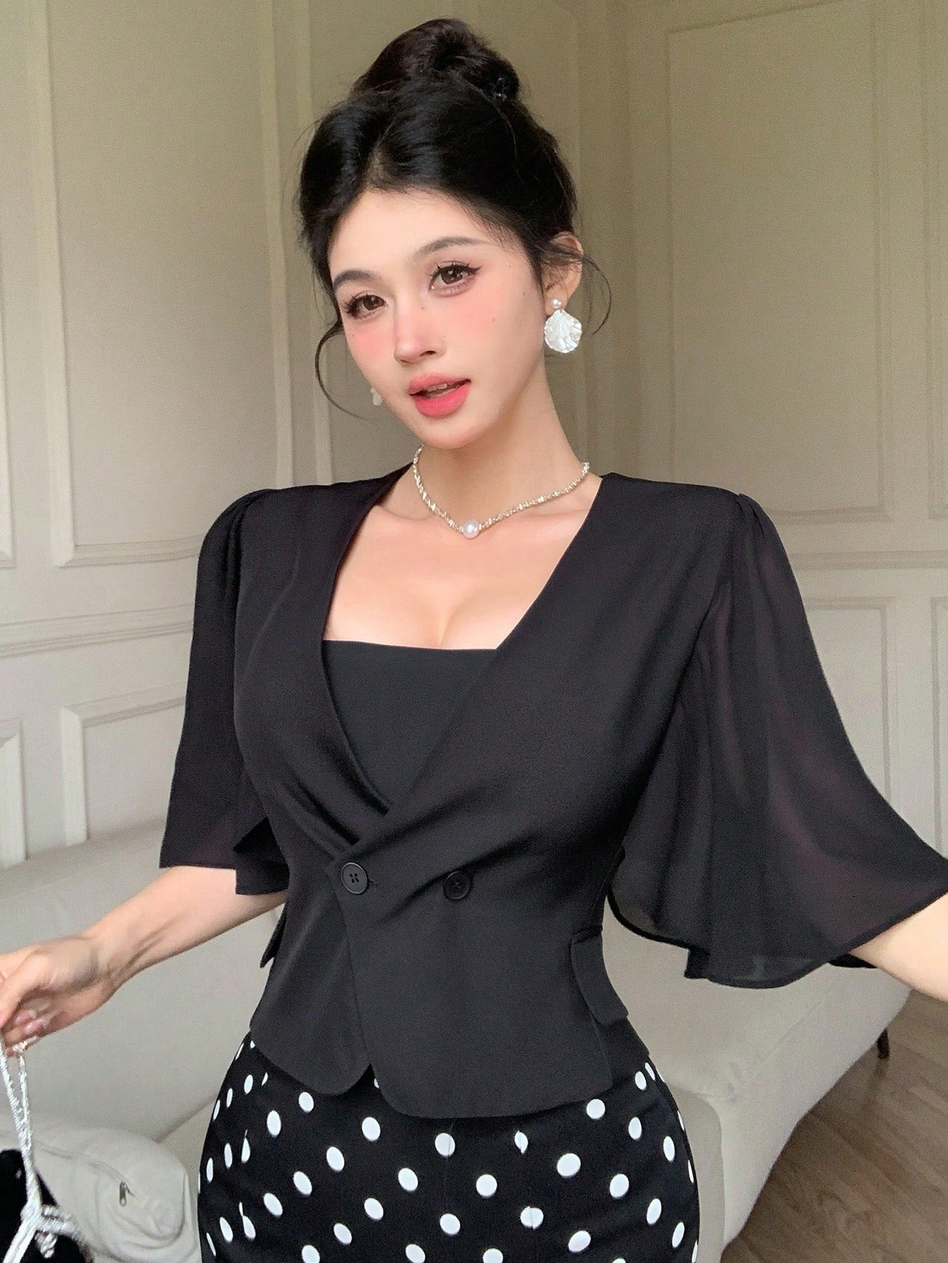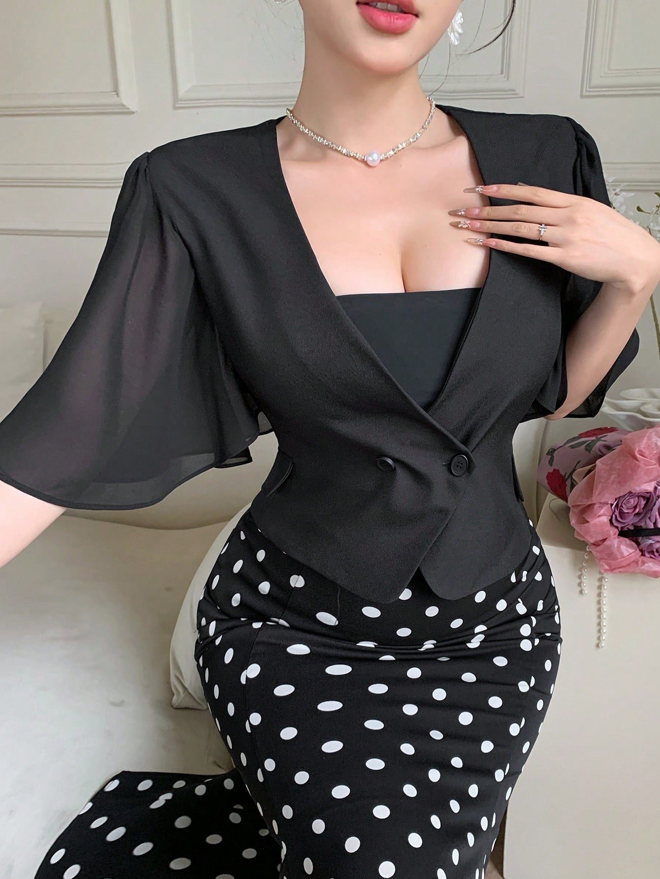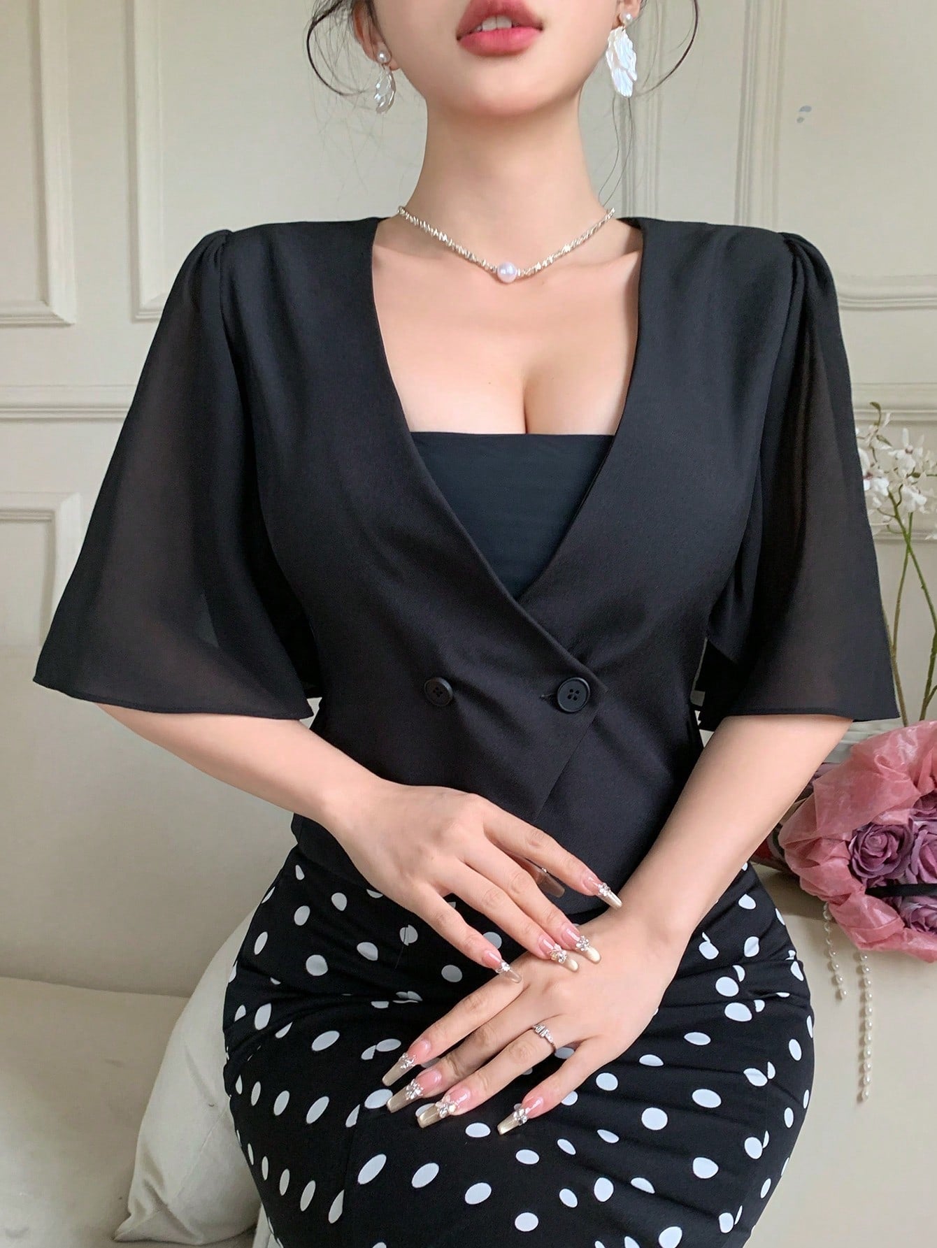 جاكيت بليزر نسائي من DAZY بأكمام قصيرة ورقبة على شكل حرف V من الشيفون المرقعة، بتصميم أنيق، بدلة خفيفة الوزن