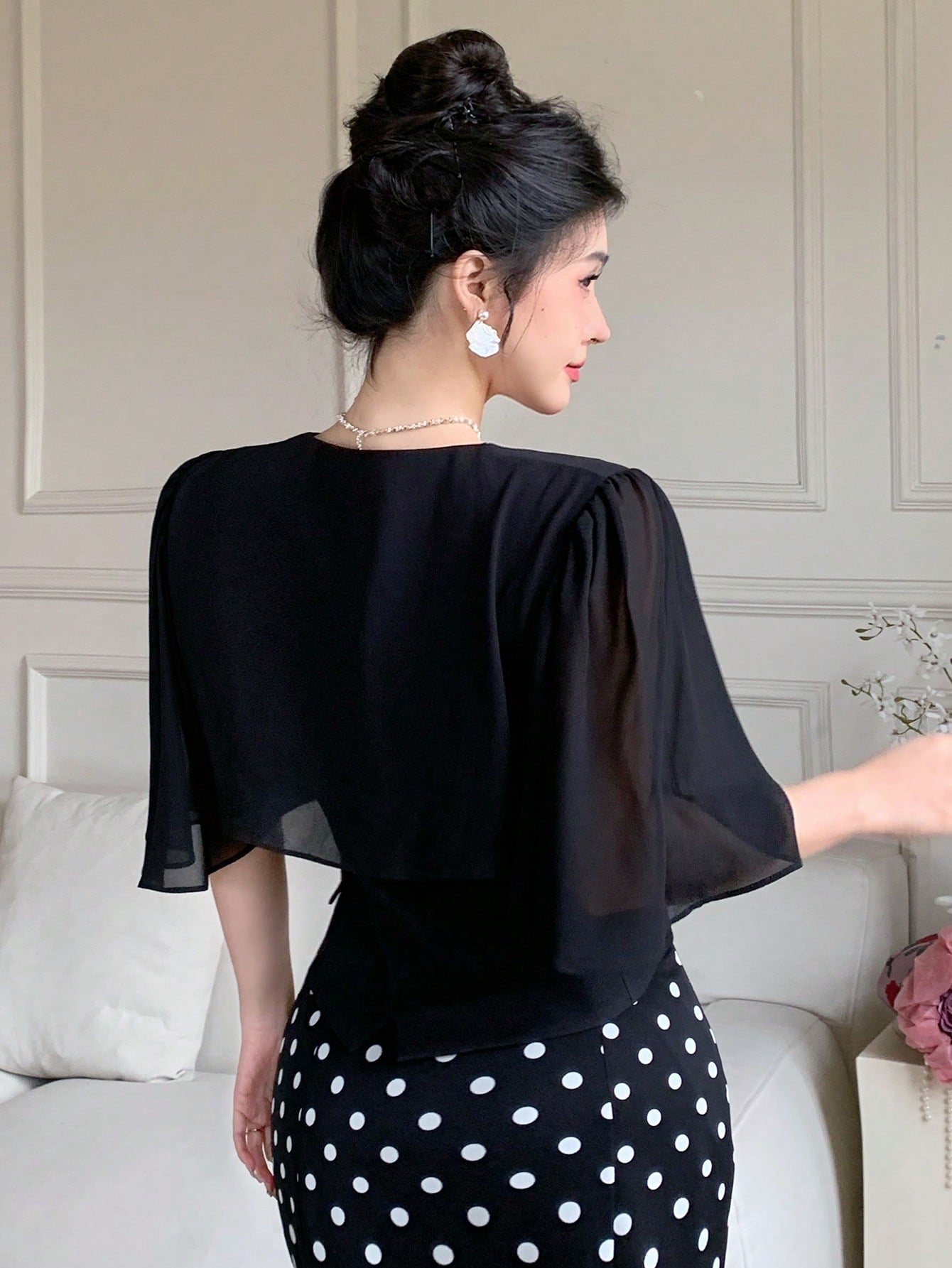 DAZY Women's V-Neck Chiffon Patchwork Short Sleeve Blazer Jacket, With Style Design, Lightweight Suit