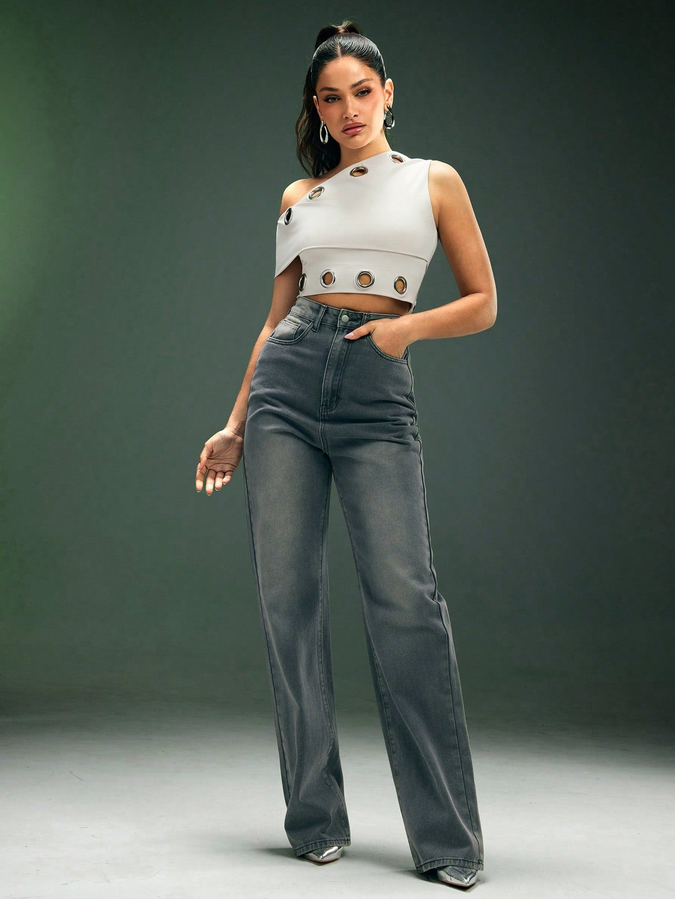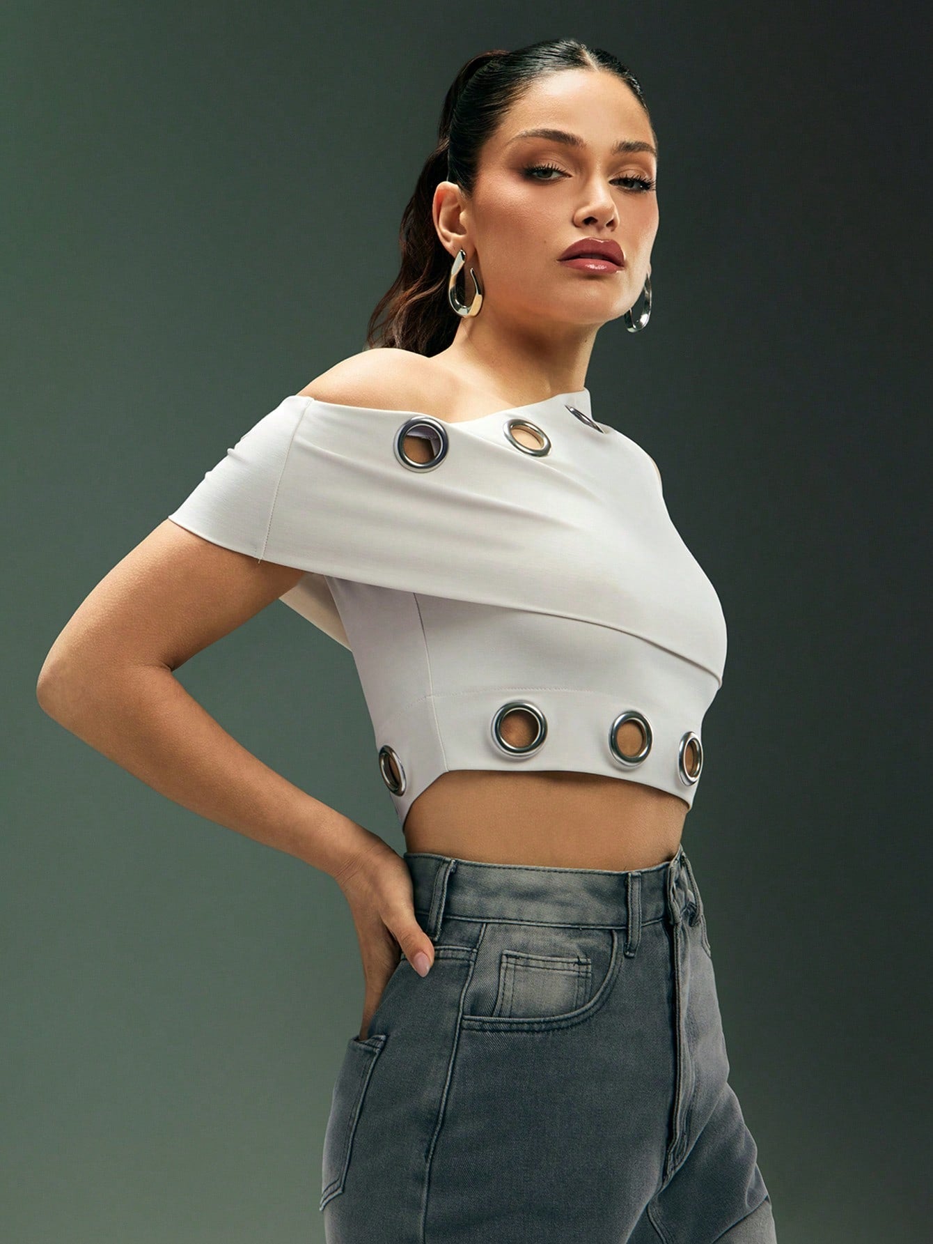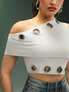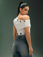 بلوزة قصيرة من دينيموي بتصميم غير متماثل عند الرقبة مع حلقات معدنية